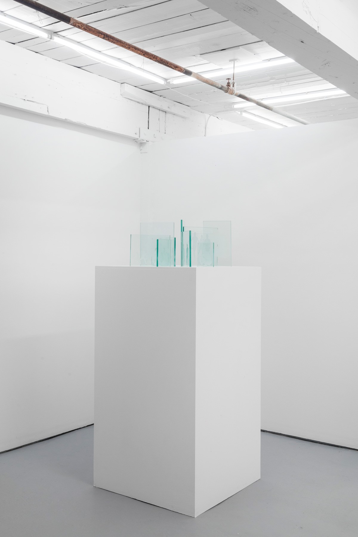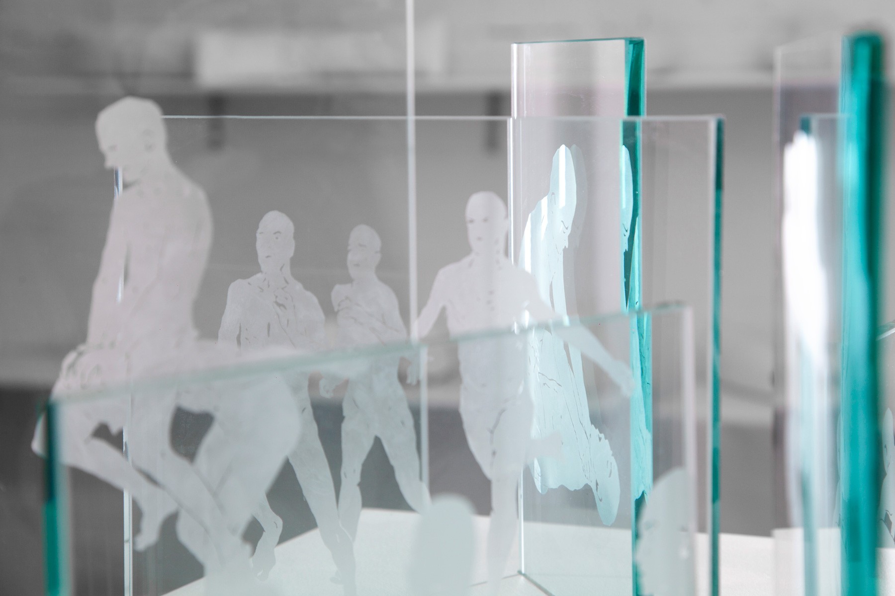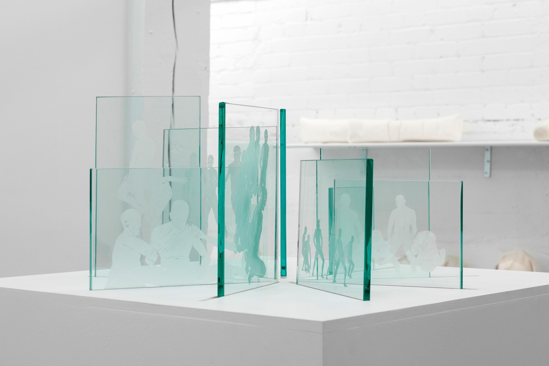 In the front space of the gallery is Joshua Vettivelu’s sculpture there is no difference between nothing and everything when the distance you have built to cope becomes the world. Composed of 9 separate drawings etched on glass, the images depict men in the throes of various activities. Oscillating back and forth between intimacy and violence, the drawings reveal a darker side of masculinity – one in which men are encouraged to kill off parts of themselves in order to be recognized as men.