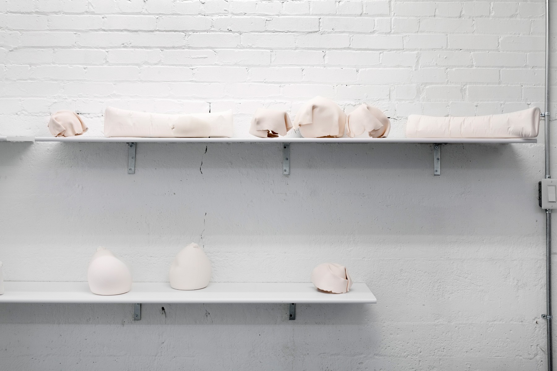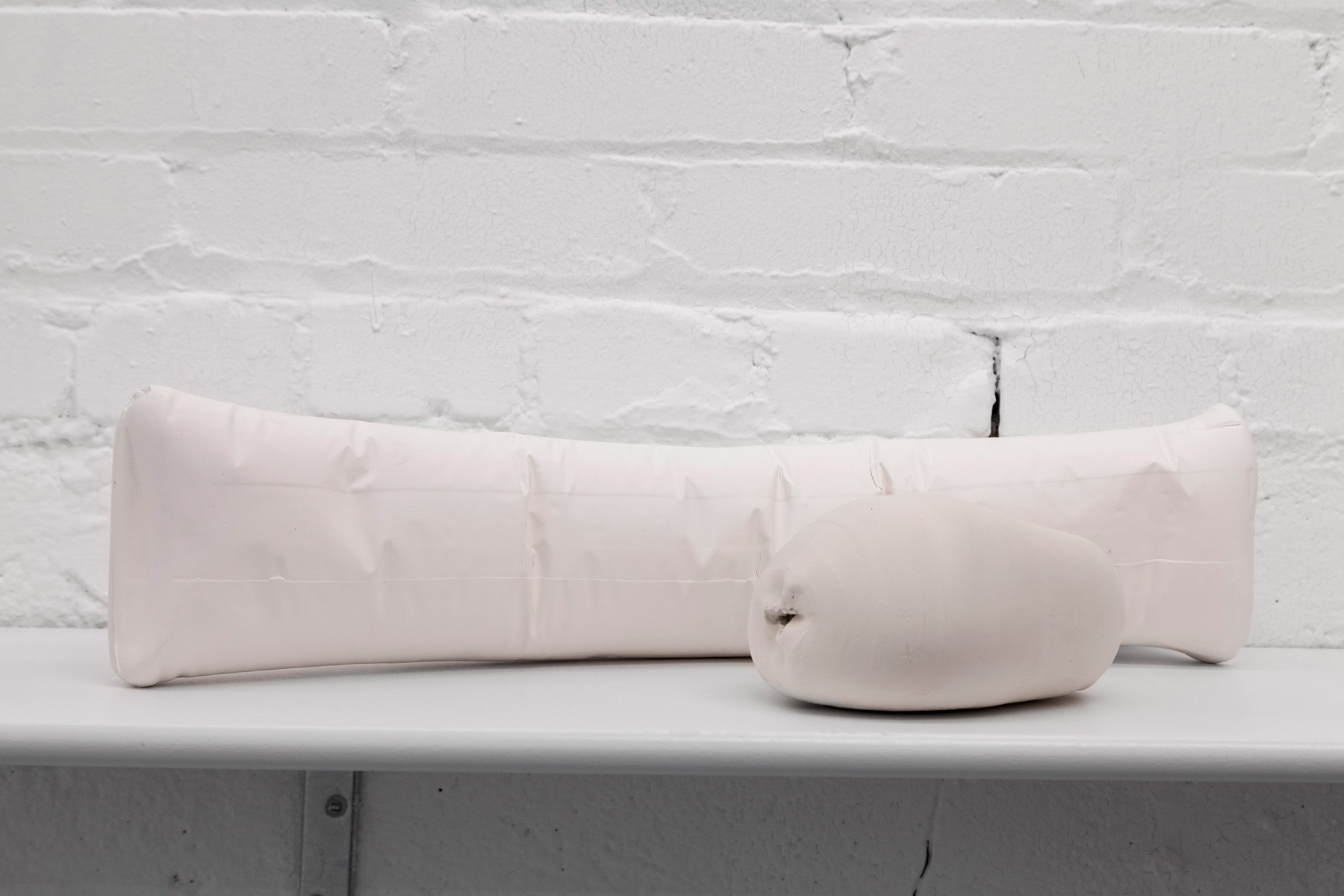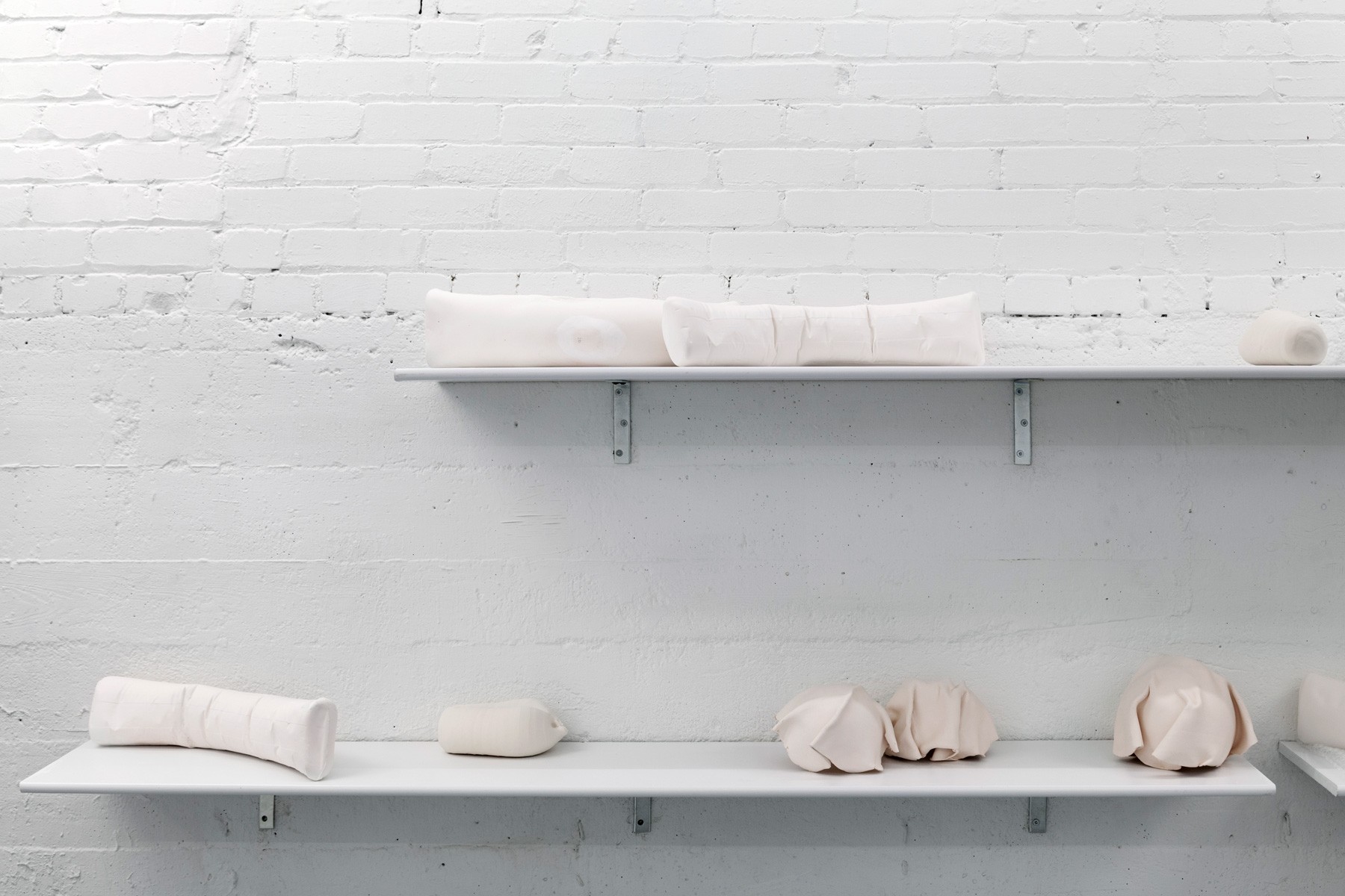 Running across the galleries east wall is Sameer Farooq’s installation Pouf, Sausage, Weight, Arc. These hand shaped ceramic sculptures mimic the forms of the protective and packing materials found in the backrooms of many museums. Acting as stand-ins for what is often edited out or left unseen, these objects highlight important questions regarding representation, inclusion, and what is omitted when we speak of “history.”