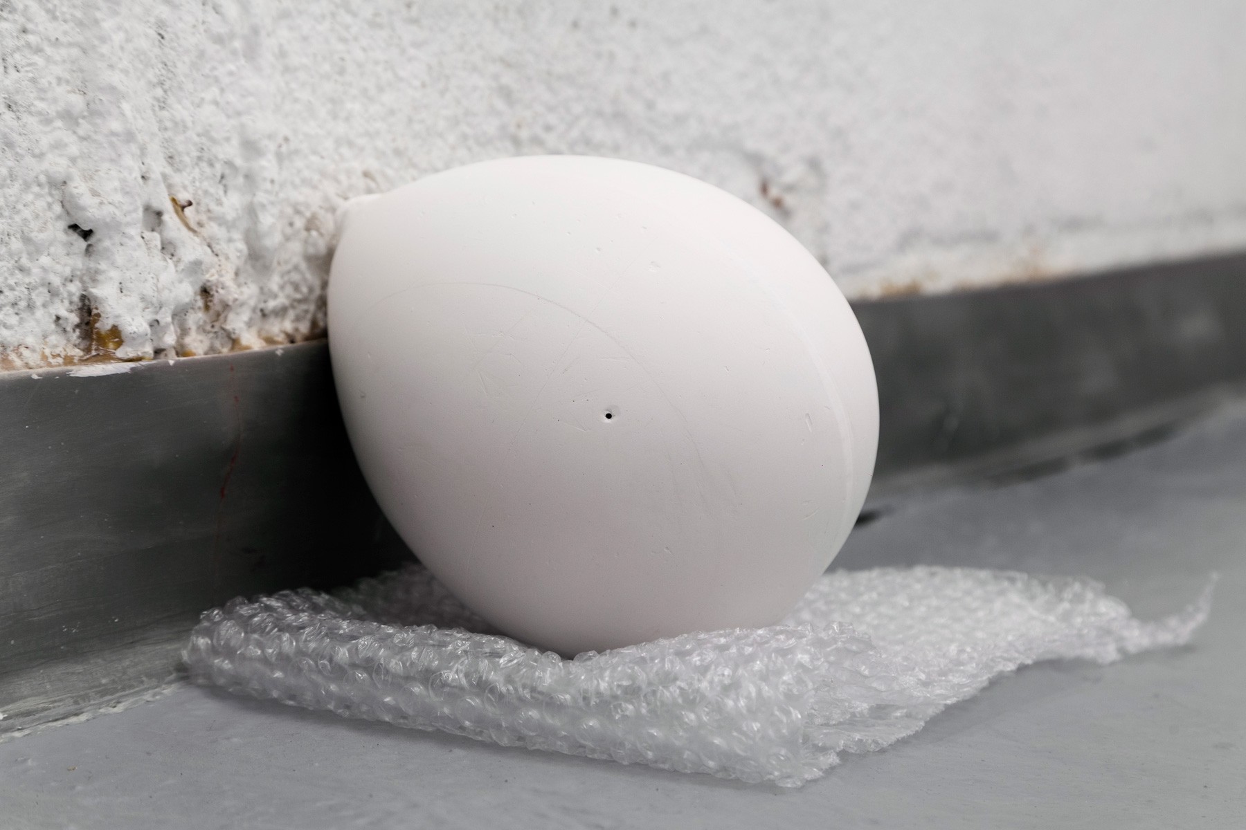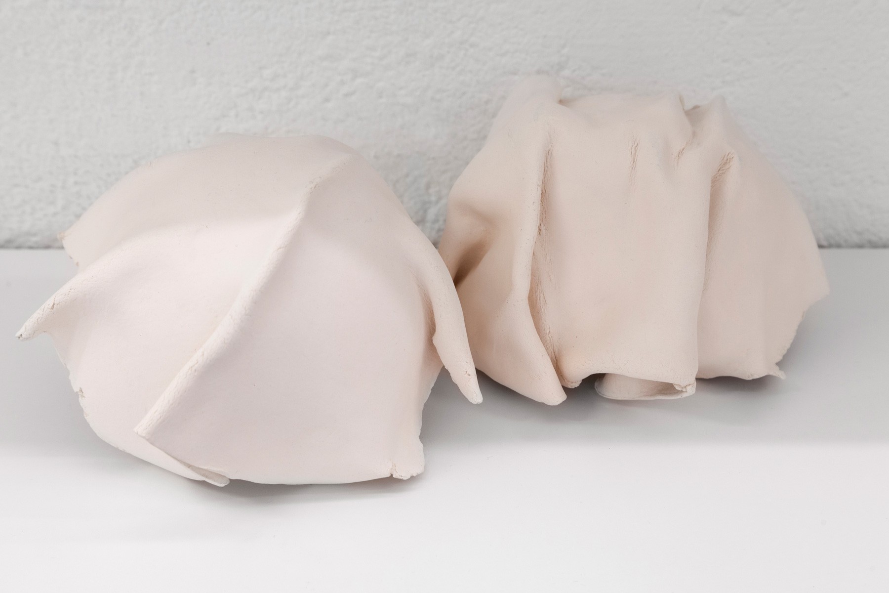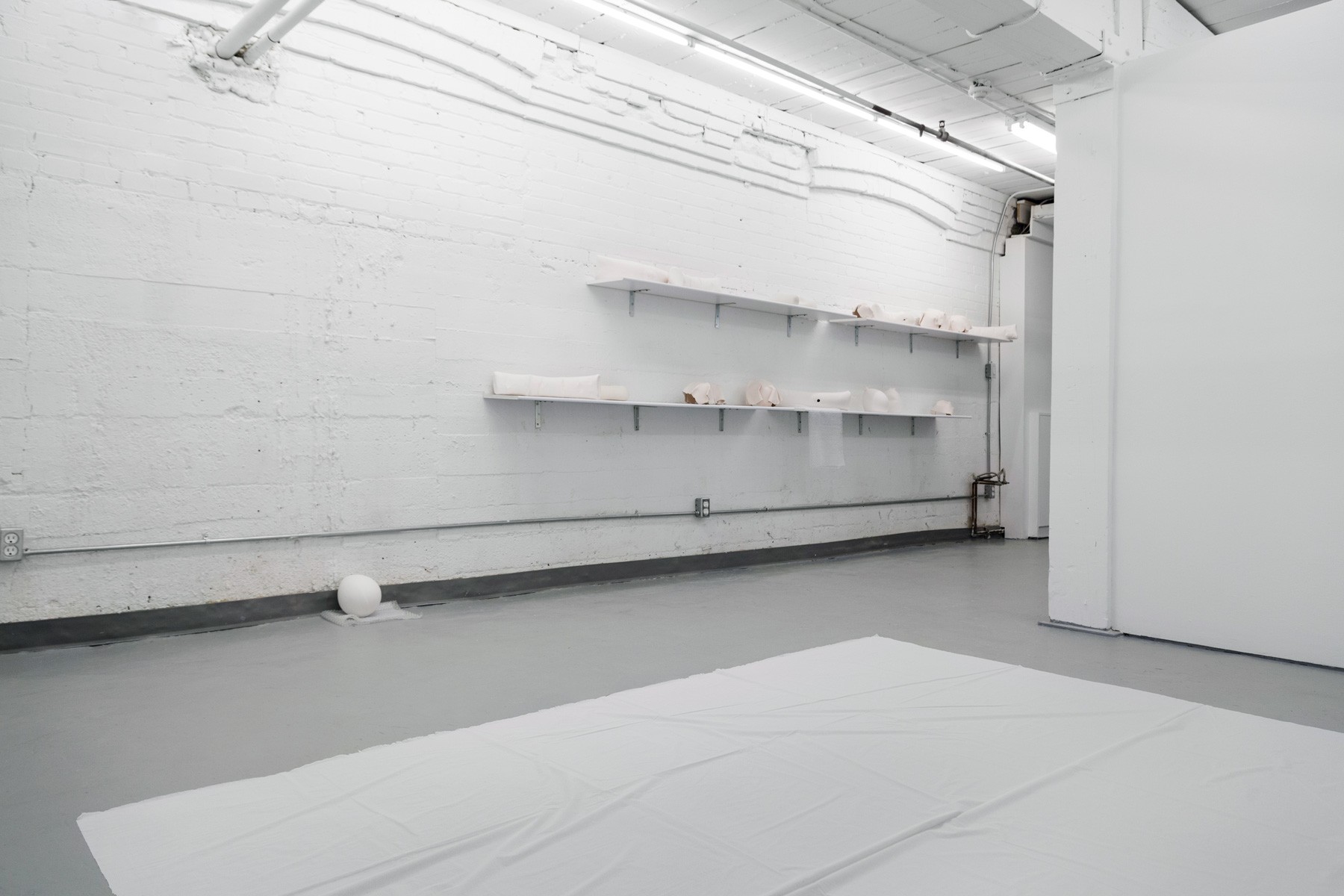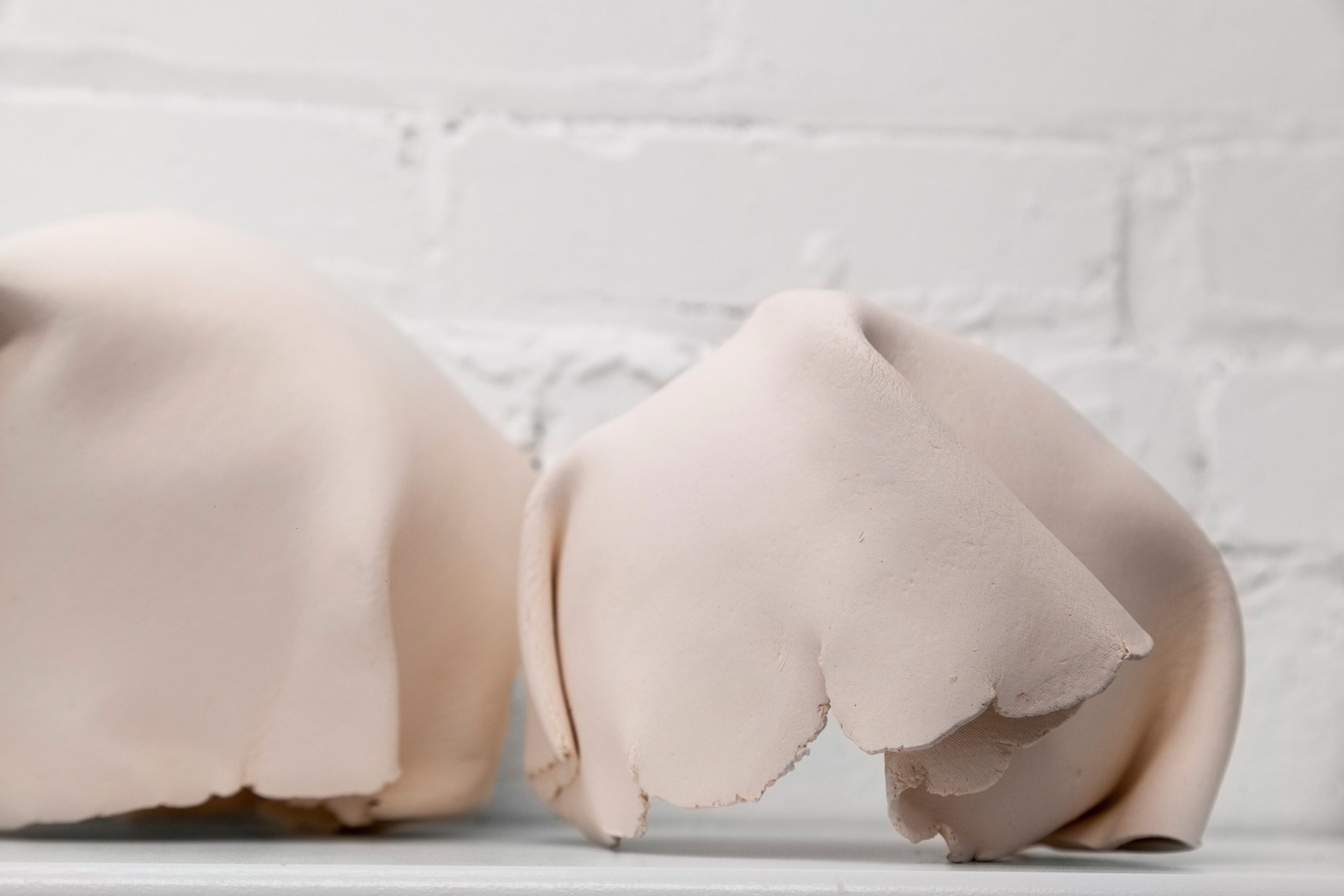 Running across the galleries east wall is Sameer Farooq’s installation Pouf, Sausage, Weight, Arc. These hand shaped ceramic sculptures mimic the forms of the protective and packing materials found in the backrooms of many museums. Acting as stand-ins for what is often edited out or left unseen, these objects highlight important questions regarding representation, inclusion, and what is omitted when we speak of “history.”