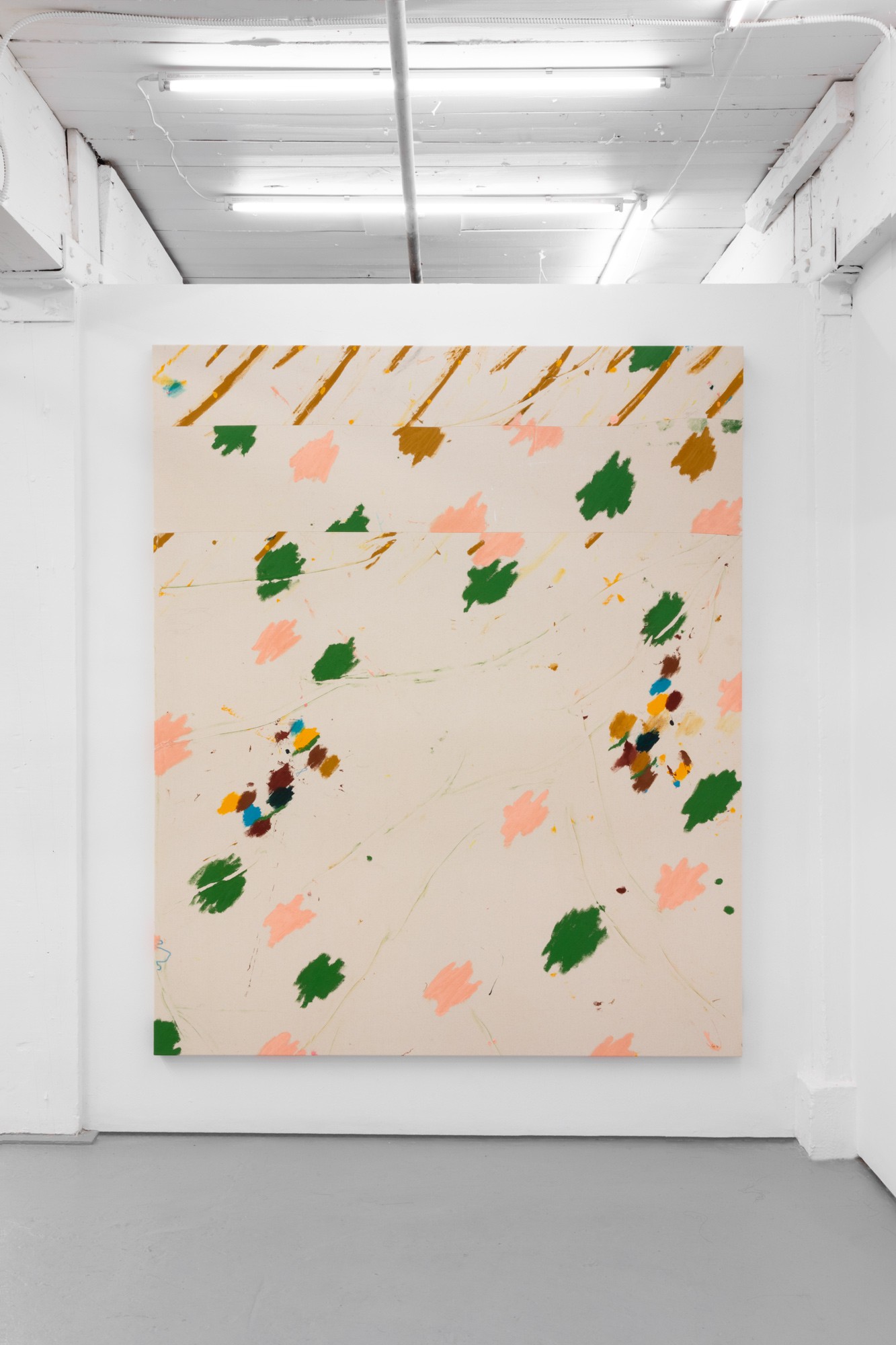 Sarah Cale’s work can be read as an investigation in an intersection of painting and collage. Her layered canvases are built up of “secondhand brushstrokes” where paint is first applied to a temporary surface, allowed to dry, and then re-assembled into highly intricate compositions. This layering creates rich, tactile paintings’ where surface, colour and form oscillate back and forth with one another. Through this process, Cale reconfigures many of paintings long-established concerns — interrogating ideas of materiality, gesture, as well as the pictorial representation of space.