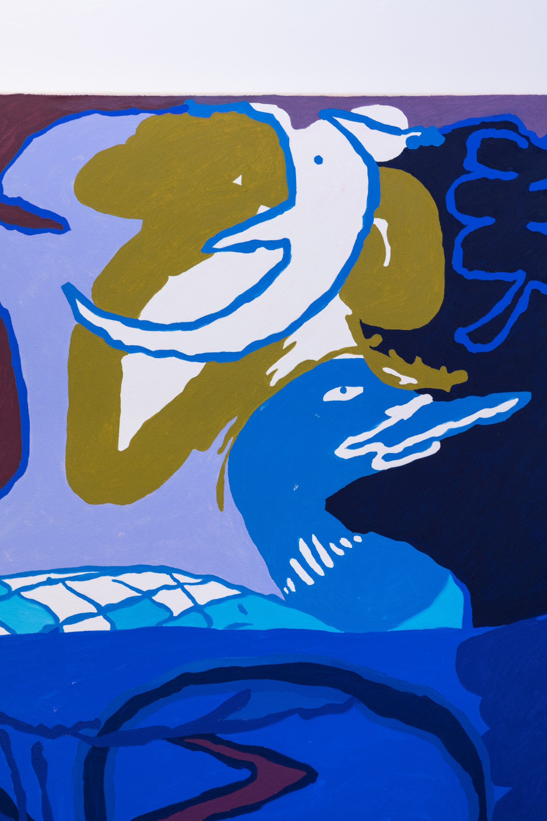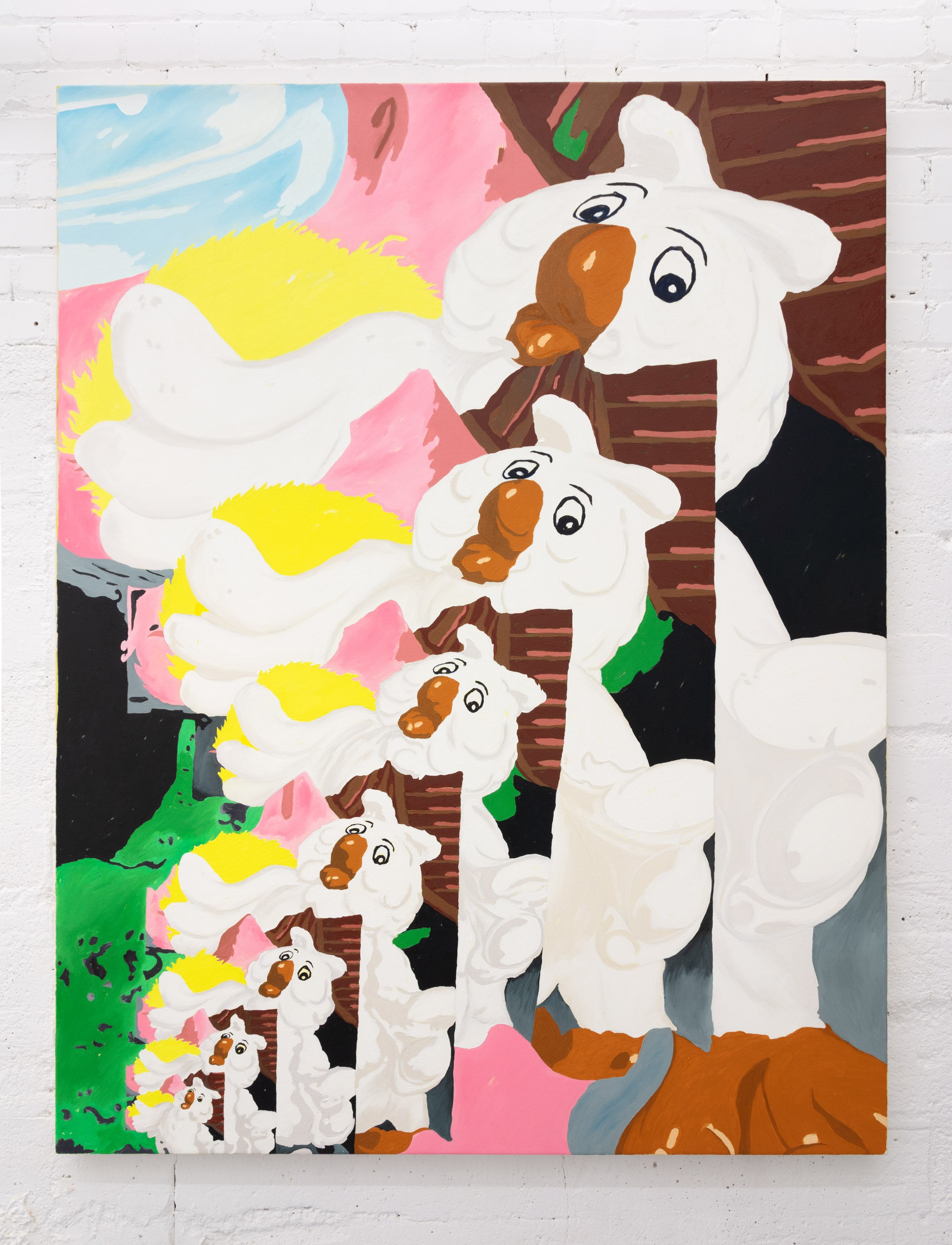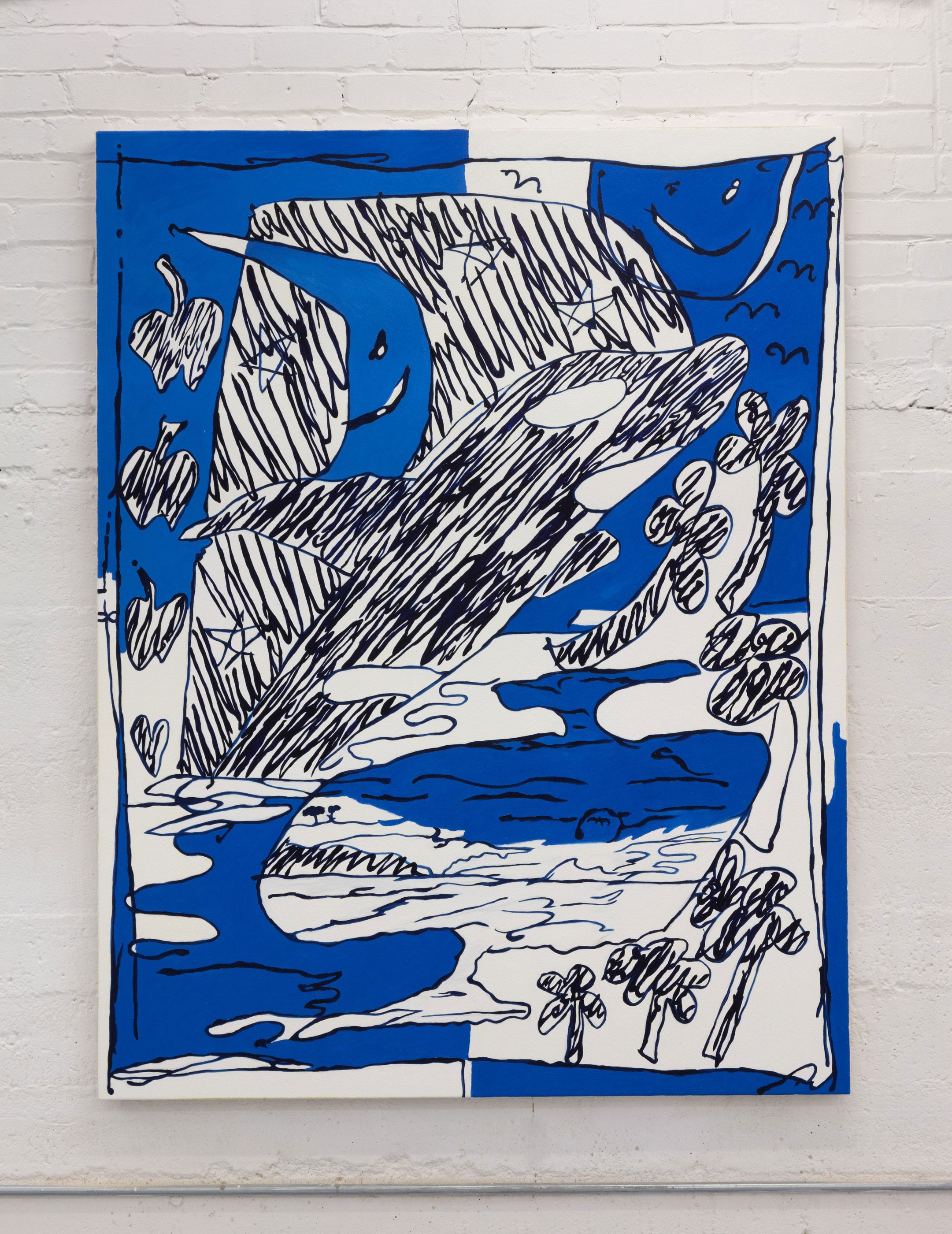 Playing with surface, colour, and form, he imbues the paintings with an almost frenetic energy, employing brush strokes and mark making that oscillate back and forth between the digital and physical sphere.