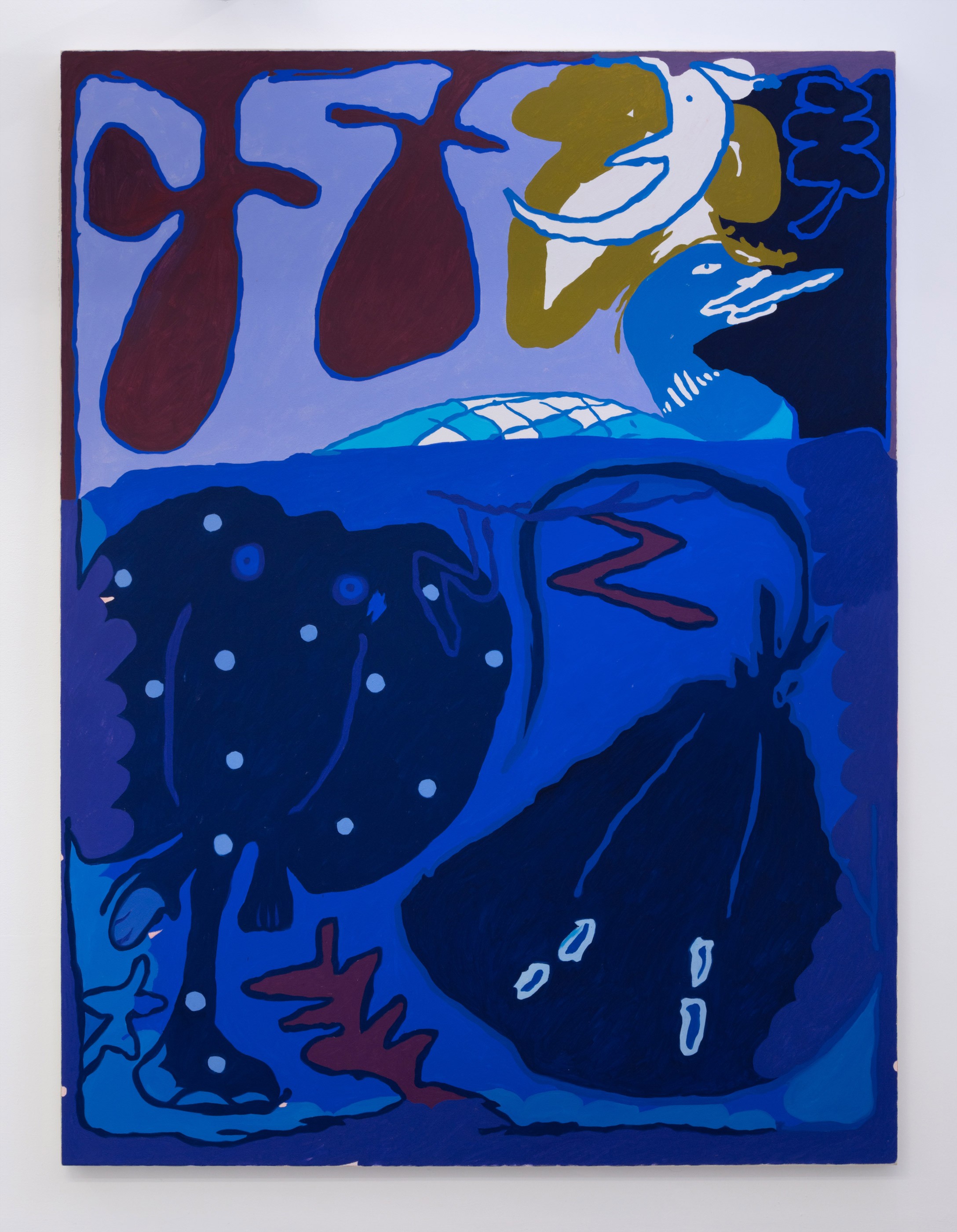 Tofino J56, Desolation Sound Effects, (named after a baby orca first spotted off the coast of Vancouver Island in 2019) features a seemingly hastily rendered whale jumping high above a fictional landscape. Night Fever, The Asylum at Dusk, is a dark blue cross-section painting of ocean featuring a ‘fever’ of stingrays and skates below a loon.