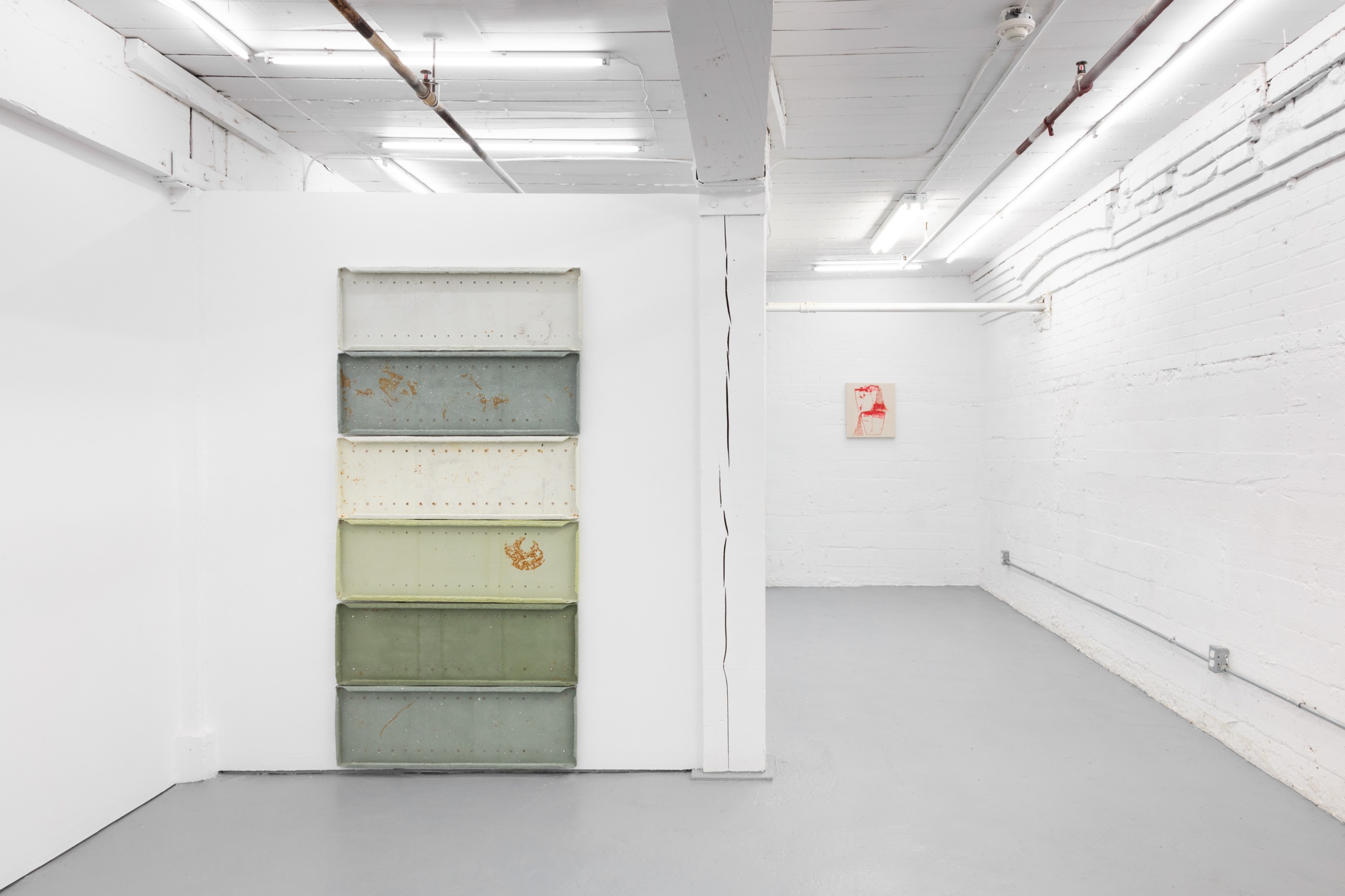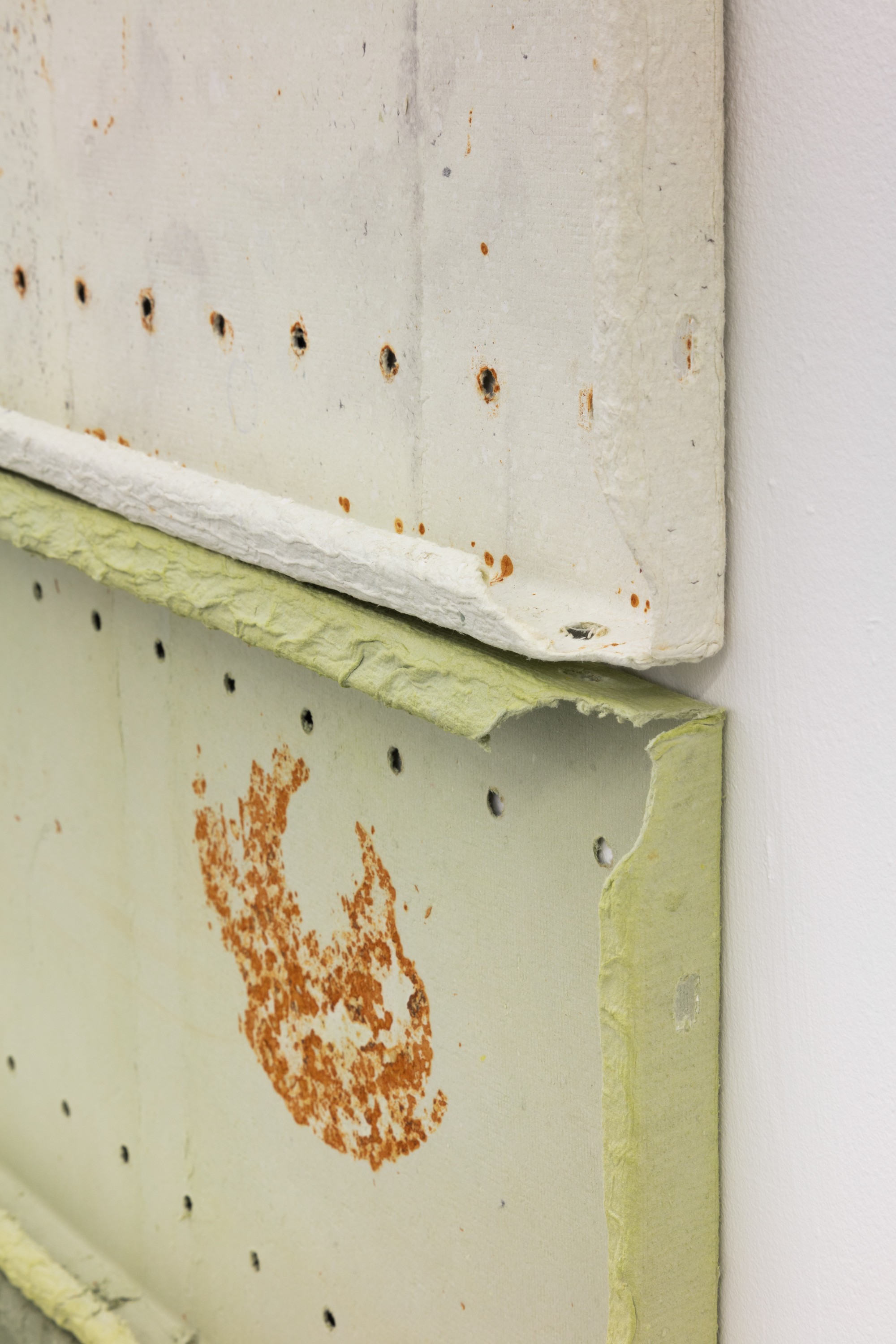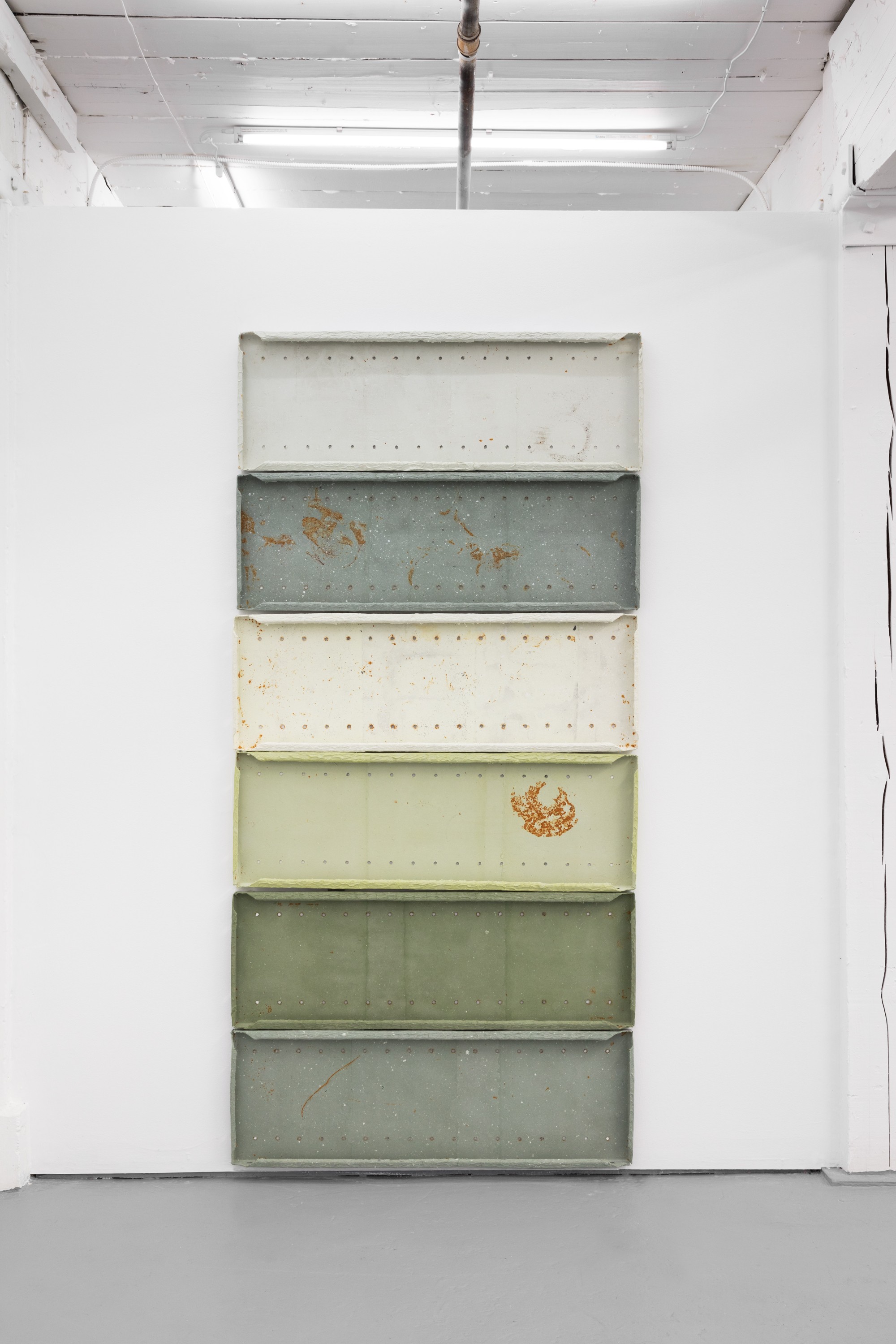 Nicolas Lachance’s practice explores the tension between image, mark making and surface. In this two-part installation, Lachance has created cast paper sculptures from disused industrial metal shelves. Working with carbon paper, he meticulously crafts near perfect facsimiles, with decades of wear and tear and accumulated debris transferring from the original structures to the cast pieces. Through this process, he examines the material history of these objects and how memory imprints itself upon these surfaces.