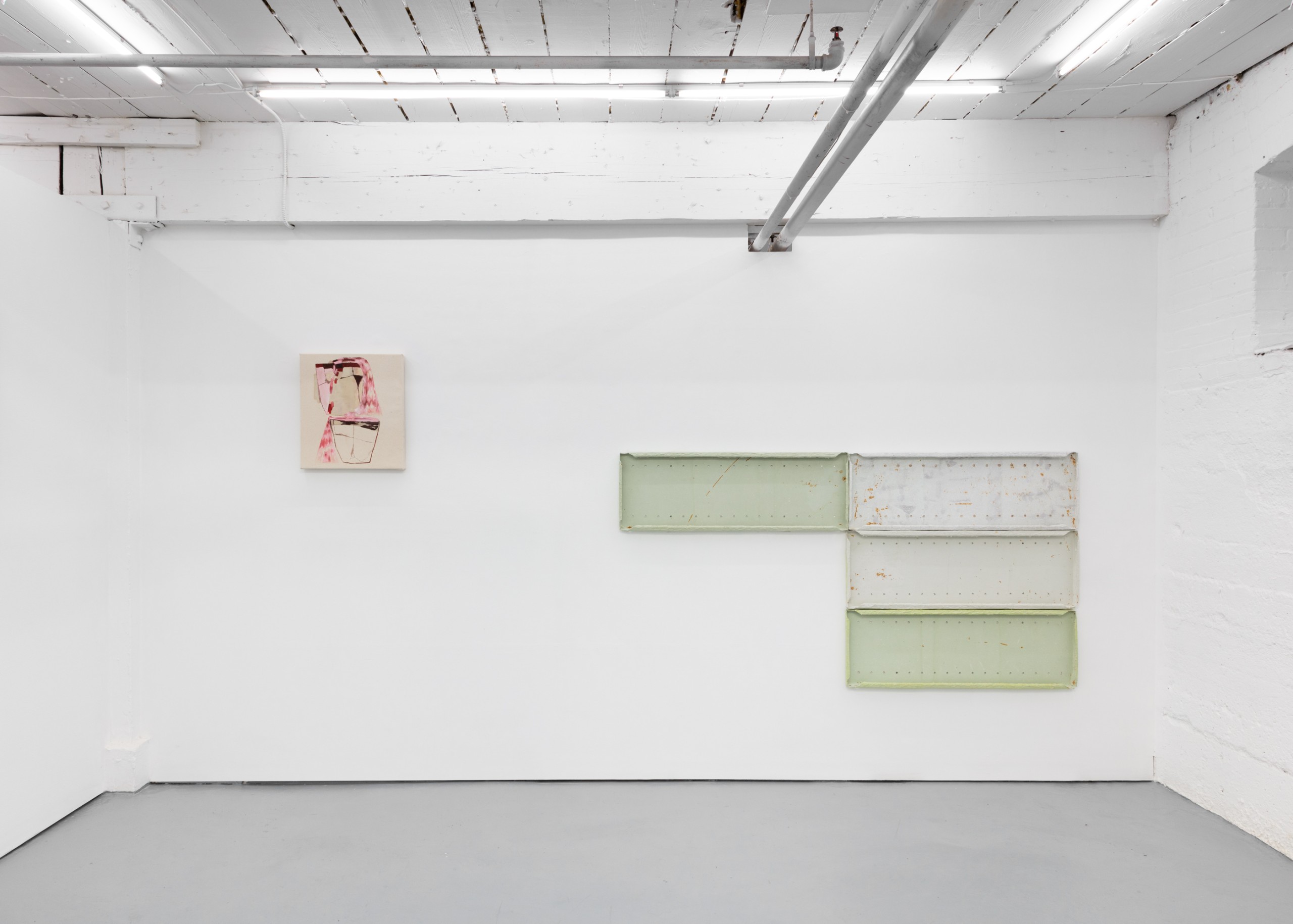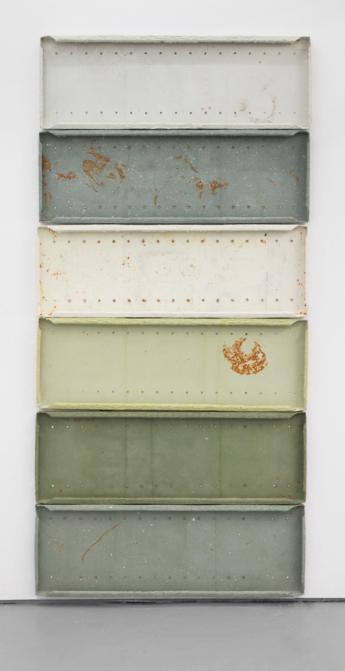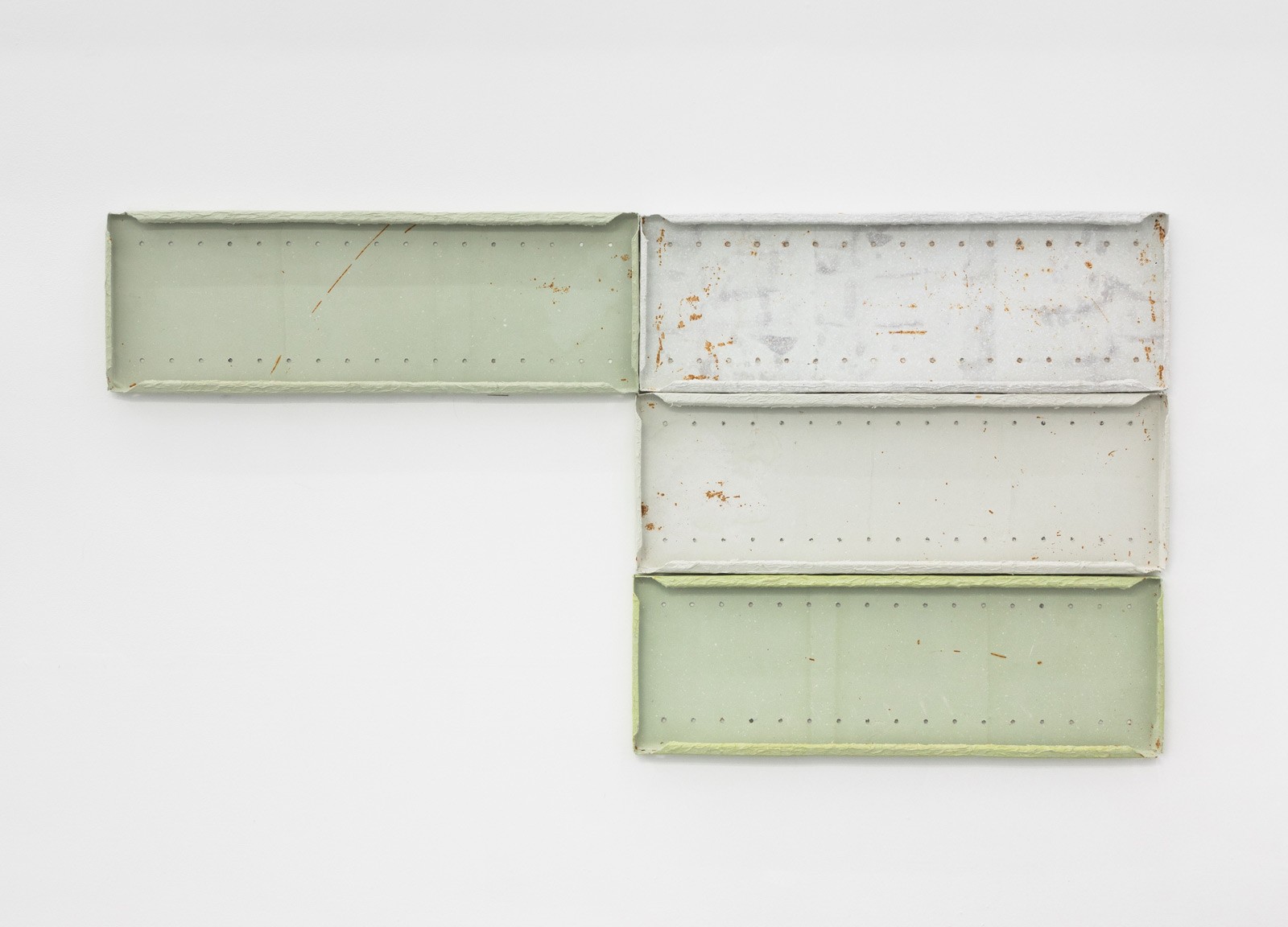 Nicolas Lachance’s practice explores the tension between image, mark making and surface. In this two-part installation, Lachance has created cast paper sculptures from disused industrial metal shelves. Working with carbon paper, he meticulously crafts near perfect facsimiles, with decades of wear and tear and accumulated debris transferring from the original structures to the cast pieces. Through this process, he examines the material history of these objects and how memory imprints itself upon these surfaces.