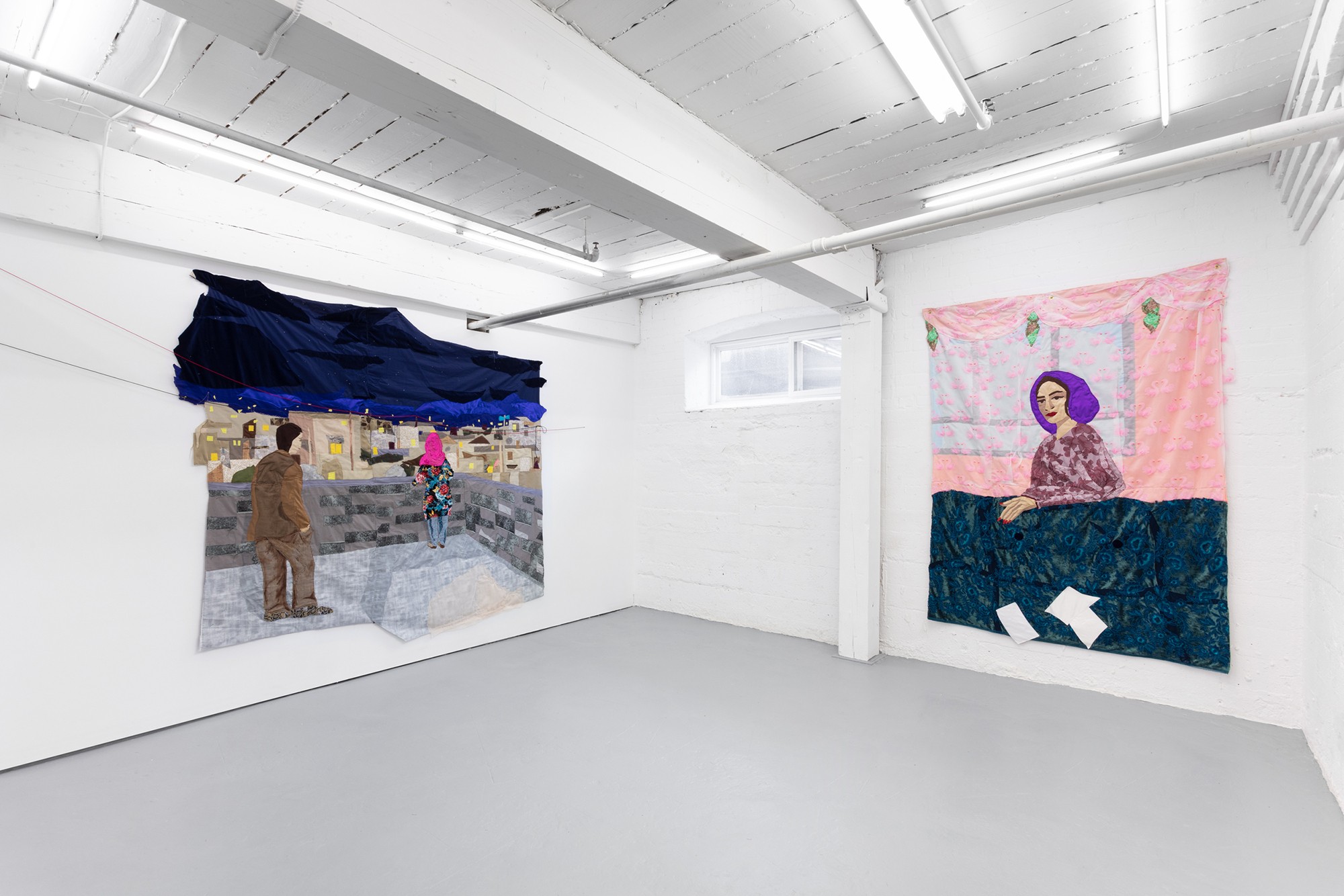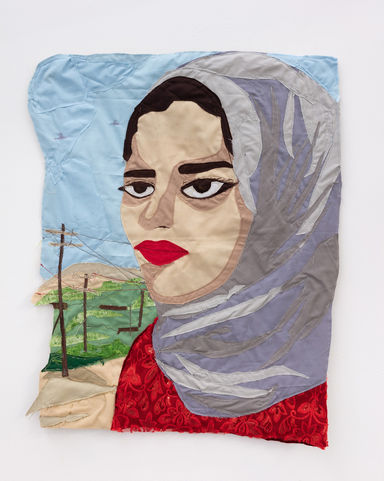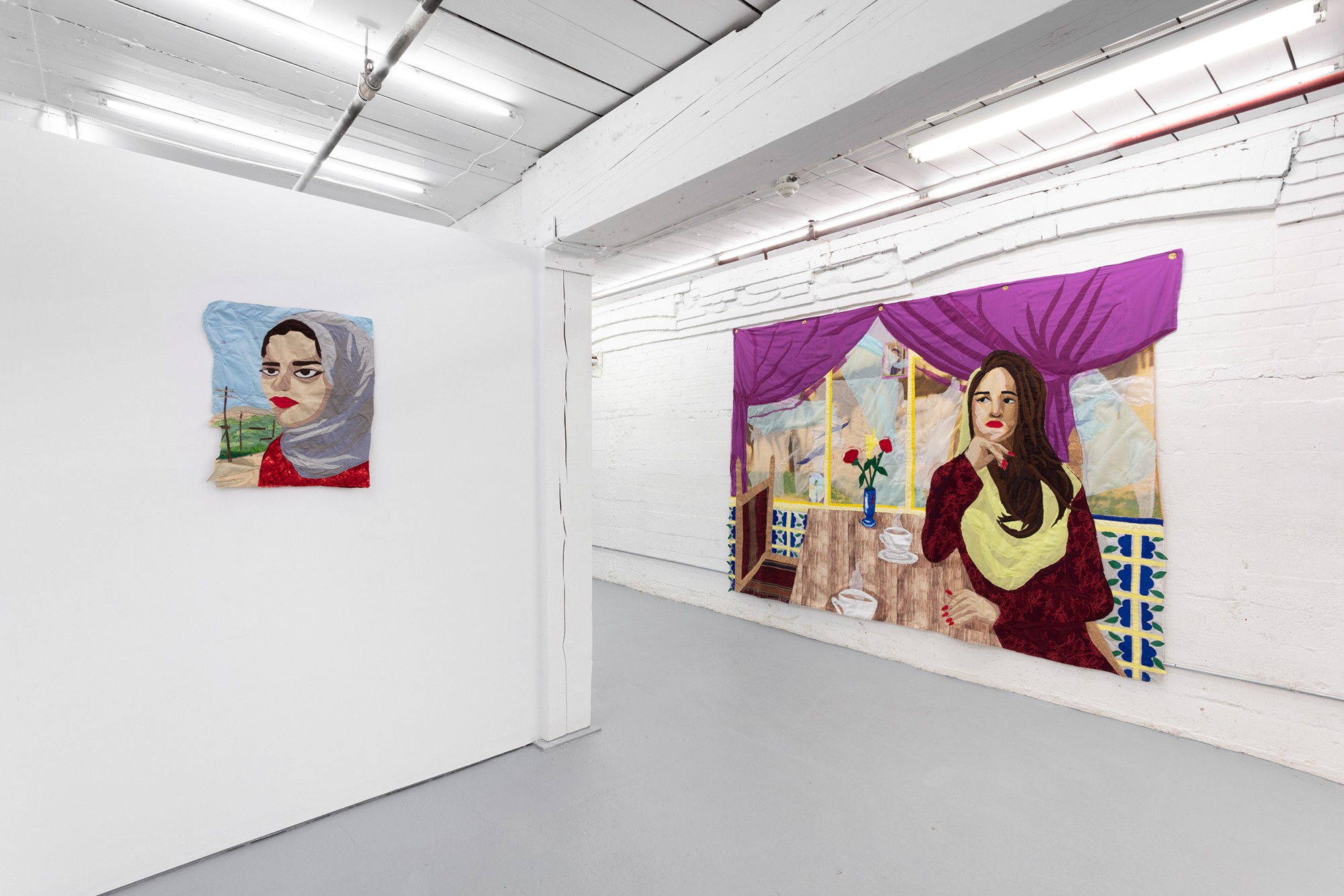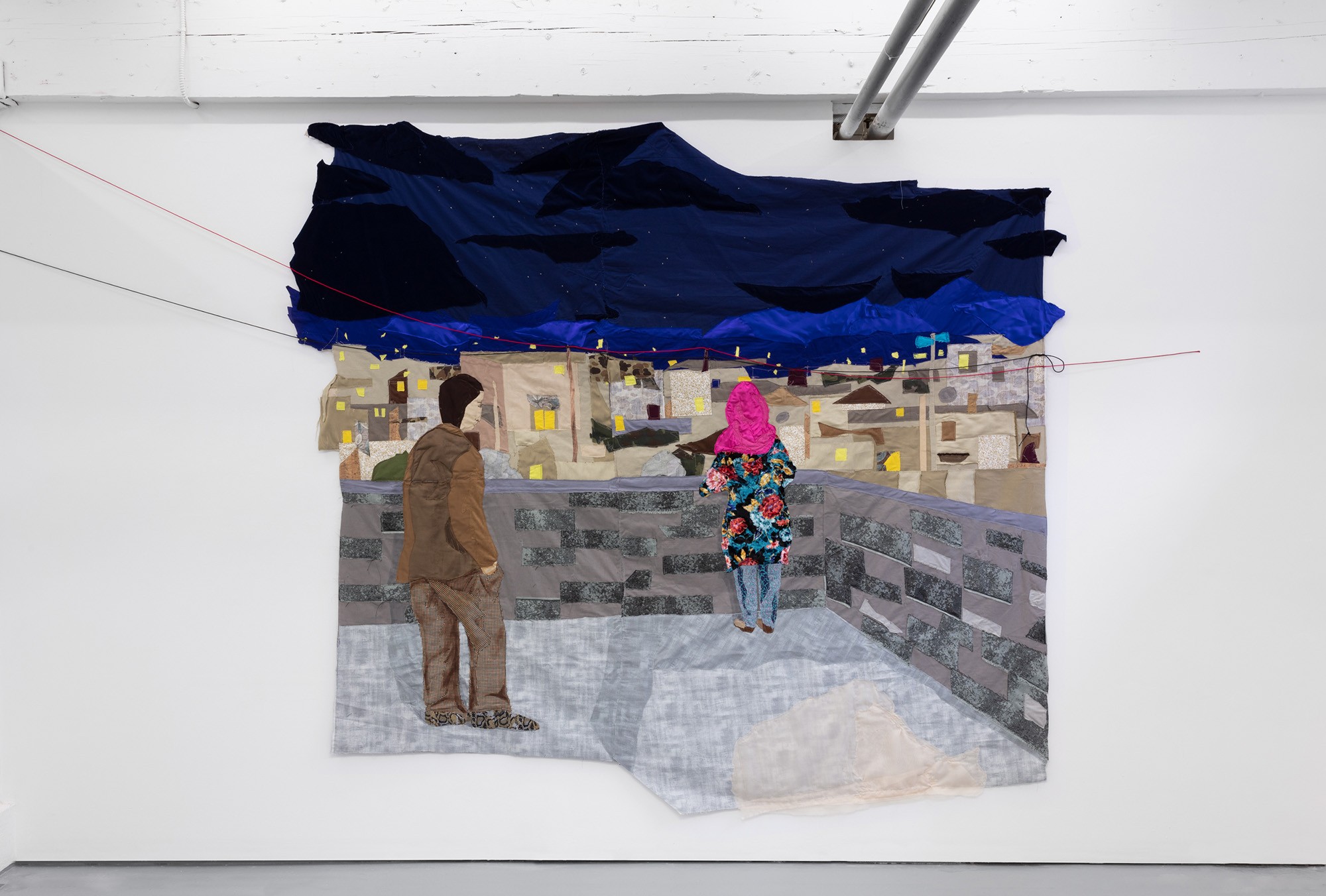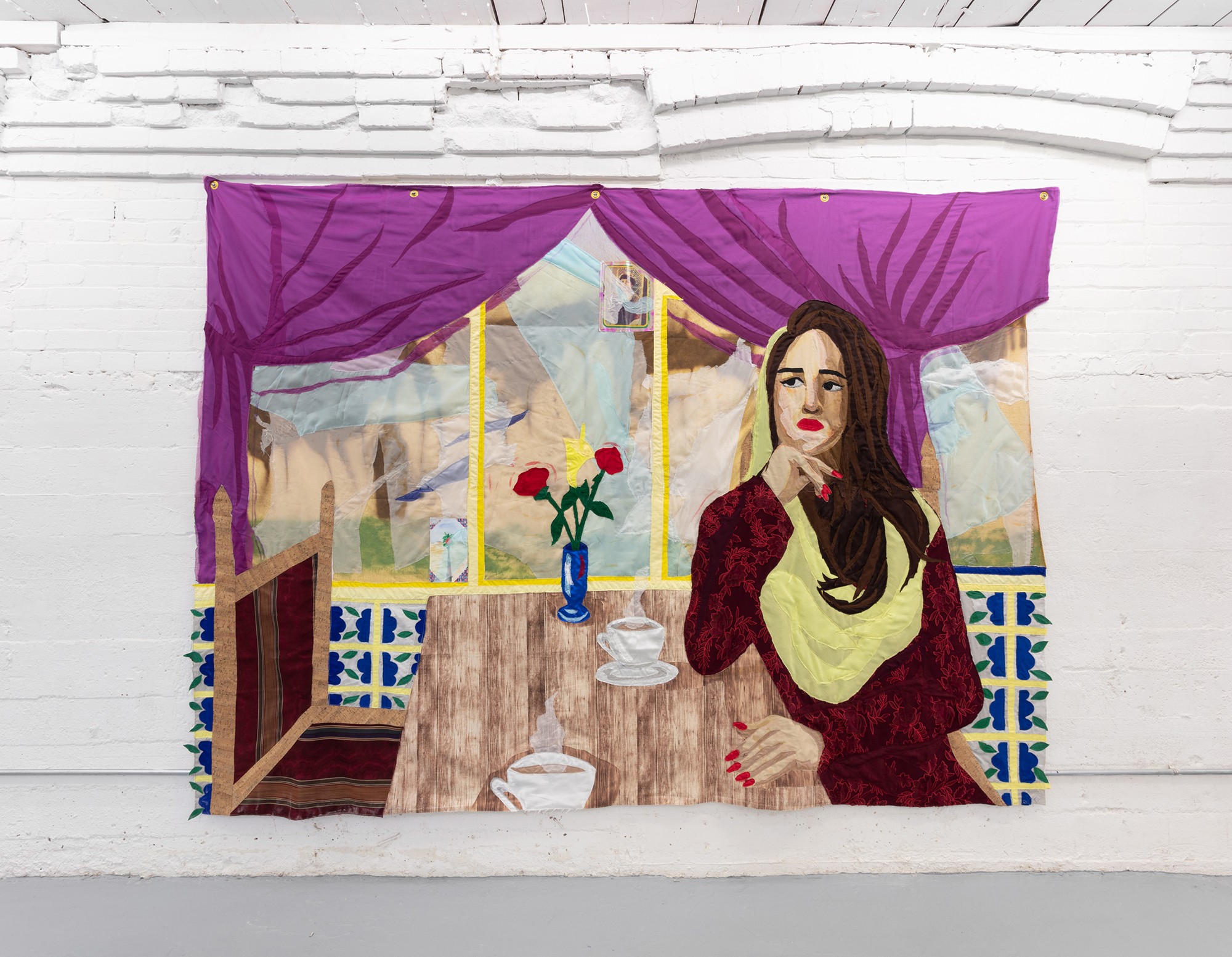 Drawing upon these stories as well as her own personal memories, Amiri has created a series of immersive, large scale portraits. Set within coffee shops, on rooftops, as well as the outskirts of the city, these works hover back and forth between public and private spaces, creating a sense of intimacy while depicting a more urbane and cosmopolitan existence. The fictionalized subjects within these portraits are similarly nuanced, evoking complex, multifaceted lives that reflect a myriad of lived experiences. Combining sewn textiles with hand painted elements, these vivid, richly layered scenes explore such universal themes as fear, longing, love, and hope, while drawing attention to the precarity of living under the constant threat of social and political upheaval.