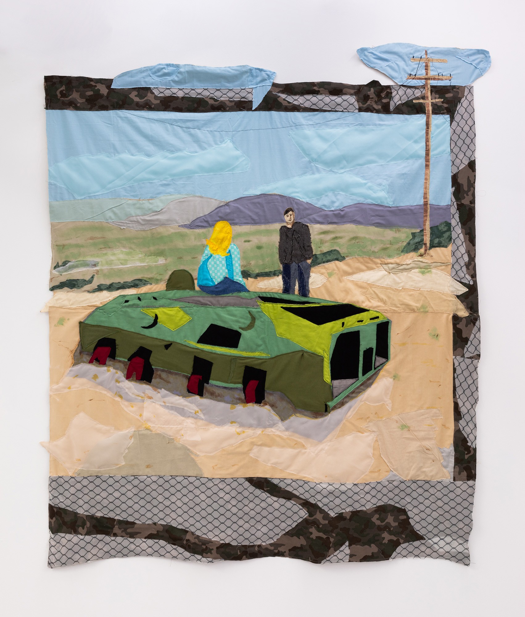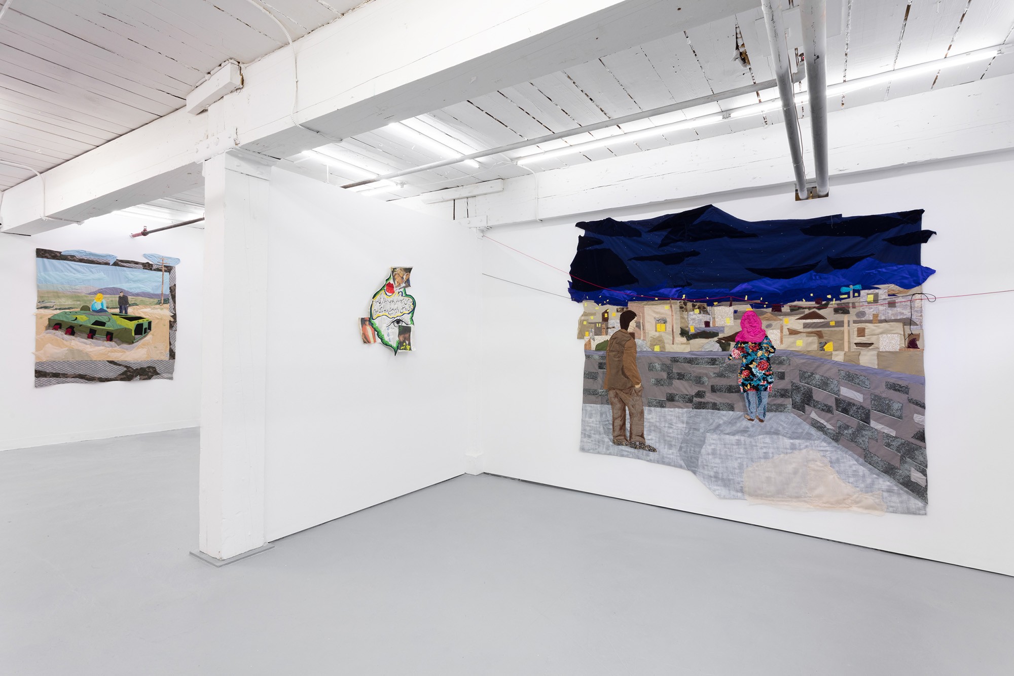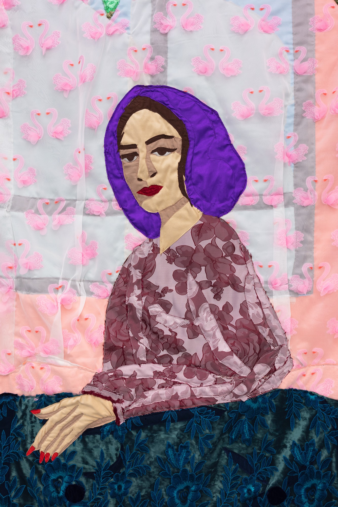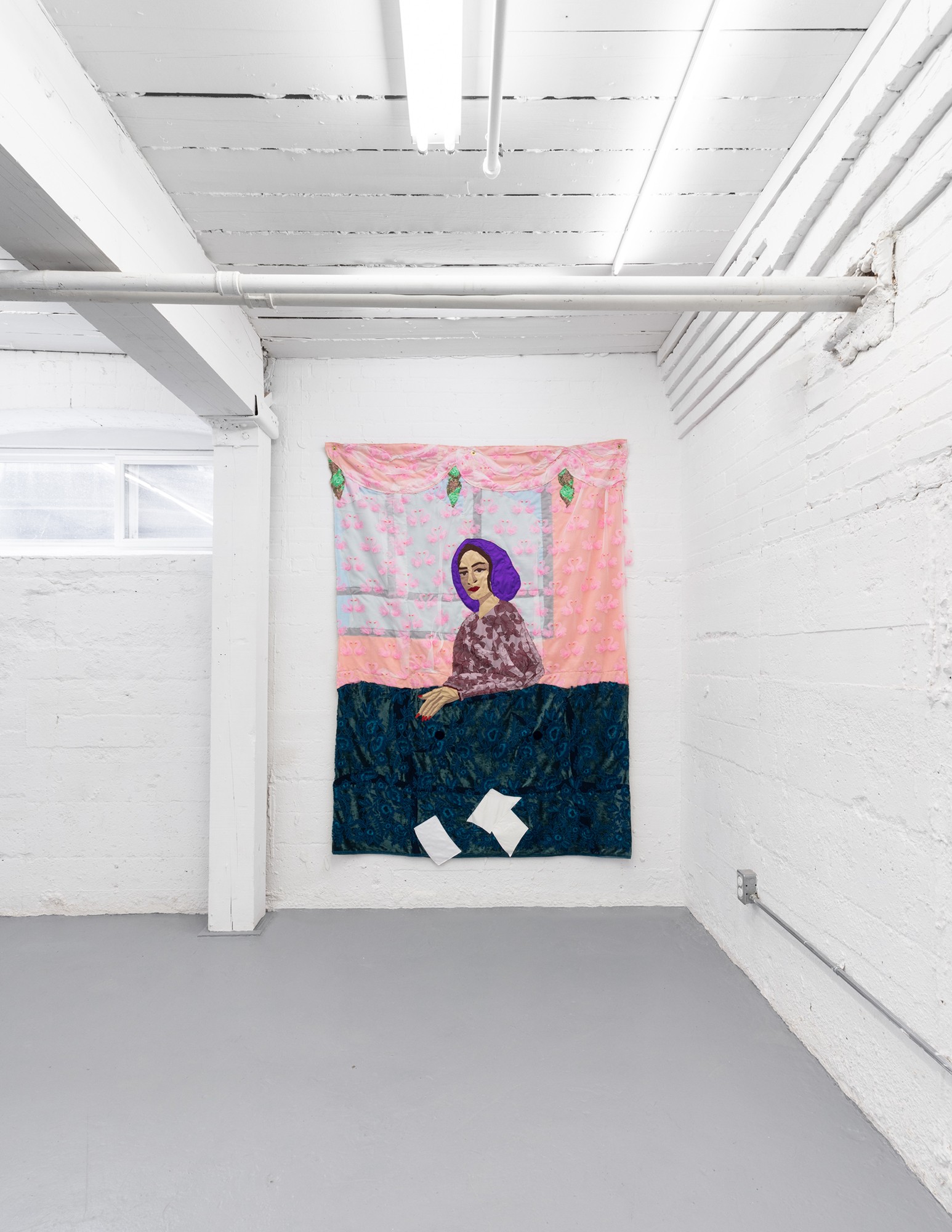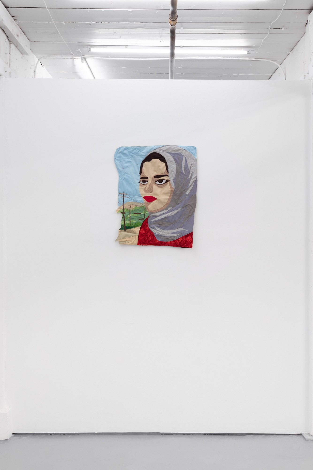 Drawing upon these stories as well as her own personal memories, Amiri has created a series of immersive, large scale portraits. Set within coffee shops, on rooftops, as well as the outskirts of the city, these works hover back and forth between public and private spaces, creating a sense of intimacy while depicting a more urbane and cosmopolitan existence. The fictionalized subjects within these portraits are similarly nuanced, evoking complex, multifaceted lives that reflect a myriad of lived experiences. Combining sewn textiles with hand painted elements, these vivid, richly layered scenes explore such universal themes as fear, longing, love, and hope, while drawing attention to the precarity of living under the constant threat of social and political upheaval.