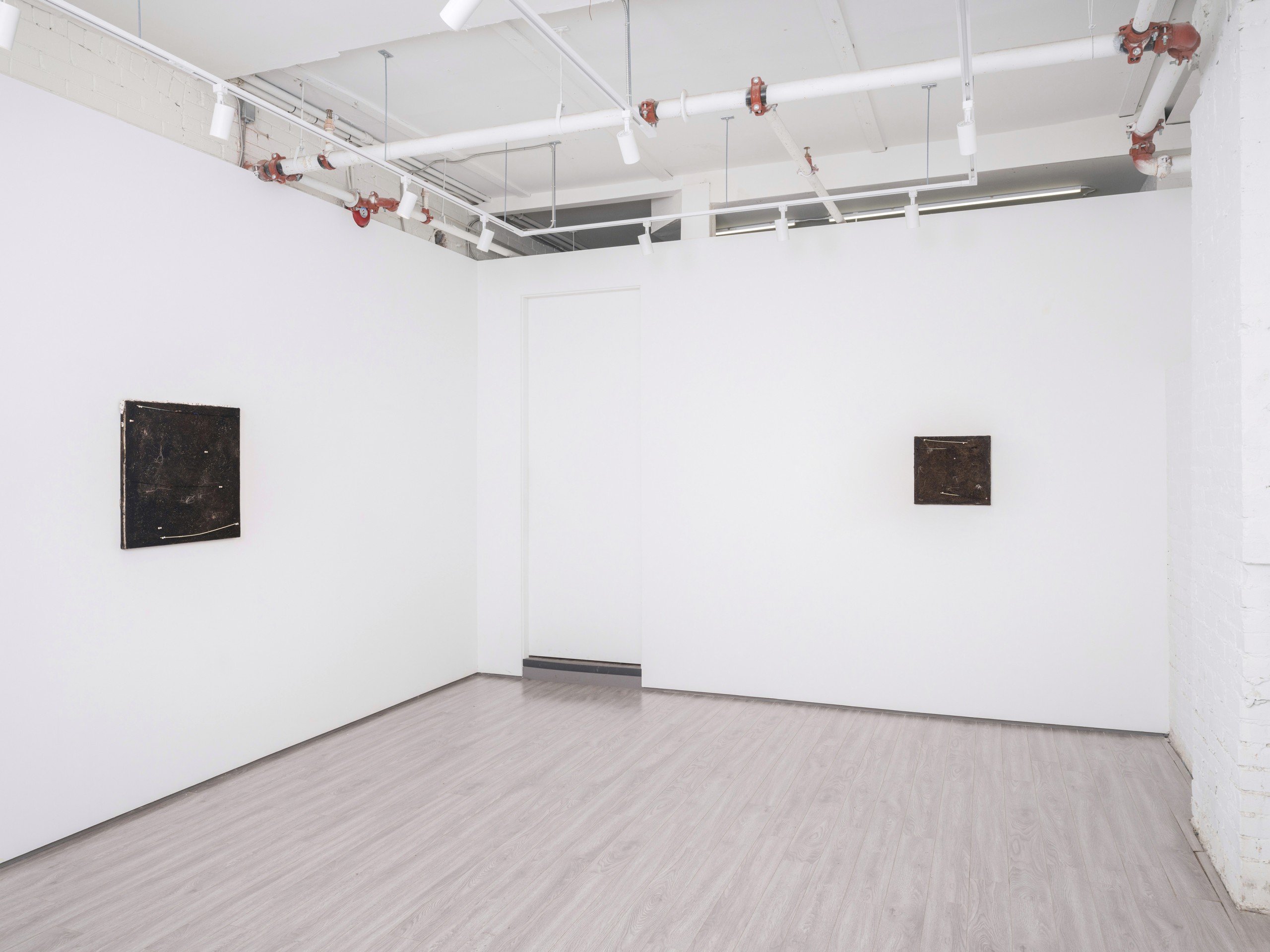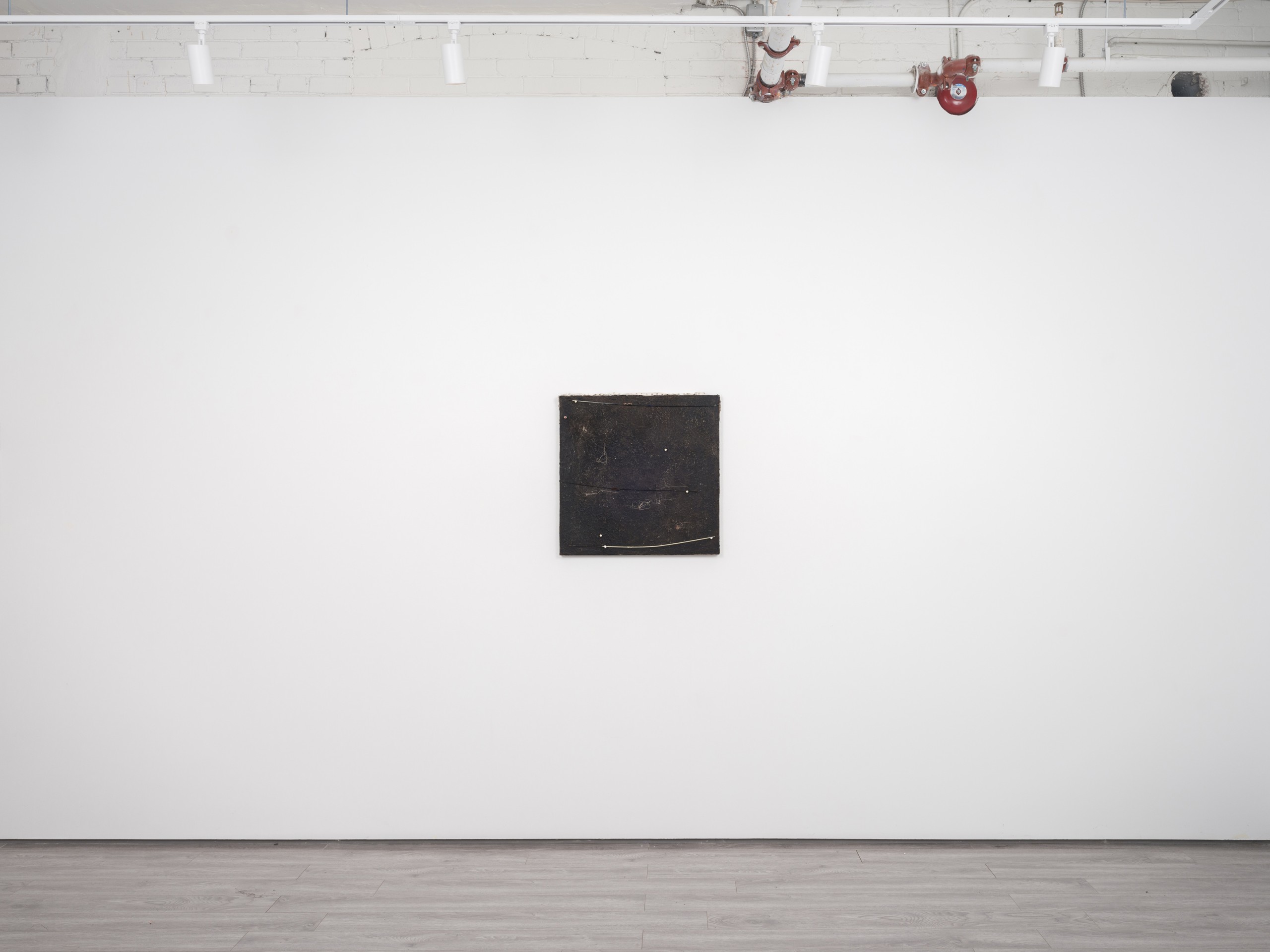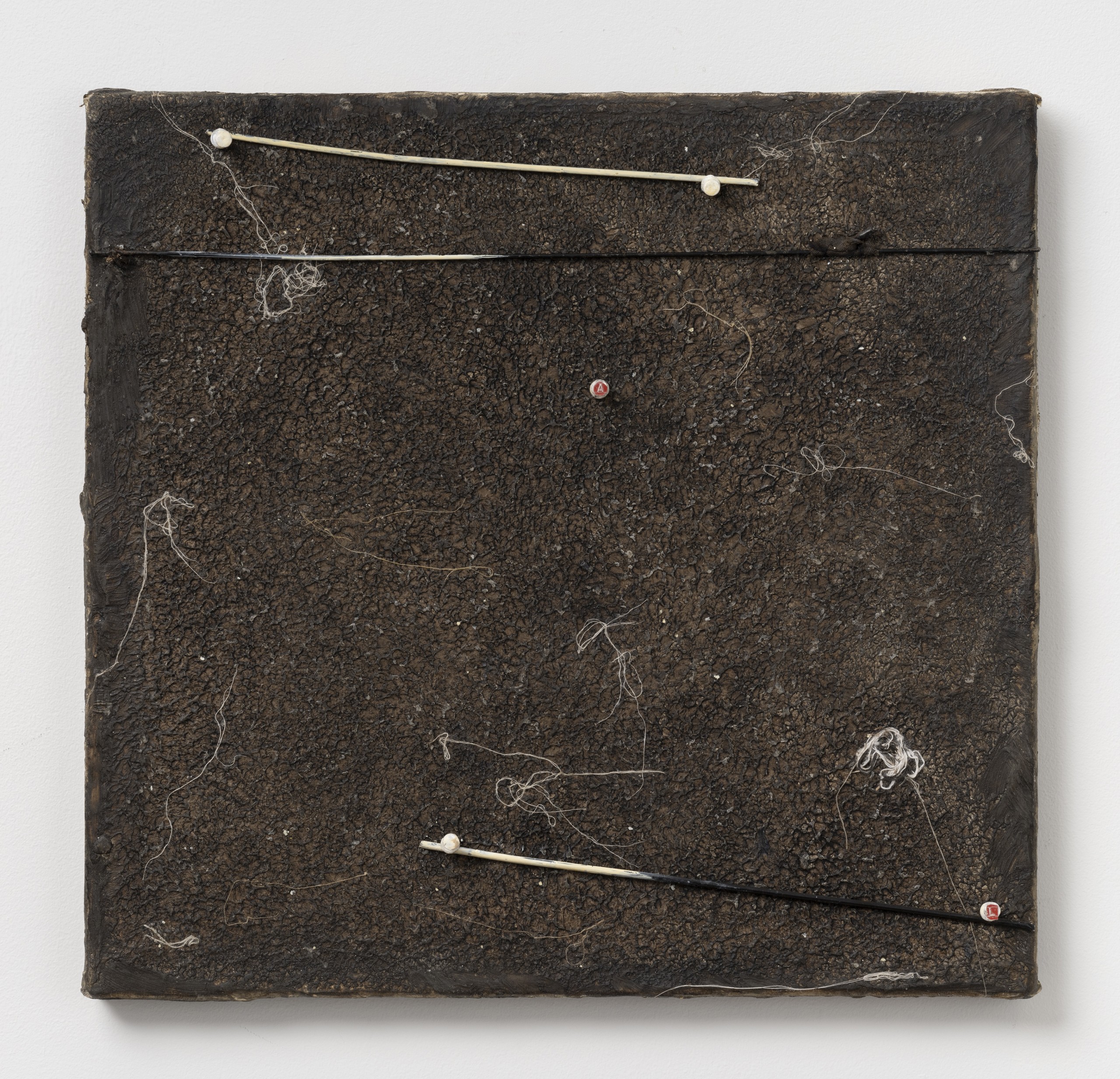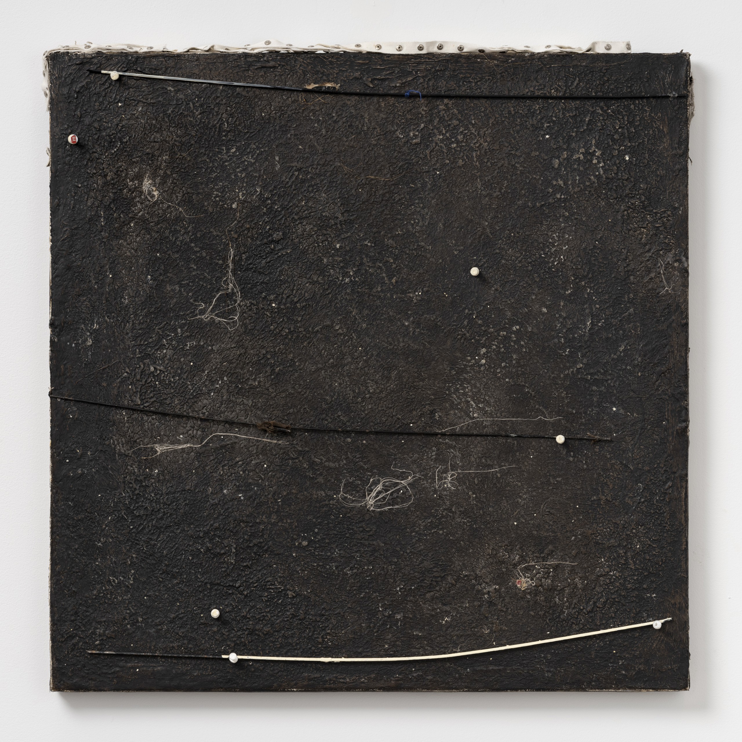 This exhibition presents a new collage on linen together with wall-based assemblages. At the entrance, a stretched, low-resolution image depicts an upside-down photograph of a wool winter coat with hints of flash reflections, continuing a series using found online memorabilia. On the walls, the square oil-painted panels incorporate umbrella ribs and thumbtacks. The surface is built up over time with aggregated layers of dark wax and oil; beneath this, silk and threads emerge like neural pathways. The pushpins seem to mark points of trajectory and directional flow. Autobahn reflects on the perspectival qualities of movement and light. The notion of the blind spot—or l’angle mort in French, meaning “death angle” serves as a leitmotif to frame the relationship between a viewer’s subjective gaze and an object. It draws attention to the elusive, unpredictable elements that hover in our field of vision—as a darkened horizon, just at the edge of sight.