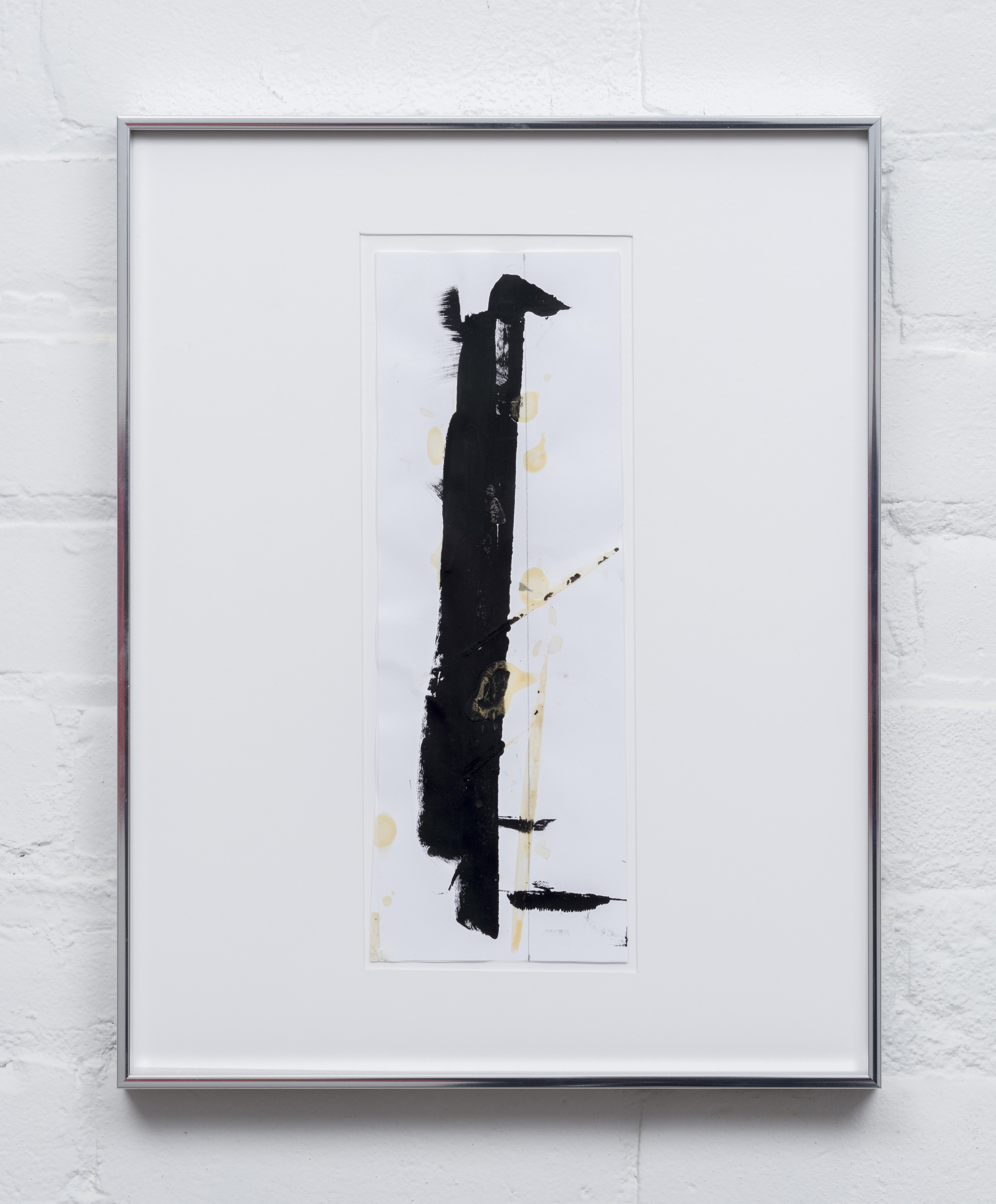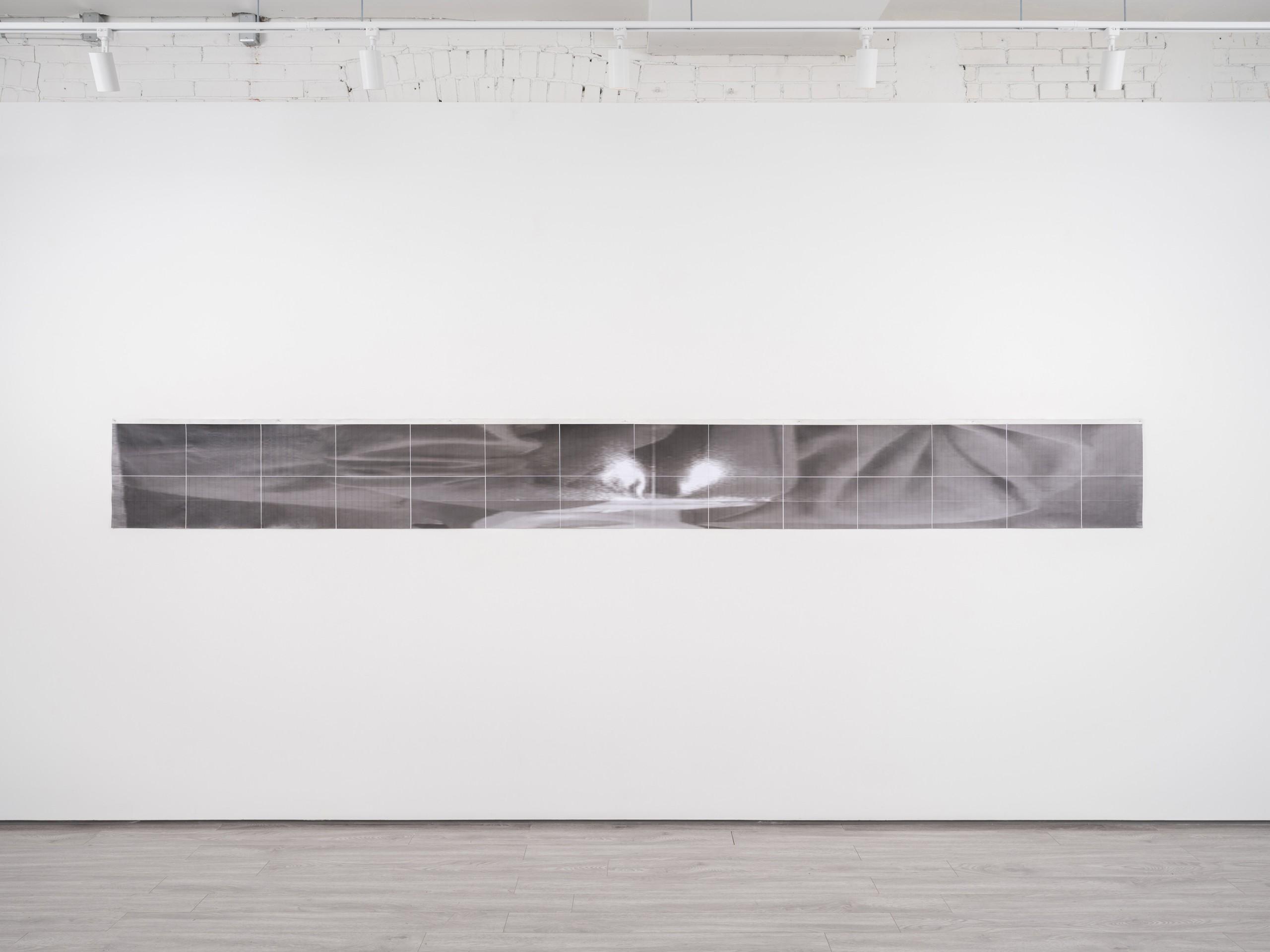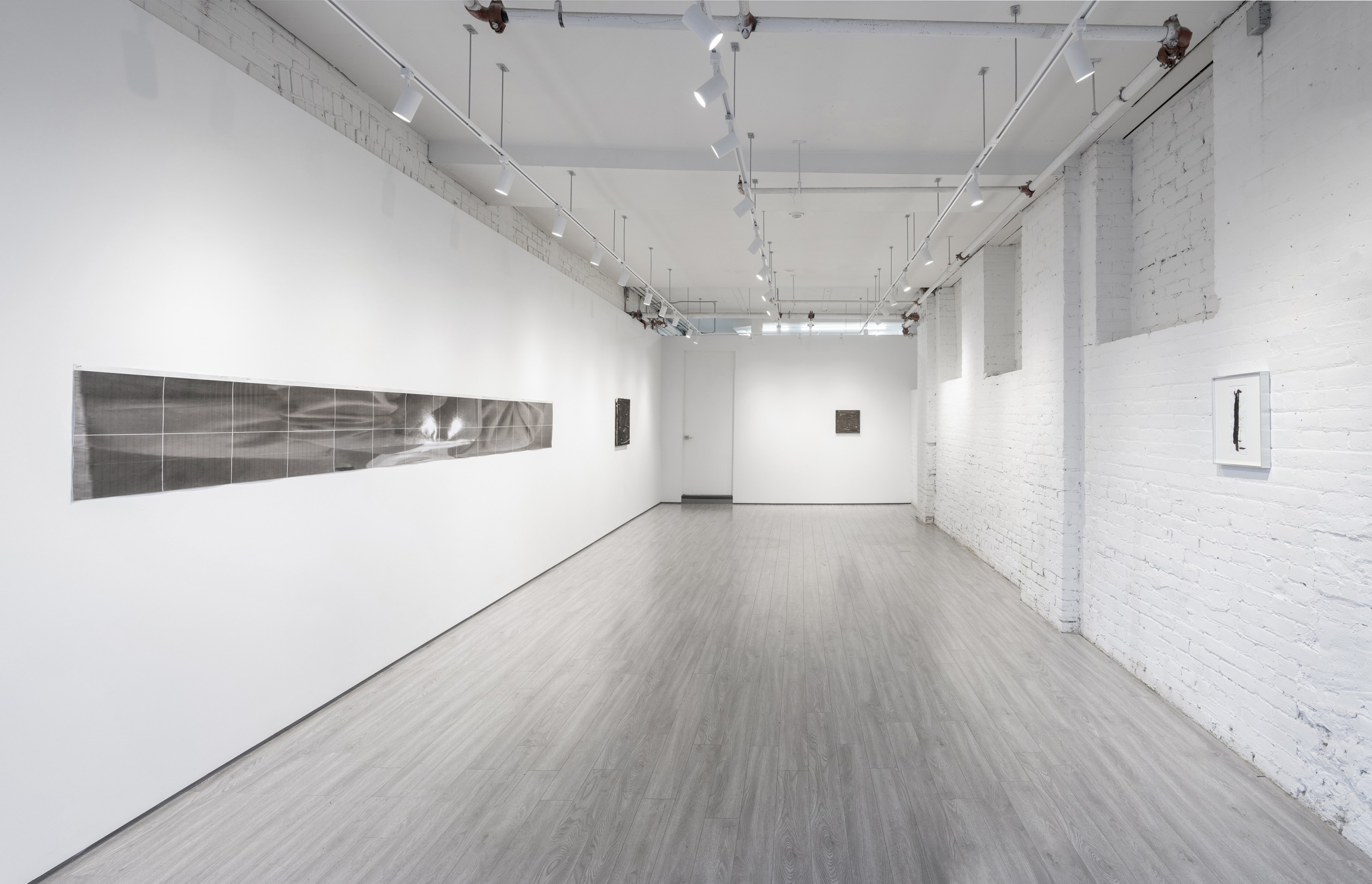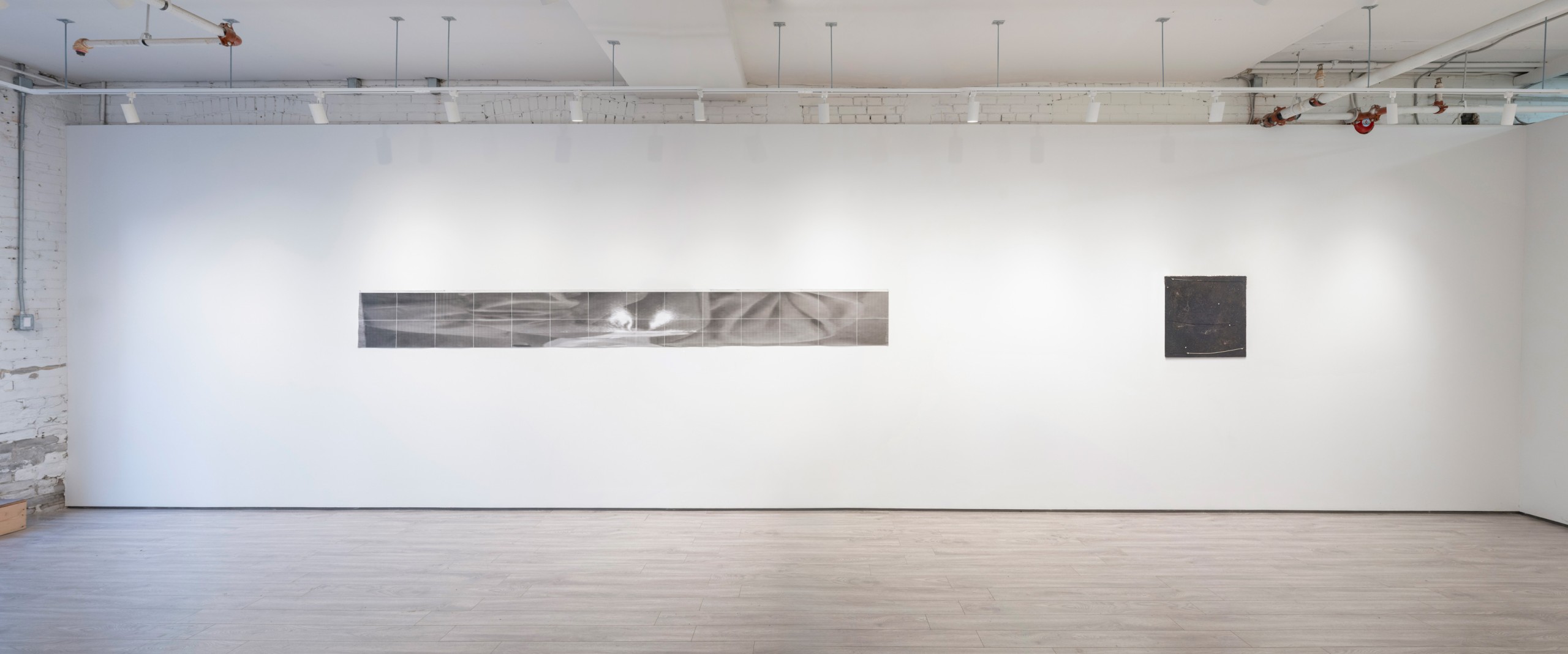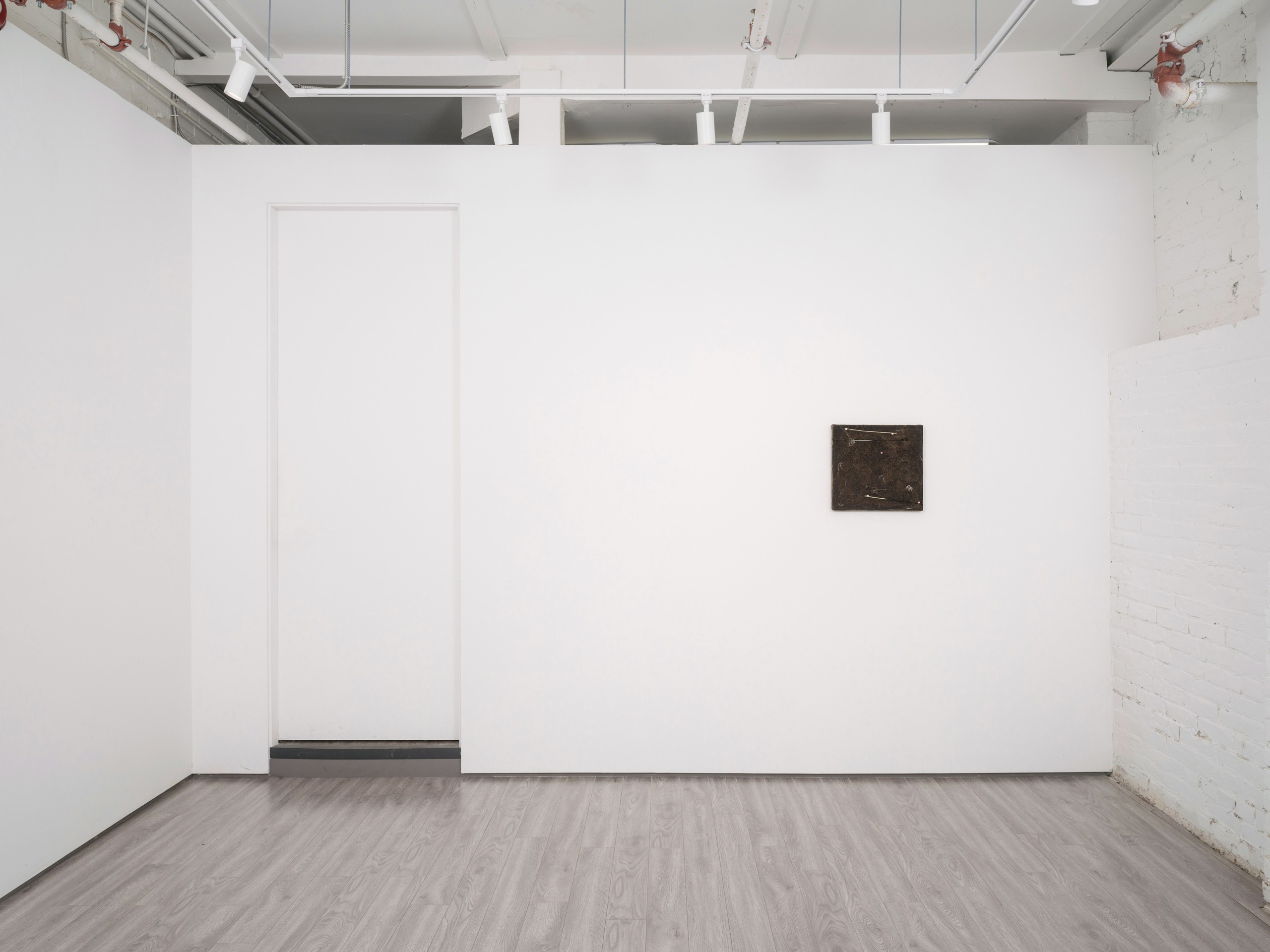 This exhibition presents a new collage on linen together with wall-based assemblages. At the entrance, a stretched, low-resolution image depicts an upside-down photograph of a wool winter coat with hints of flash reflections, continuing a series using found online memorabilia. On the walls, the square oil-painted panels incorporate umbrella ribs and thumbtacks. The surface is built up over time with aggregated layers of dark wax and oil; beneath this, silk and threads emerge like neural pathways. The pushpins seem to mark points of trajectory and directional flow. Autobahn reflects on the perspectival qualities of movement and light. The notion of the blind spot—or l’angle mort in French, meaning “death angle” serves as a leitmotif to frame the relationship between a viewer’s subjective gaze and an object. It draws attention to the elusive, unpredictable elements that hover in our field of vision—as a darkened horizon, just at the edge of sight.