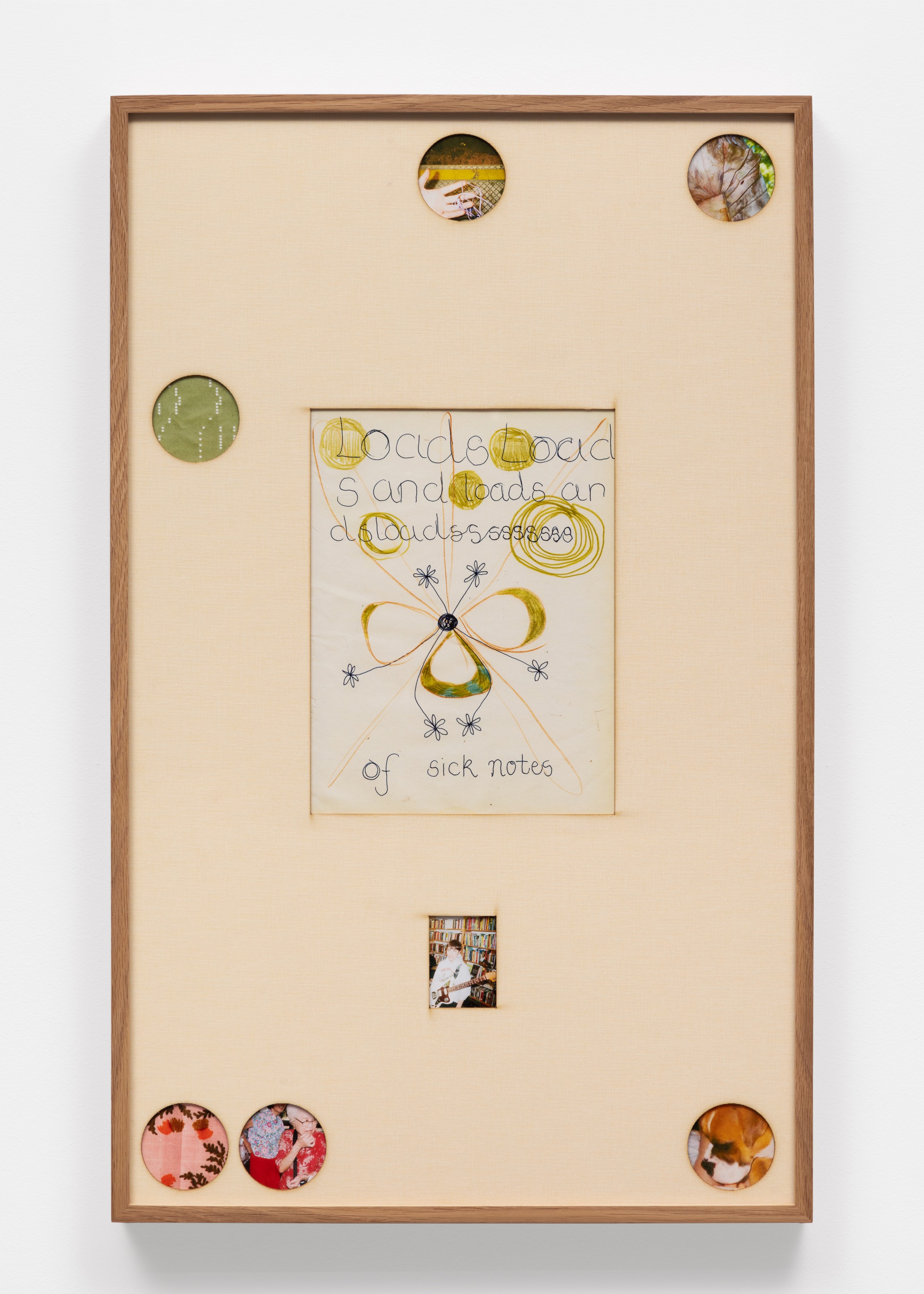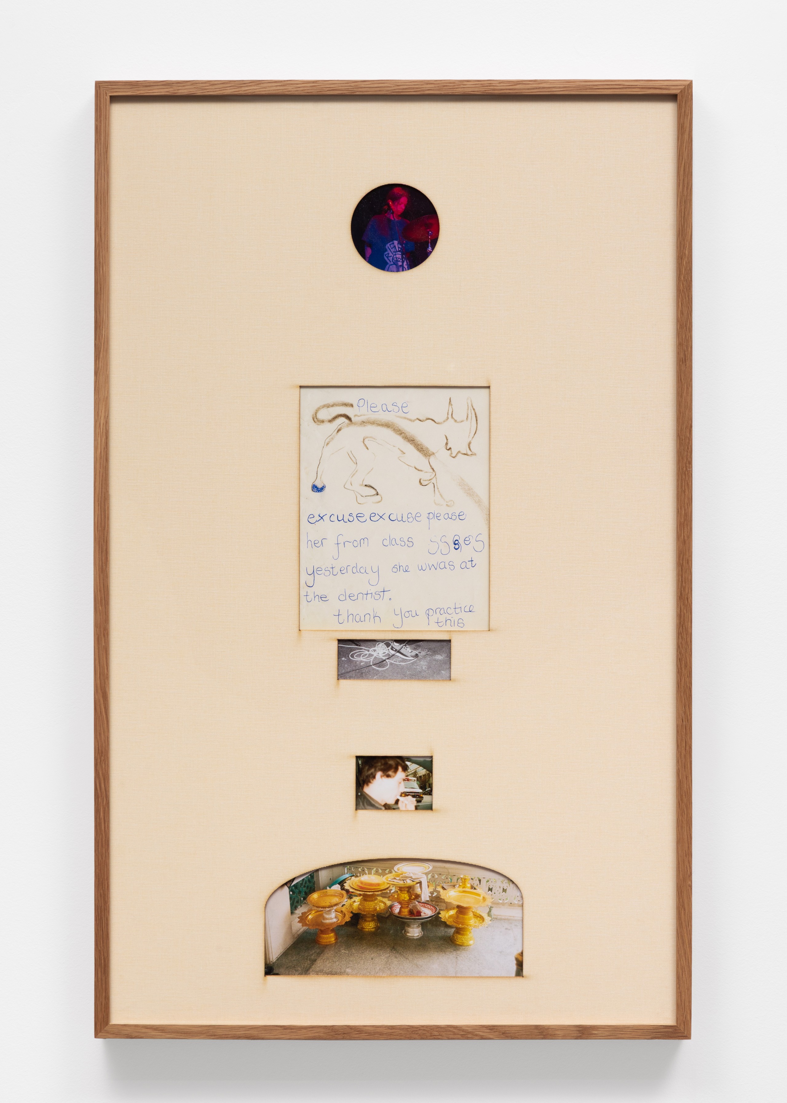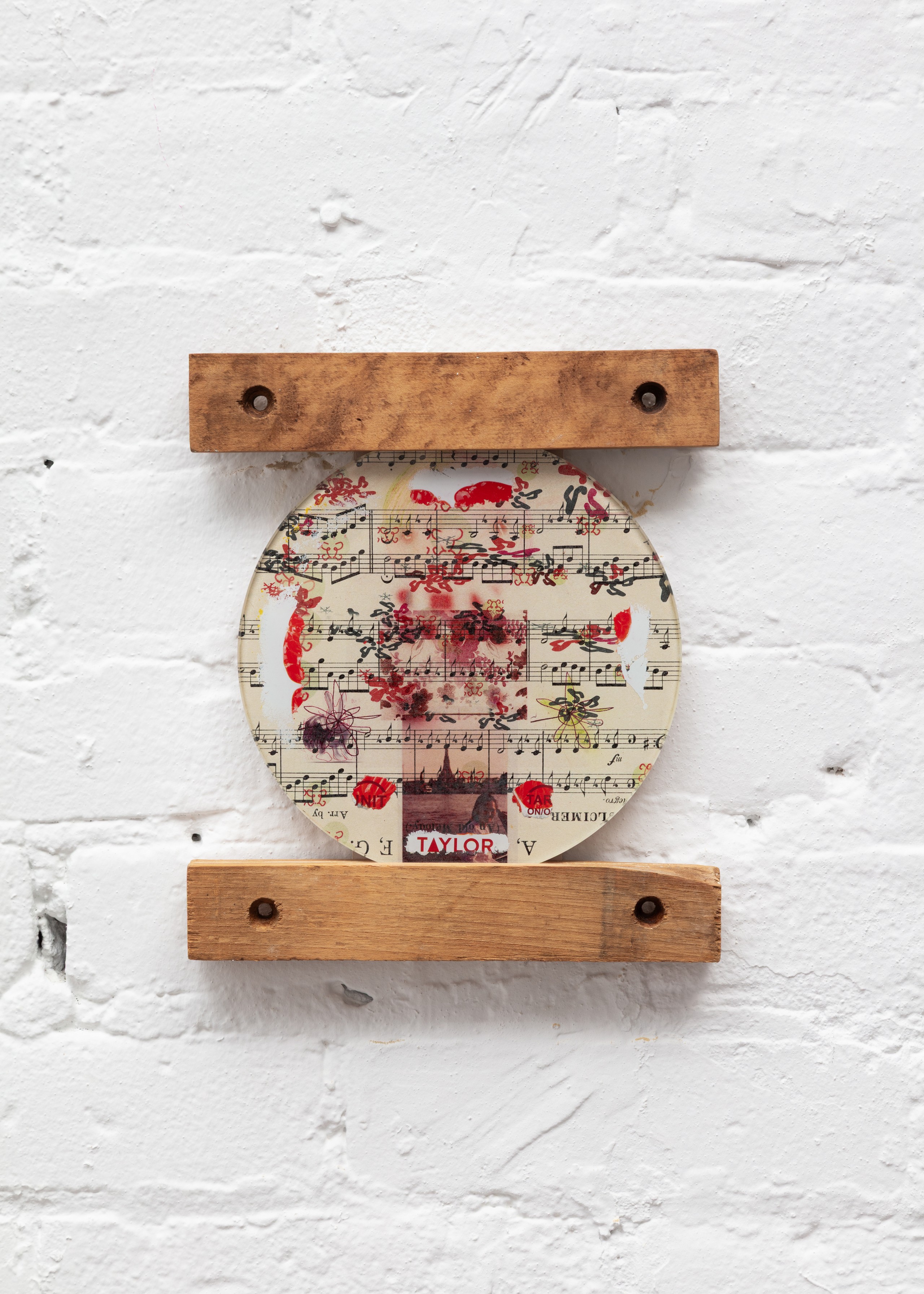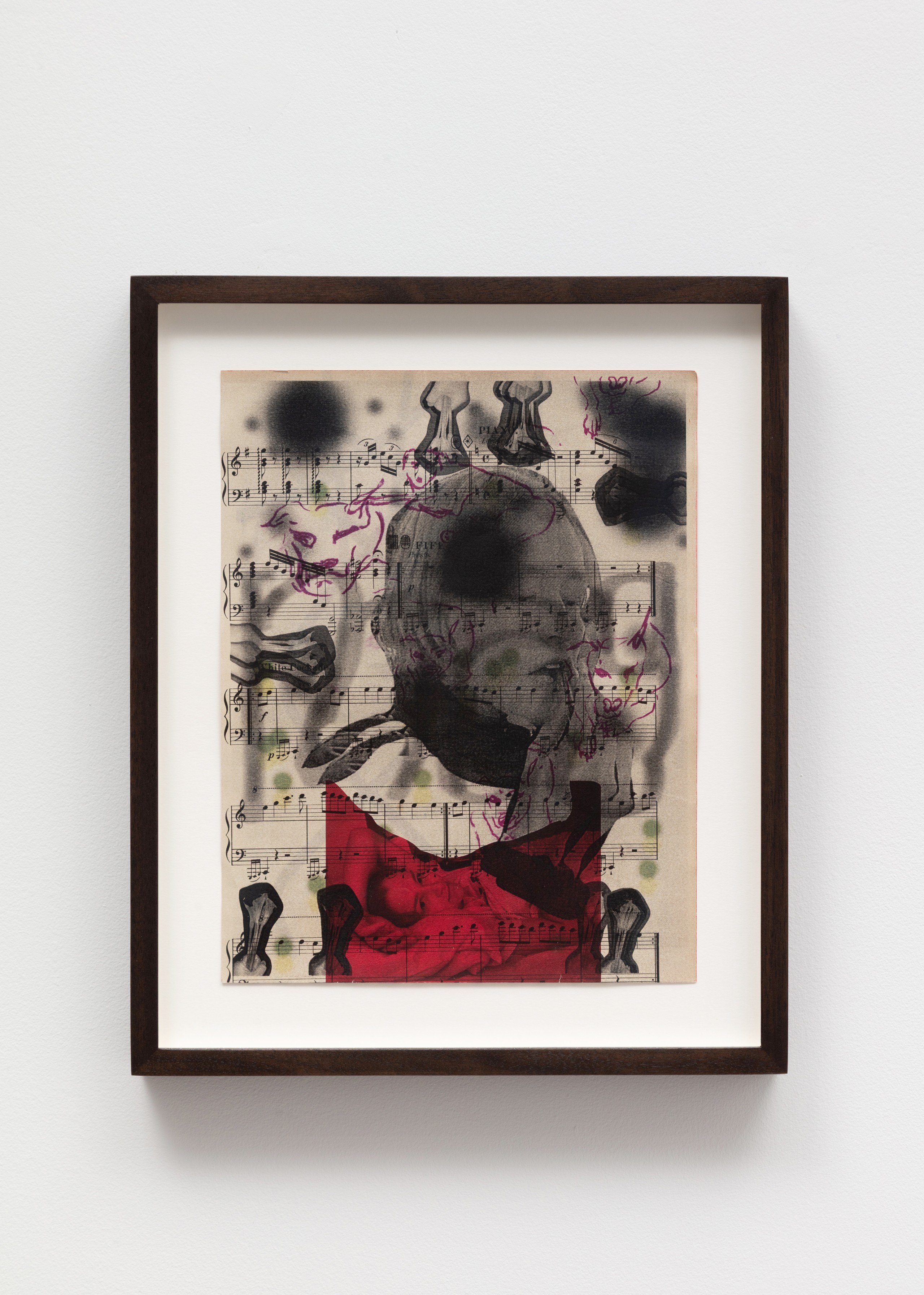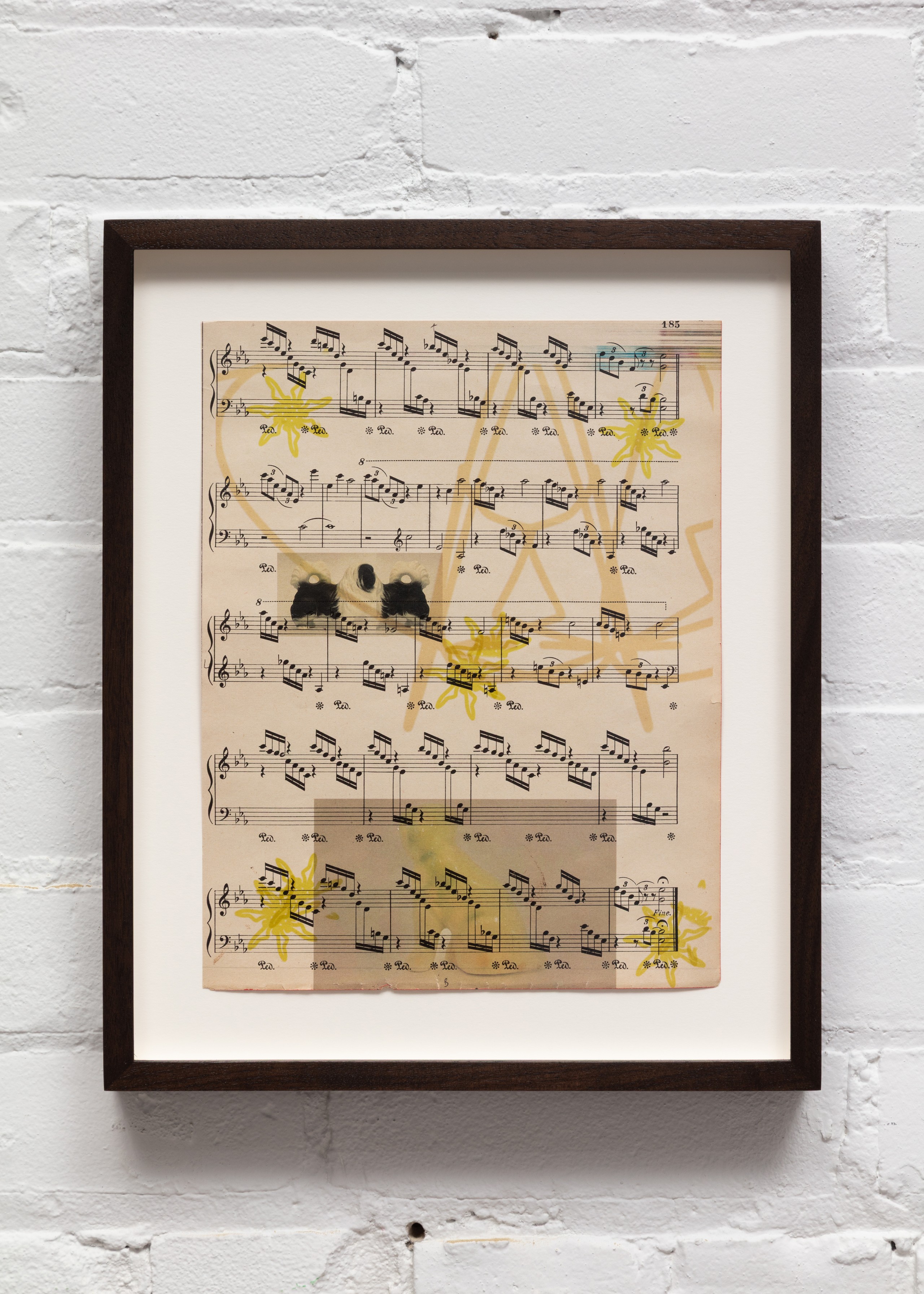 The presence of sheet music belies the aforementioned concerns, along the vector of pattern. One can defer to biographical information—Holmes’ history in bands and as a band-photographer—to point to its presence here. Or, the formal and conceptual echoes between Holmes’ treatment of images and music through her use of splicing, overlaying, and collaging. Alternatively, there is sheet music as a structure—a kind of concrete or semi-reified device to make sense of the sonic, a kind of support that determines the encounter.
