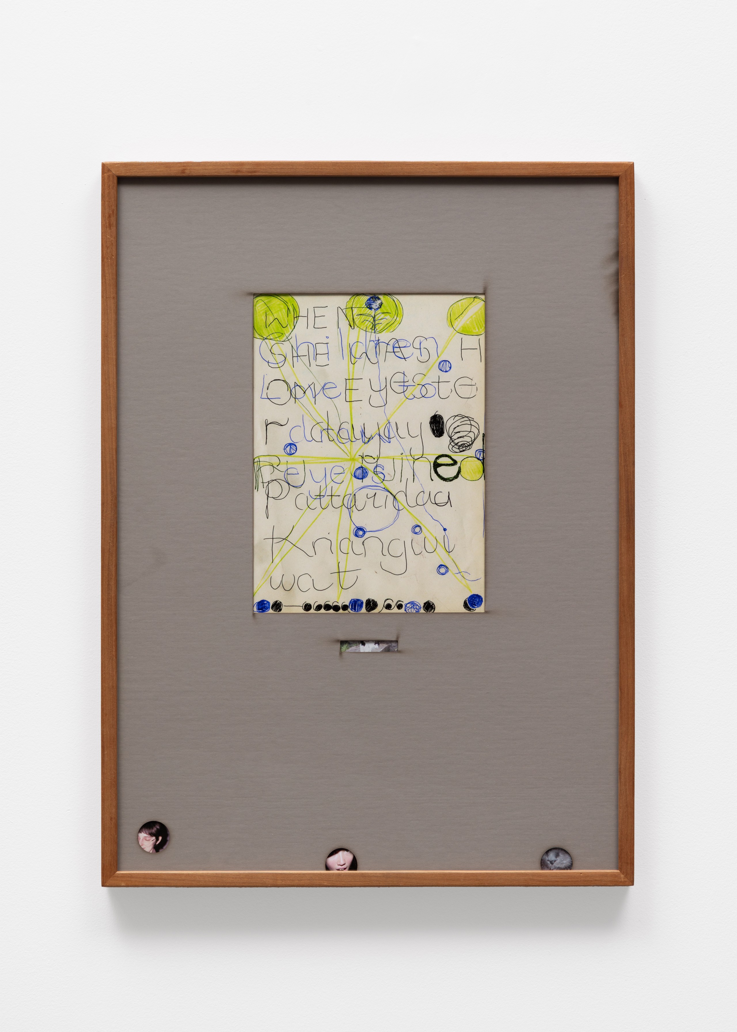 Music, graphic design, and patterning almost take precedent to the image itself within Holmes’ work. This is to say her interest lies in the way in which the frame is the critical moment to make sense of meaning, affect, and connotation. Take, for example, her use of matboard. Typically used as a sort of pedestal for an image-based work, it is akin to a spotlight, honing our attention to the composition as a whole within the larger structure of a frame. In her case, it sits halfway; her images are mounted underneath in a passe-partout but rather framing in the whole of the composition, they obfuscate the bulk of the picture. However, geometric cut-outs and peepholes re-hone our focus in the form, and thus constitute an almost dialectical negotiation of the mat’s function.