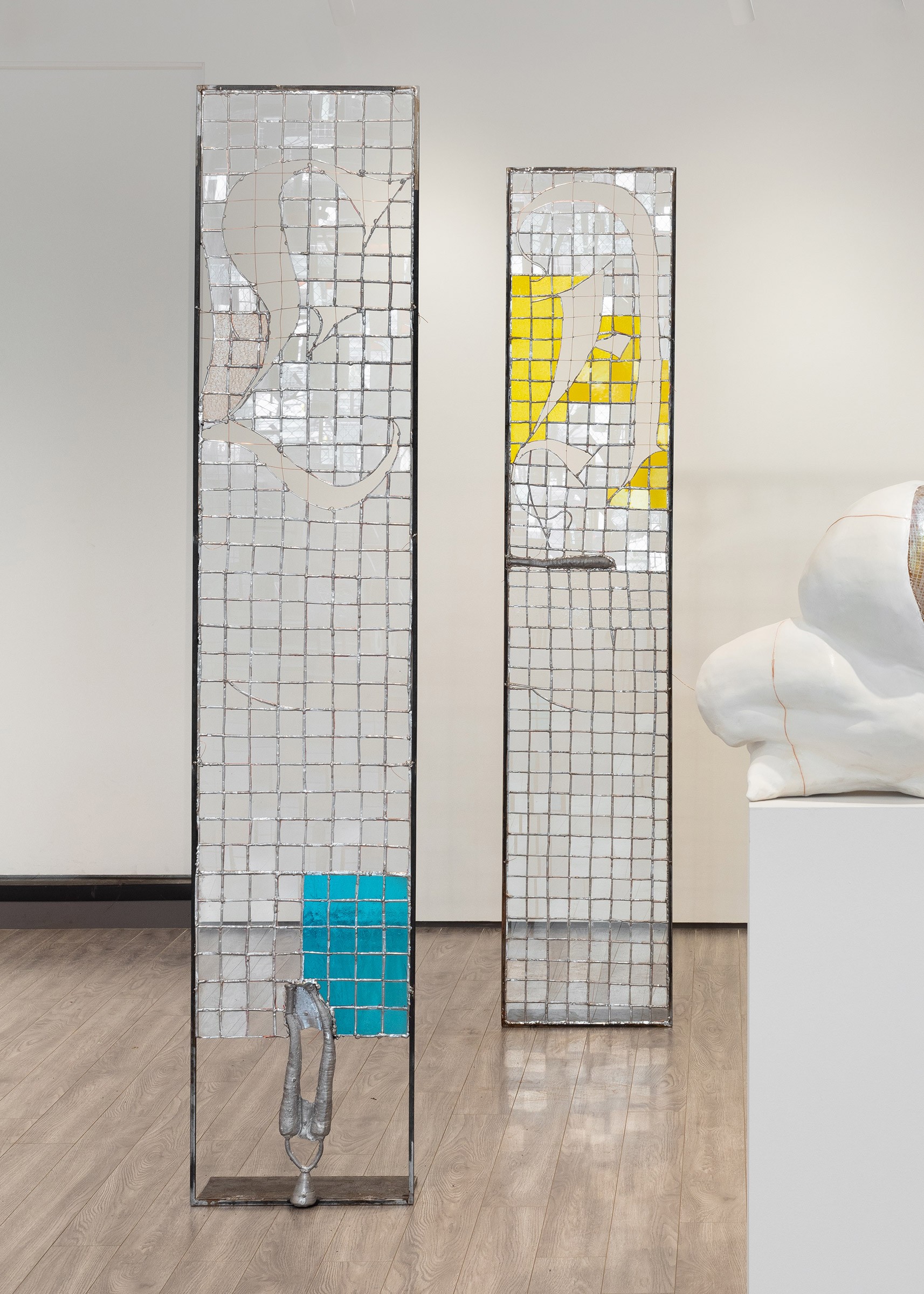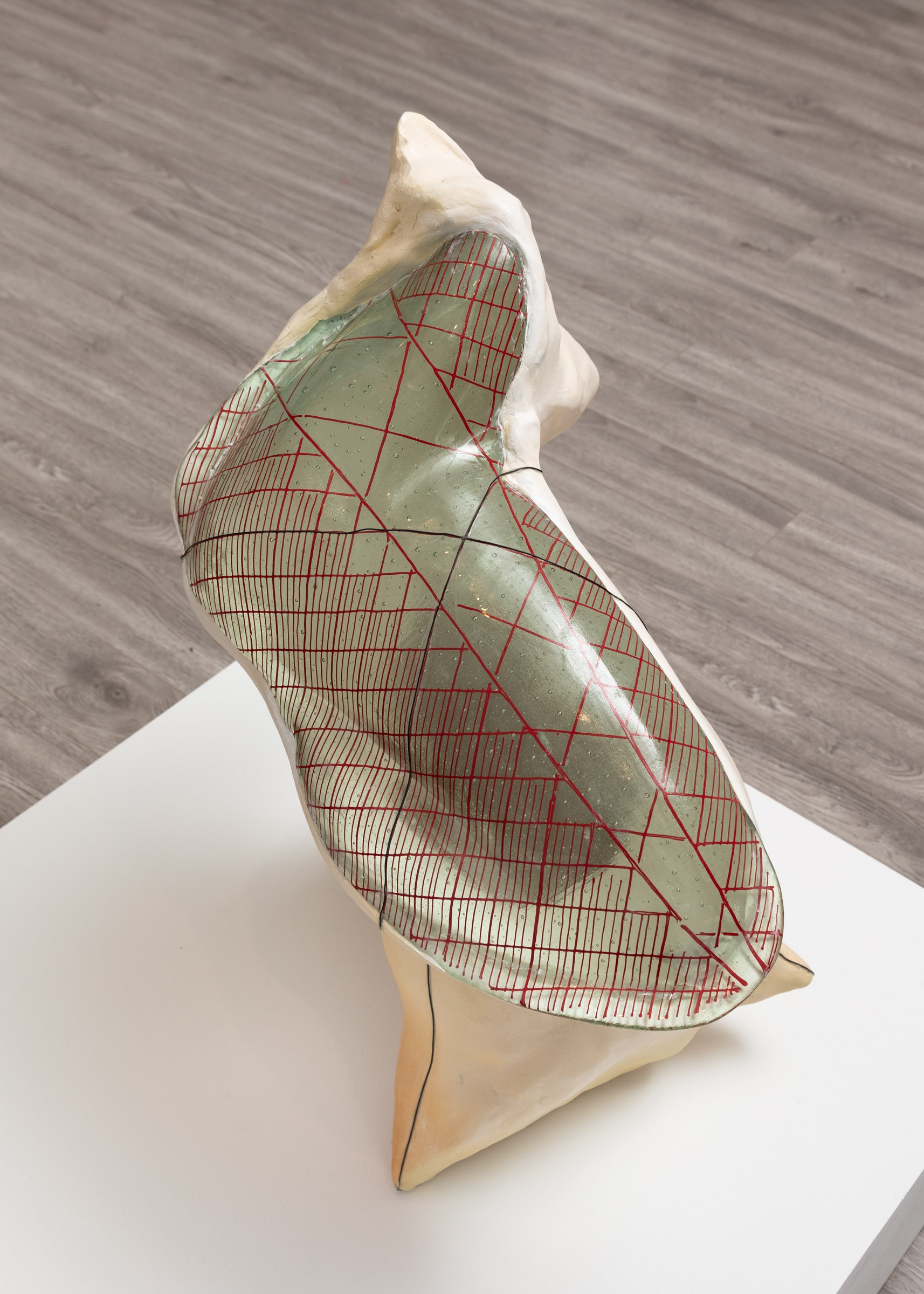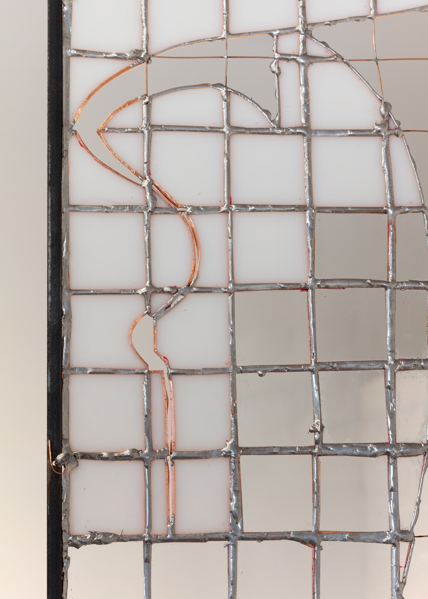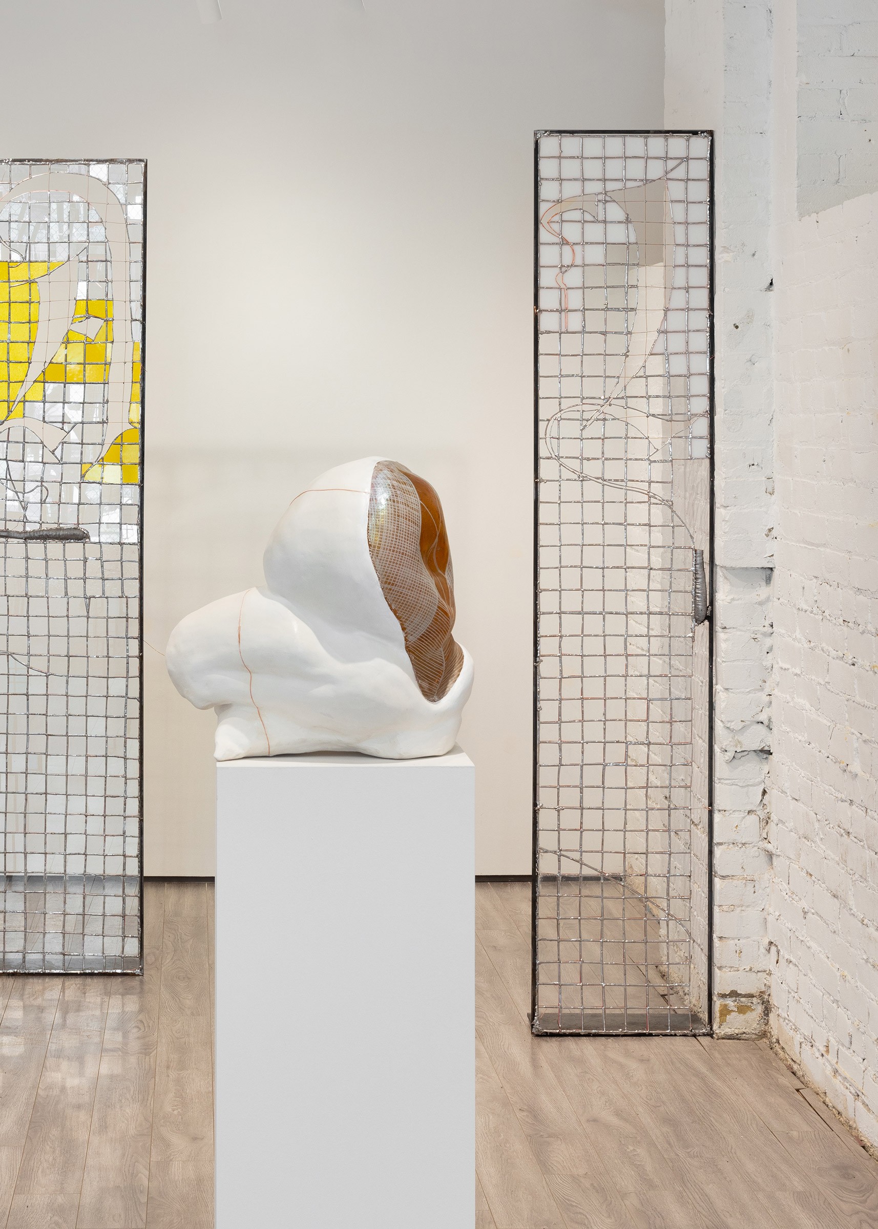 McKenzie’s figures reveal themselves from behind these screens, and their very materiality too becomes transparent. The problems of visibility and legibility plague the ever-shifting perceptual status of these figures; their glass flesh disappearing into linework–like graph paper, fishnet stockings, or construction safety vest; labour scripts– inscribed upon it like clothing that can never be removed. These bodies disappear behind the signifier written onto them, becoming transparent, invisible under the obfuscating linework. The body’s inscription then, becomes more legible than the body itself; an emphasis so strong that it makes the whole unavailable. They selectively screen themselves off from the gaze: cut by window panes and contorting out of view, like a landscape stretching beyond sight. Presentation becomes an act of refusal as much as availability: emphasis can blind the surveyor by constraining the reach of their gaze.