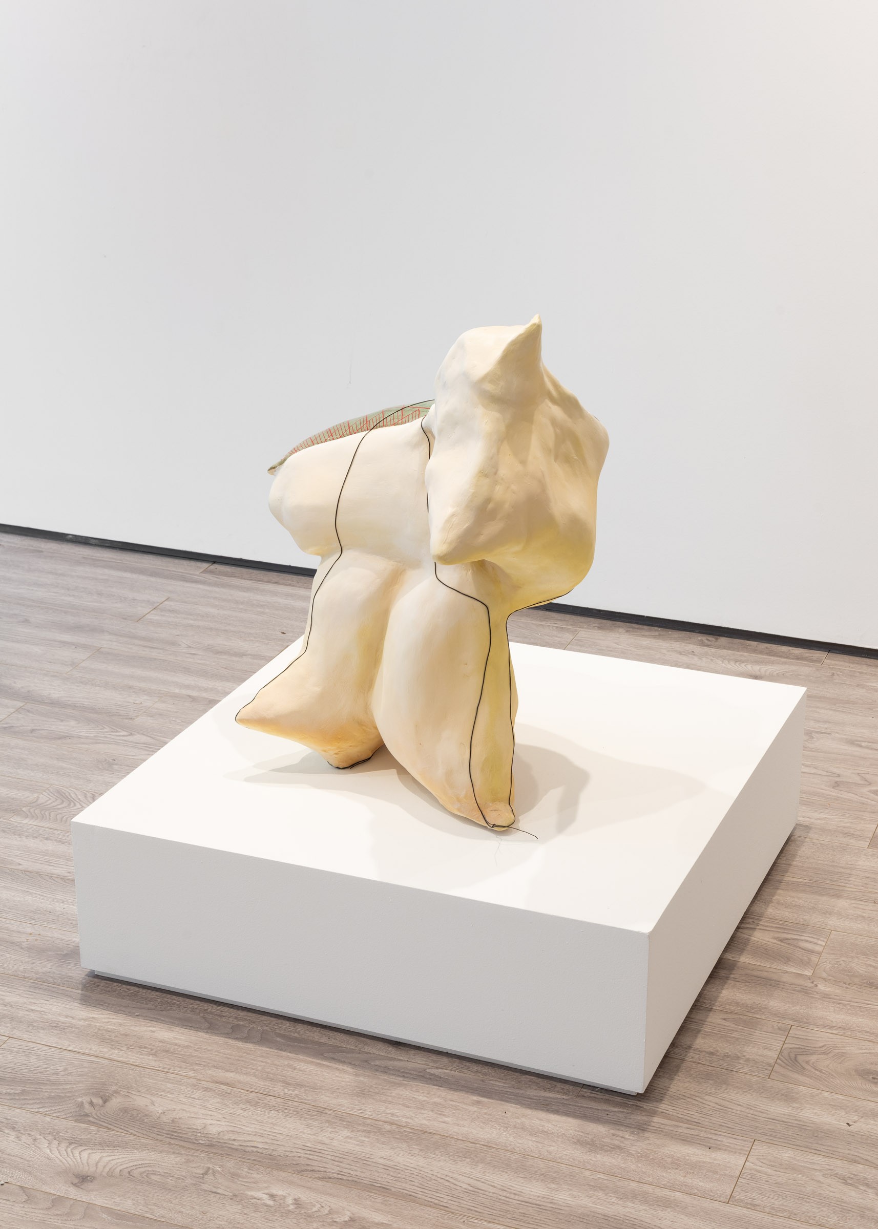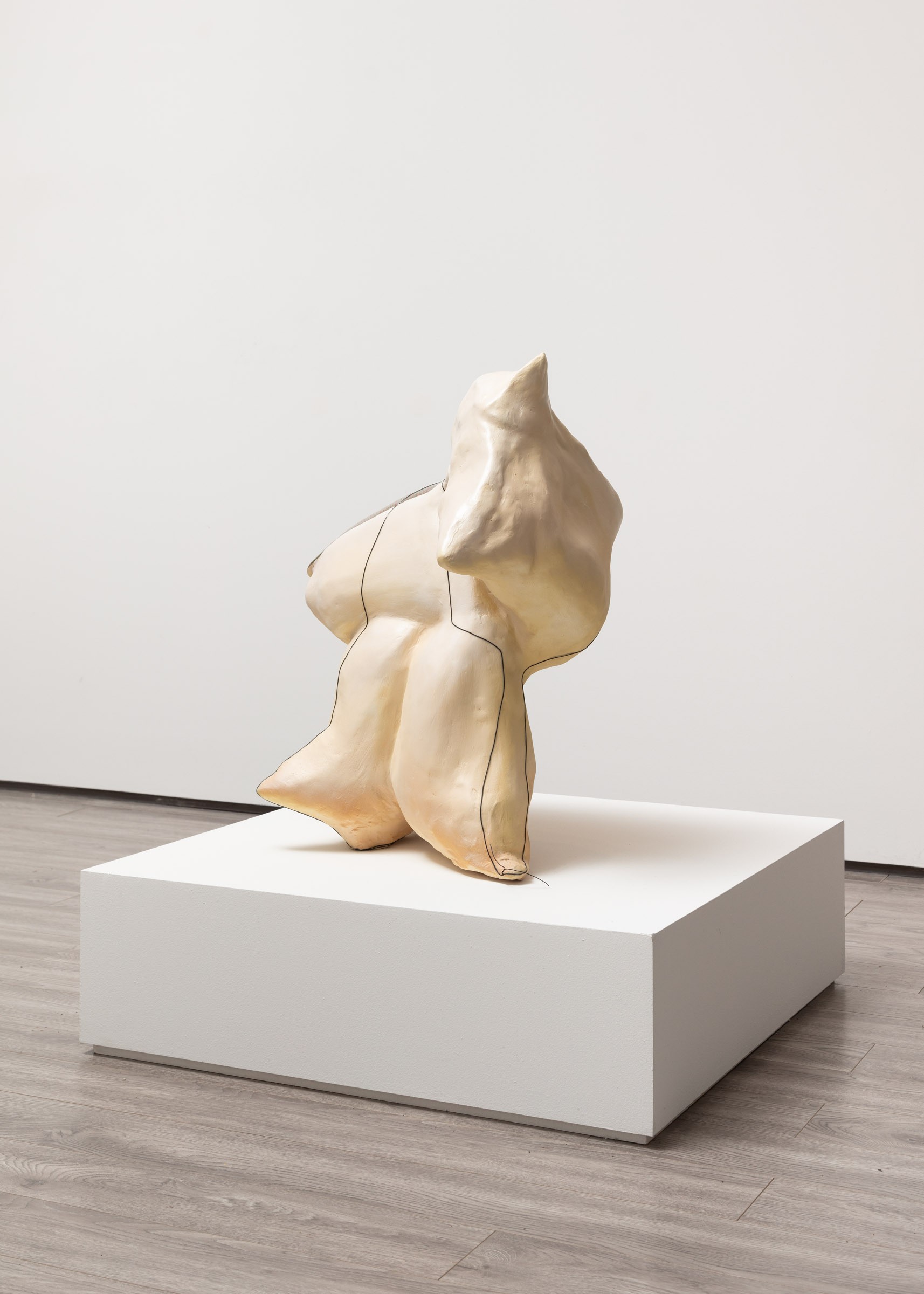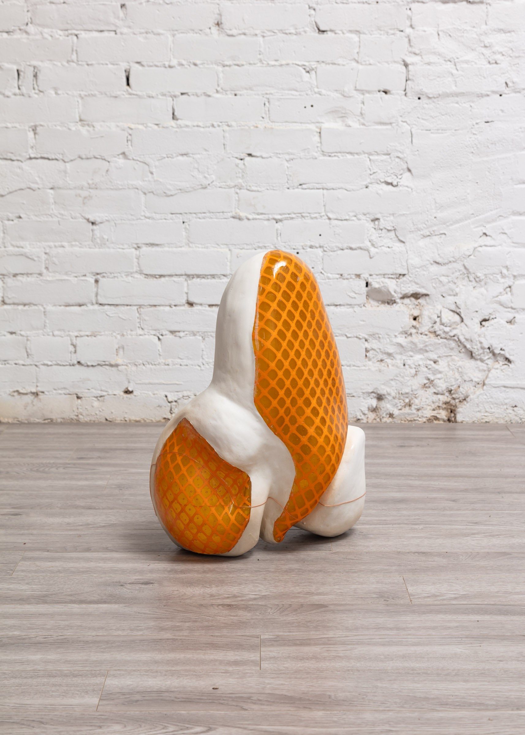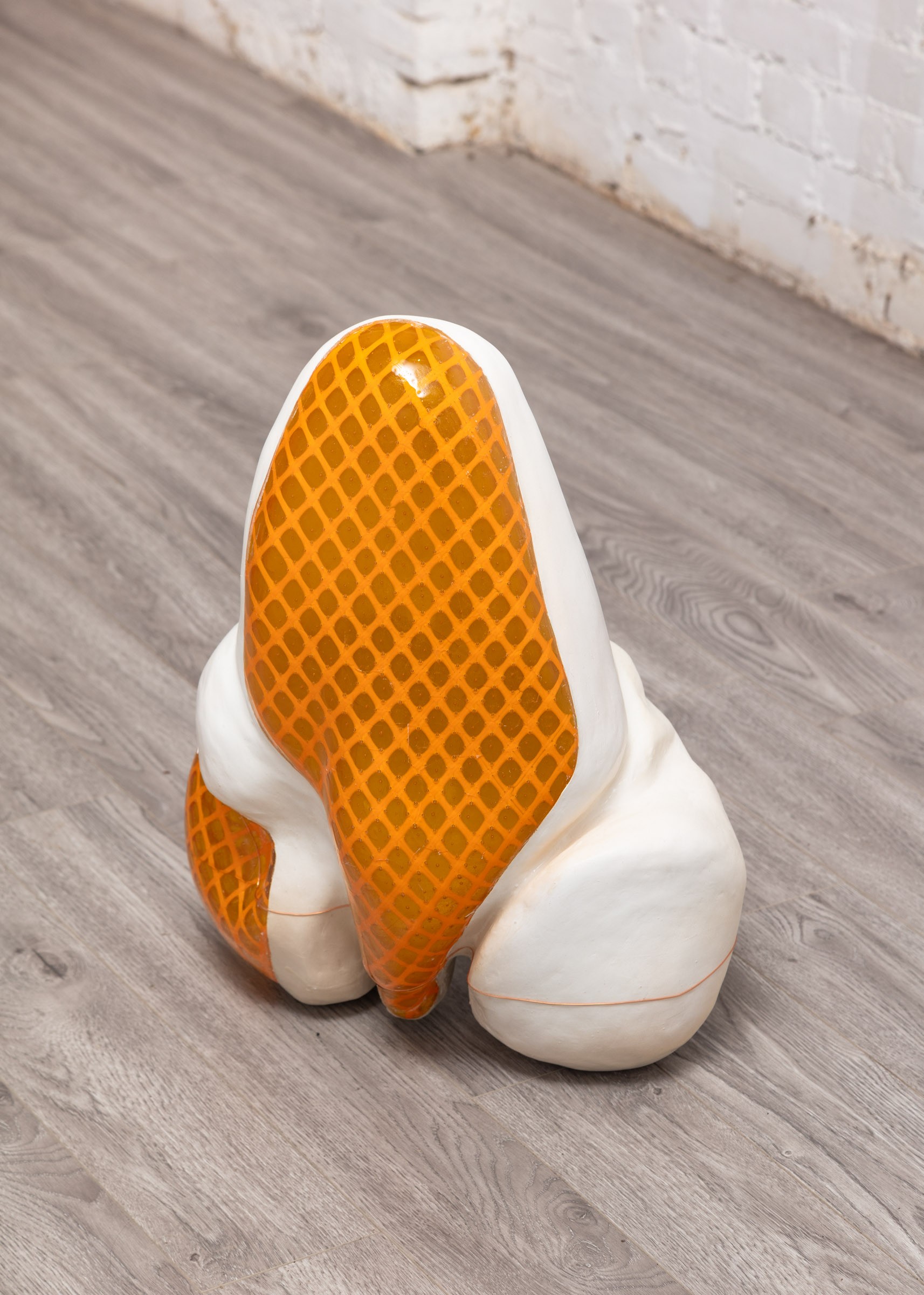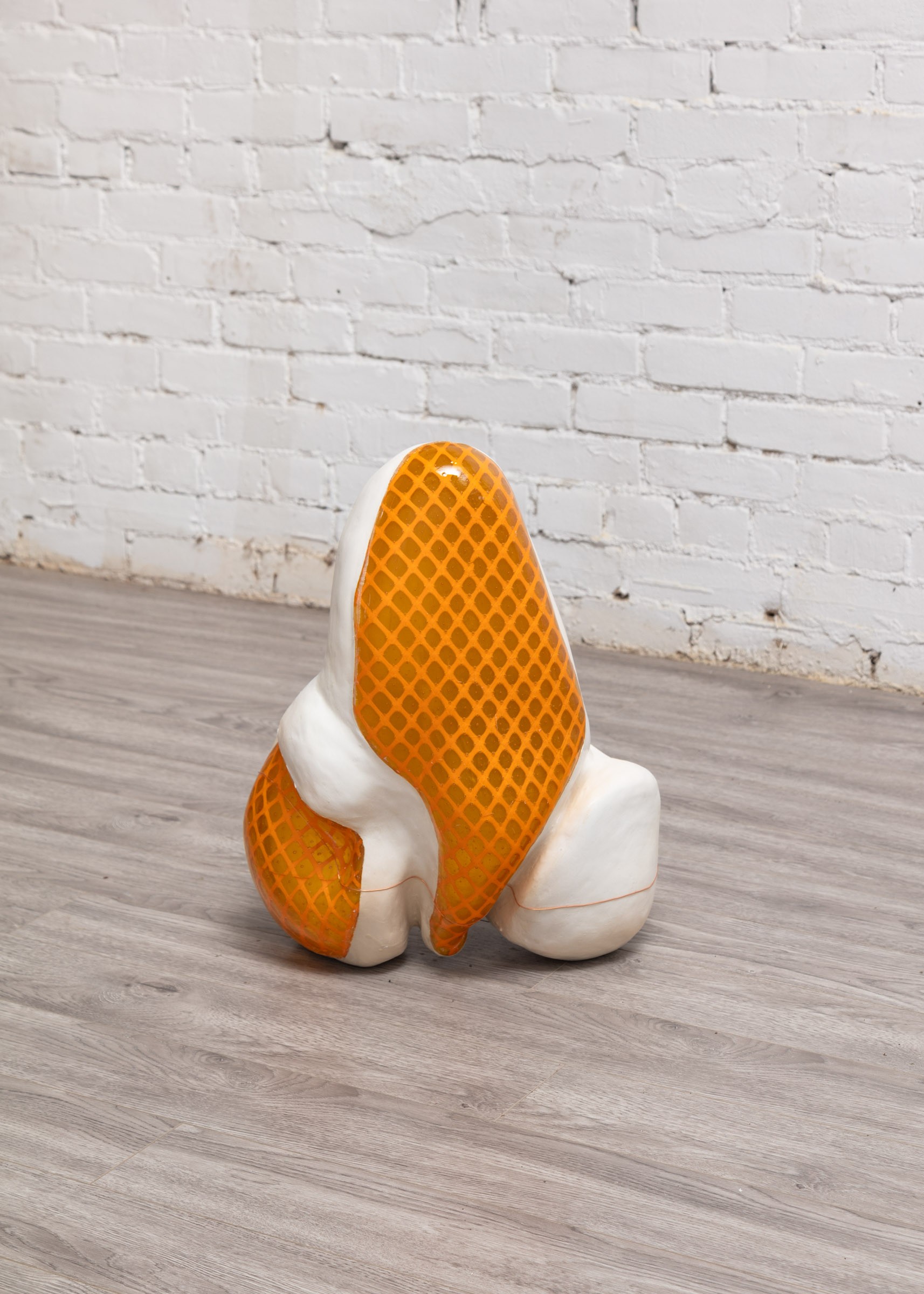 McKenzie’s figures reveal themselves from behind these screens, and their very materiality too becomes transparent. The problems of visibility and legibility plague the ever-shifting perceptual status of these figures; their glass flesh disappearing into linework–like graph paper, fishnet stockings, or construction safety vest; labour scripts– inscribed upon it like clothing that can never be removed. These bodies disappear behind the signifier written onto them, becoming transparent, invisible under the obfuscating linework. The body’s inscription then, becomes more legible than the body itself; an emphasis so strong that it makes the whole unavailable. They selectively screen themselves off from the gaze: cut by window panes and contorting out of view, like a landscape stretching beyond sight. Presentation becomes an act of refusal as much as availability: emphasis can blind the surveyor by constraining the reach of their gaze.