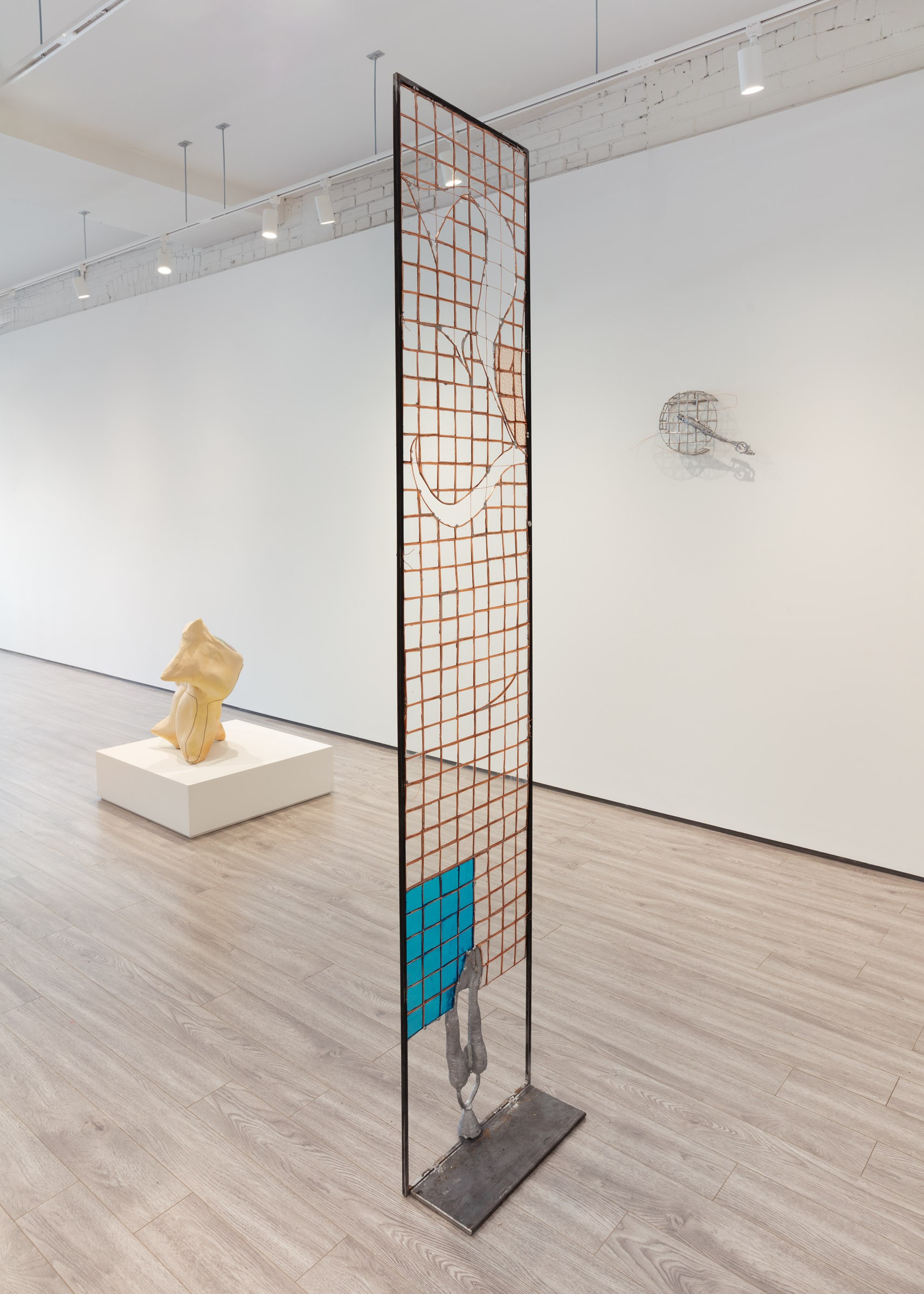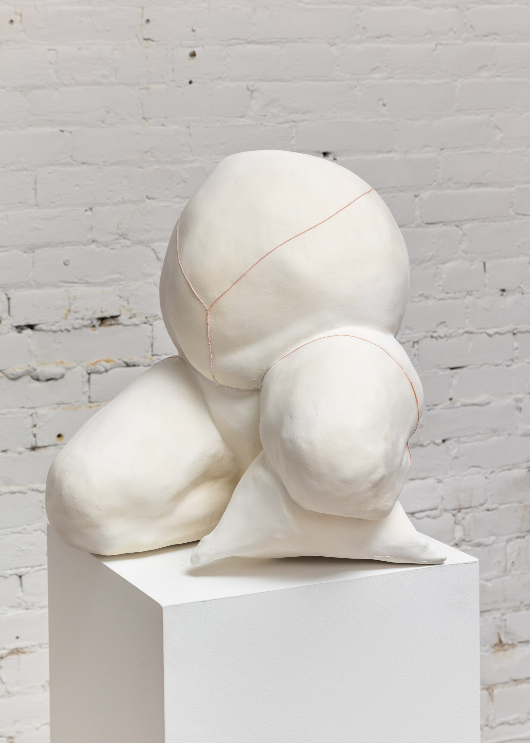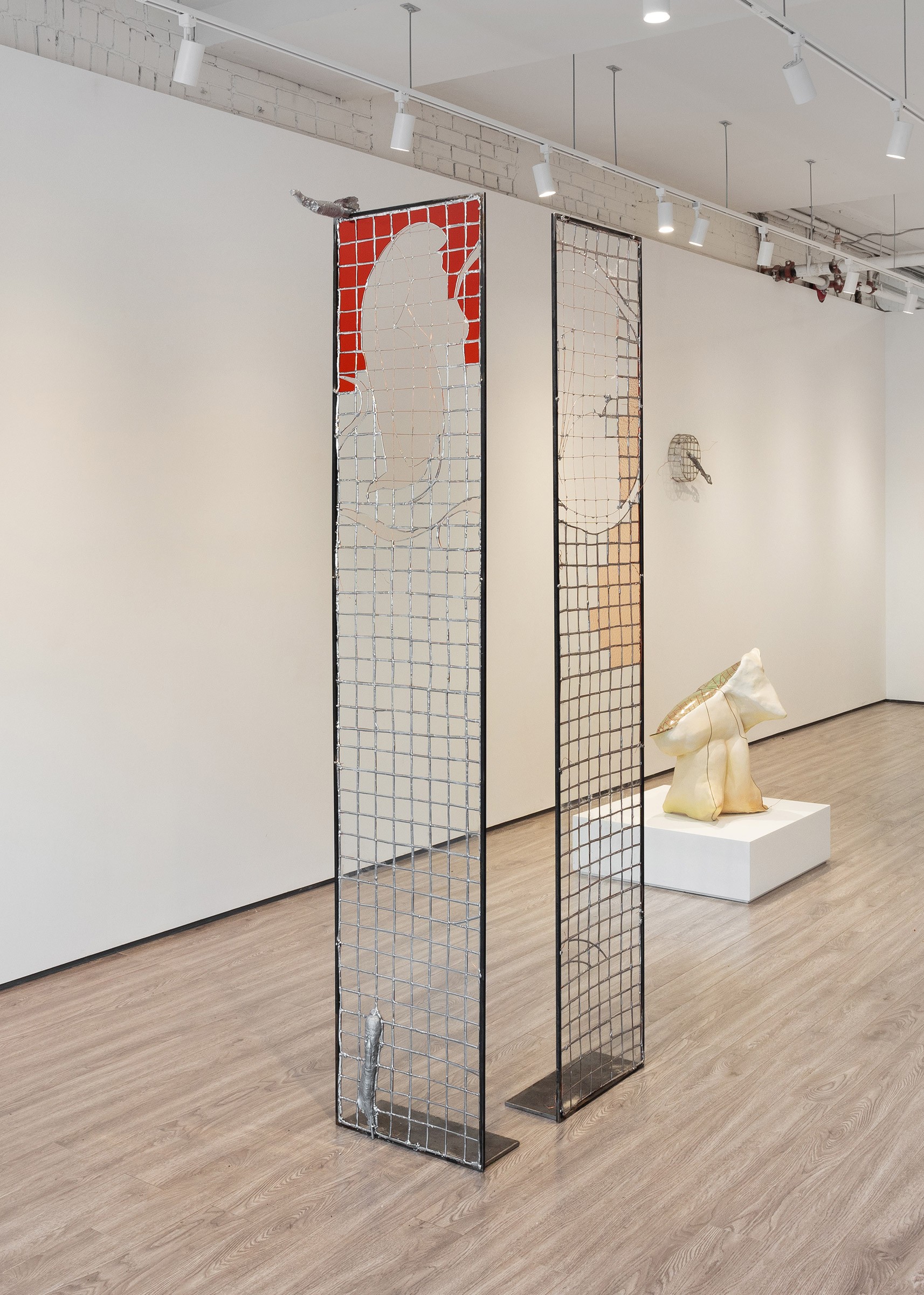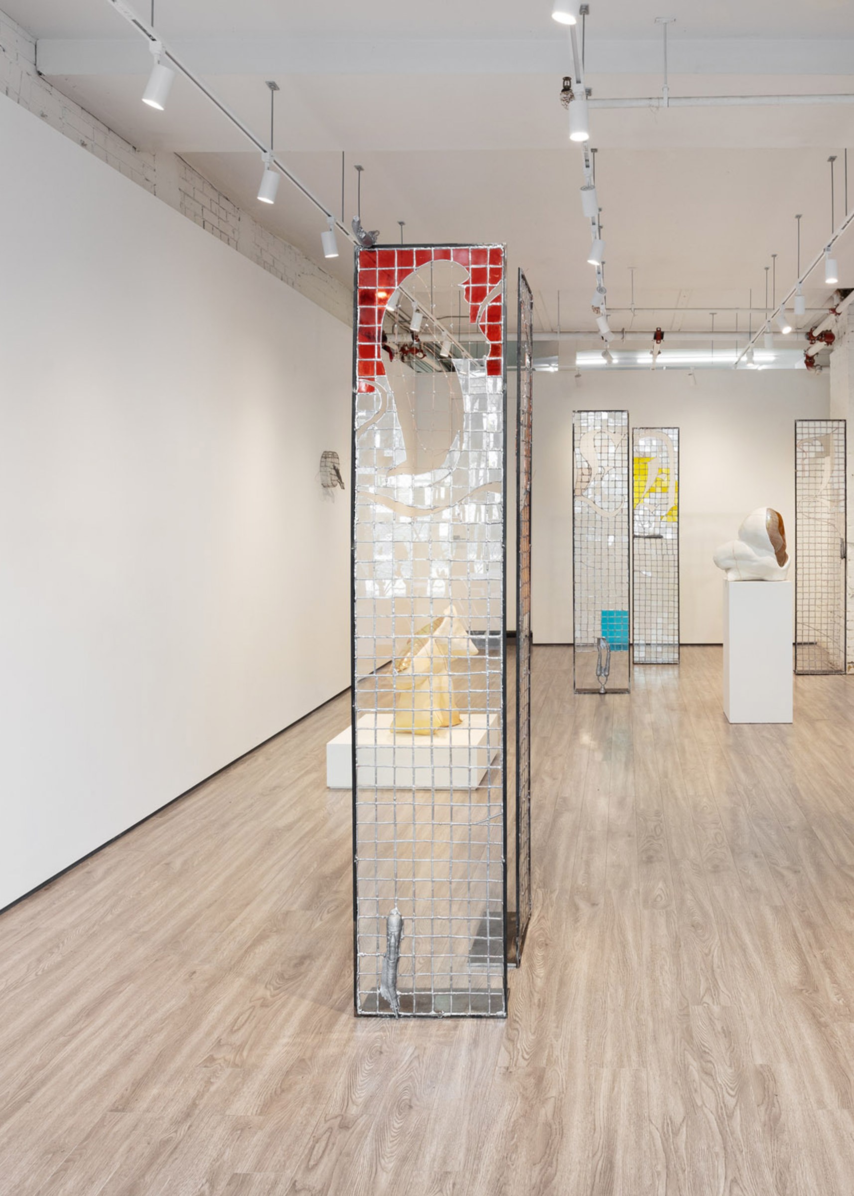 McKenzie’s figures reveal themselves from behind these screens, and their very materiality too becomes transparent. The problems of visibility and legibility plague the ever-shifting perceptual status of these figures; their glass flesh disappearing into linework–like graph paper, fishnet stockings, or construction safety vest; labour scripts– inscribed upon it like clothing that can never be removed. These bodies disappear behind the signifier written onto them, becoming transparent, invisible under the obfuscating linework. The body’s inscription then, becomes more legible than the body itself; an emphasis so strong that it makes the whole unavailable. They selectively screen themselves off from the gaze: cut by window panes and contorting out of view, like a landscape stretching beyond sight. Presentation becomes an act of refusal as much as availability: emphasis can blind the surveyor by constraining the reach of their gaze.