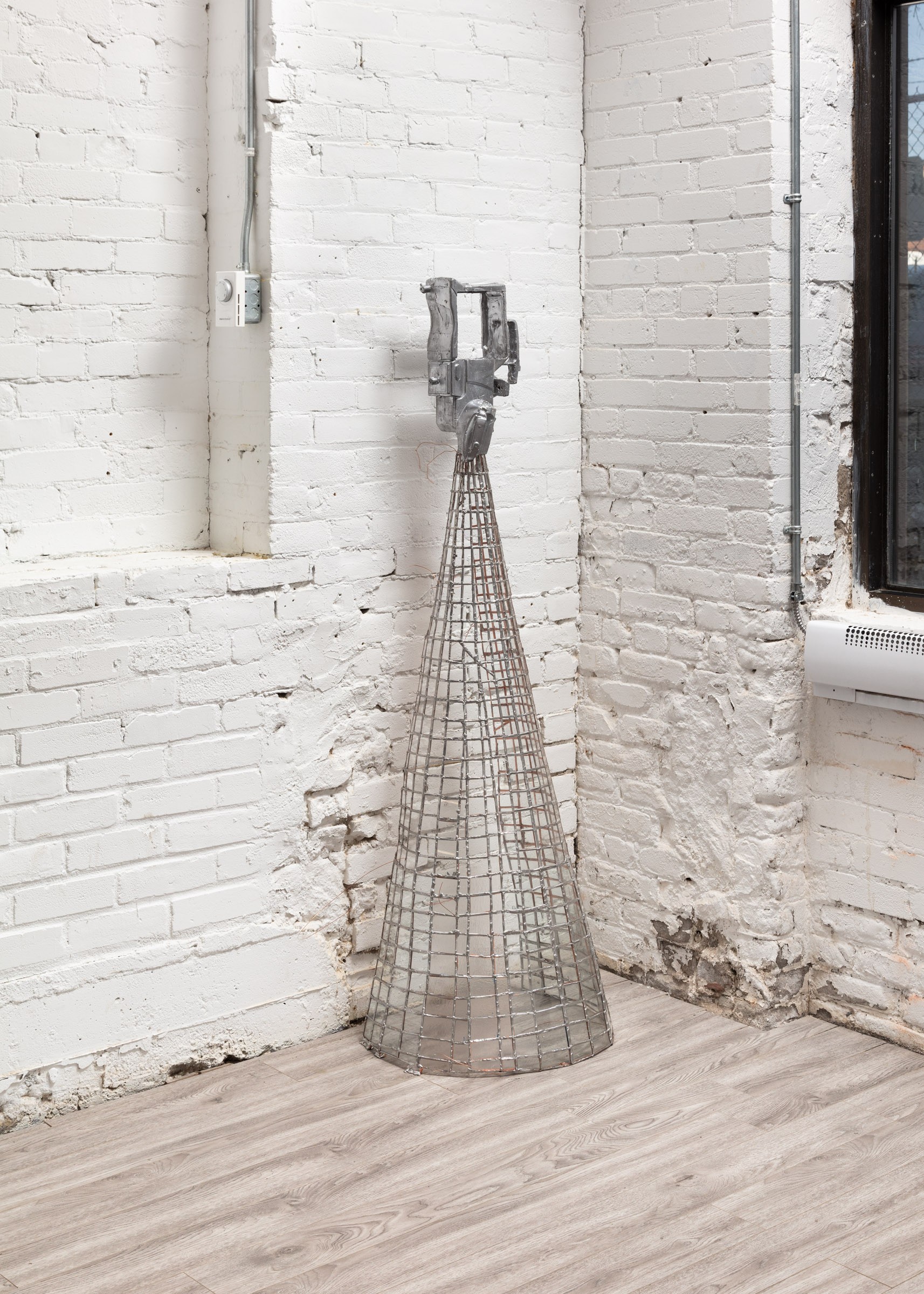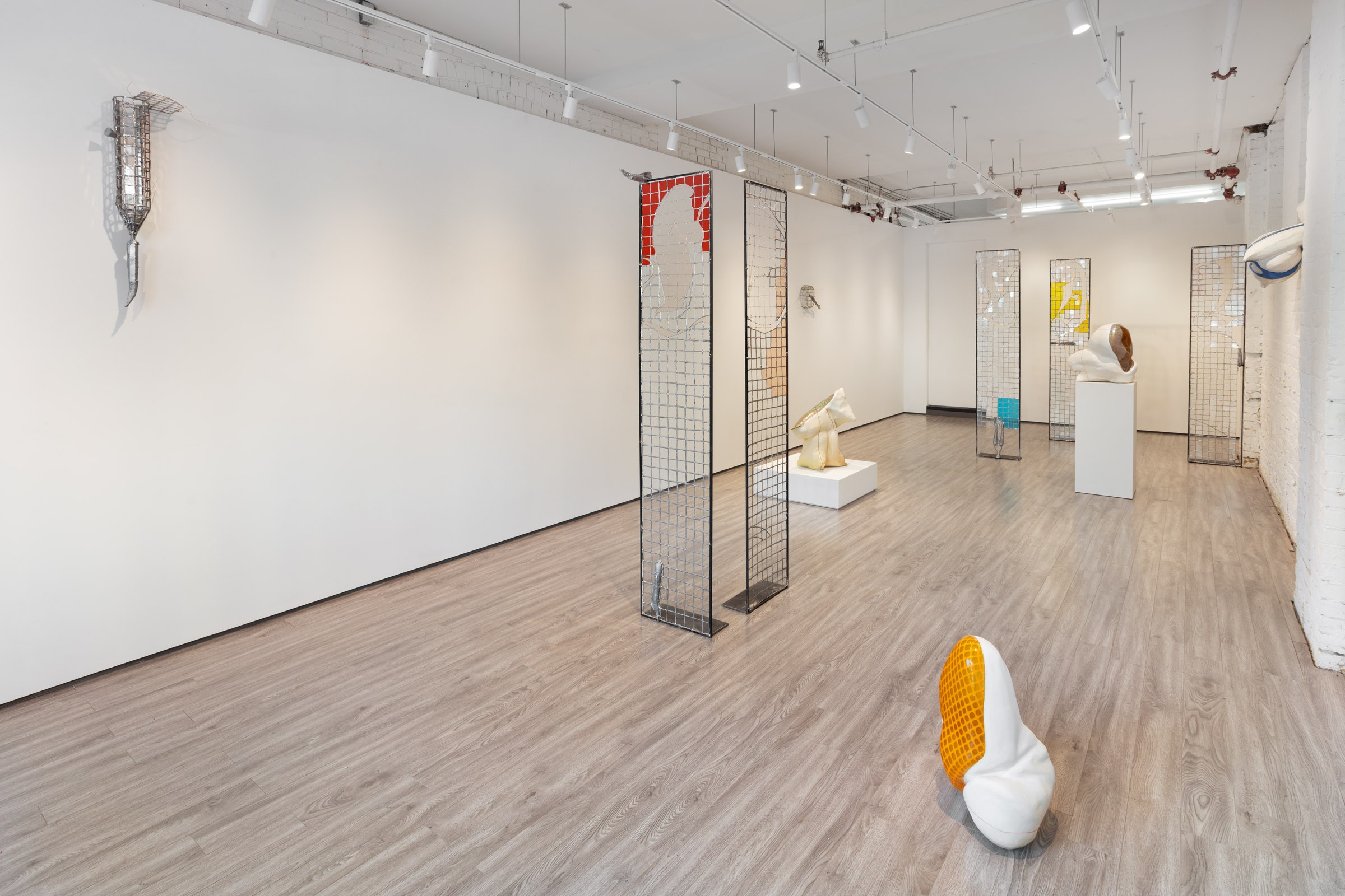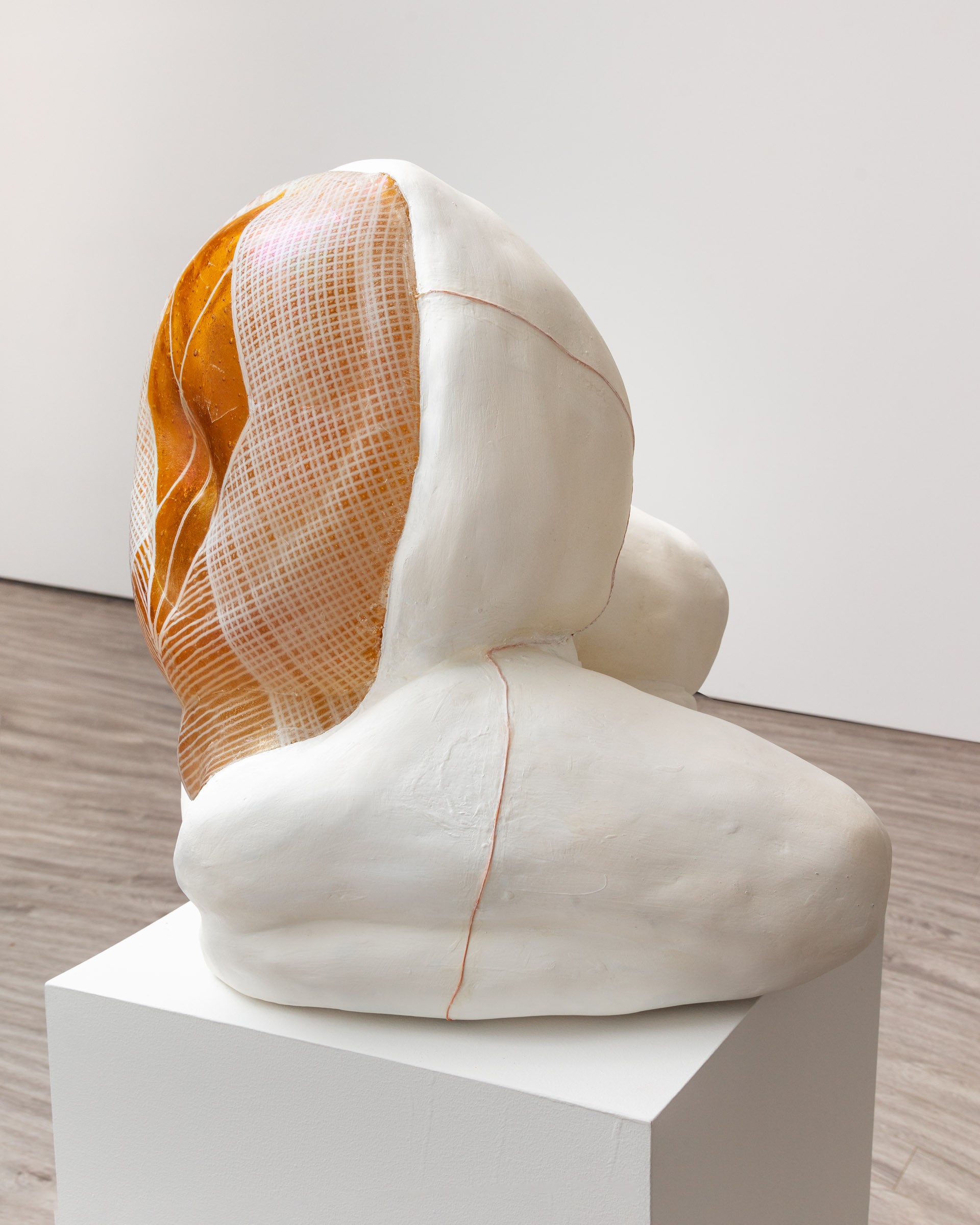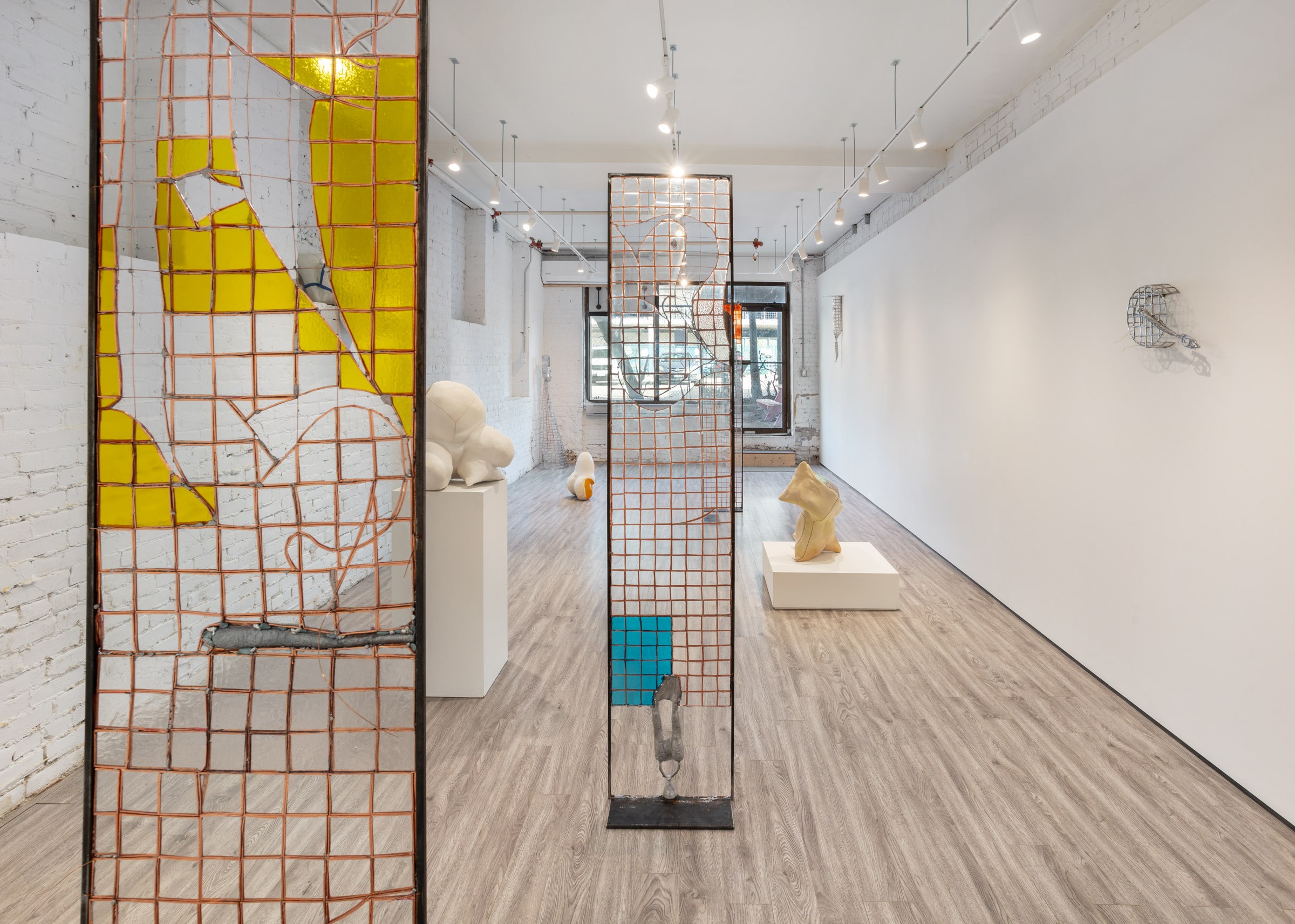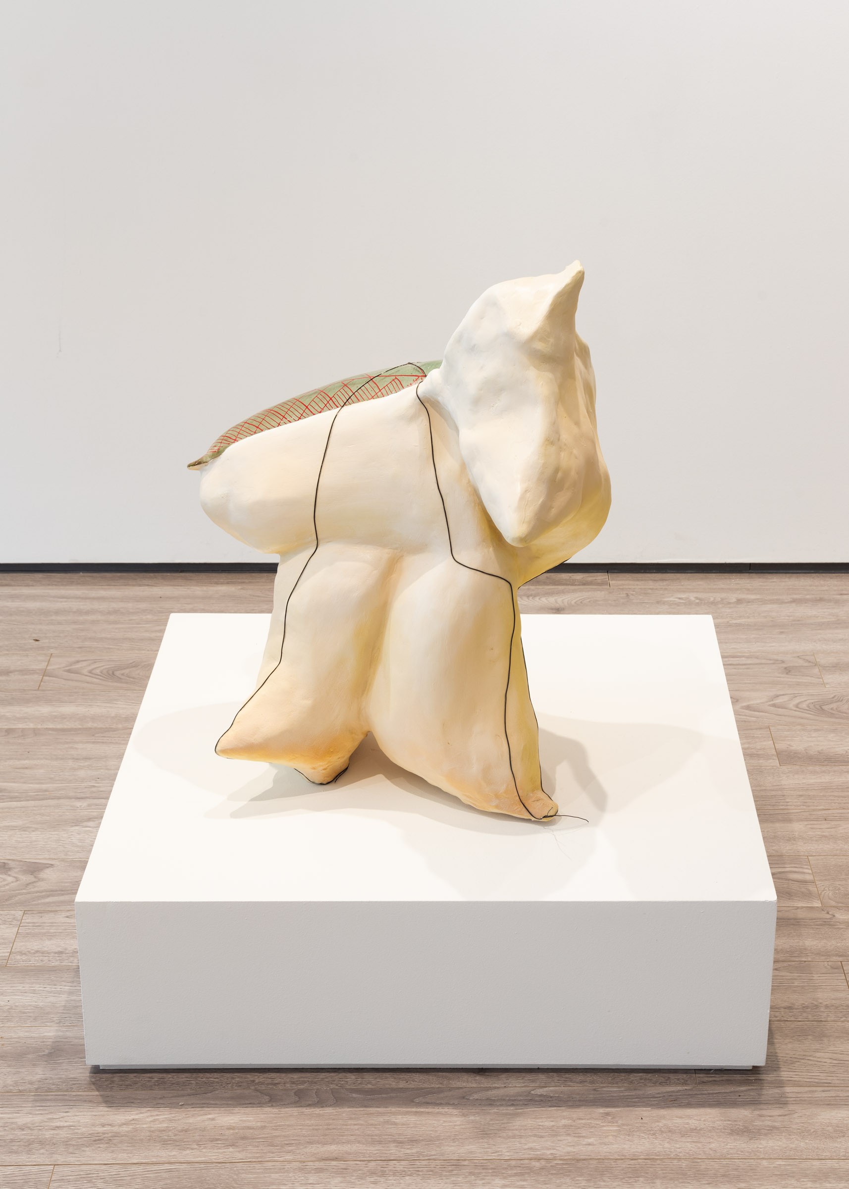 McKenzie’s figures reveal themselves from behind these screens, and their very materiality too becomes transparent. The problems of visibility and legibility plague the ever-shifting perceptual status of these figures; their glass flesh disappearing into linework–like graph paper, fishnet stockings, or construction safety vest; labour scripts– inscribed upon it like clothing that can never be removed. These bodies disappear behind the signifier written onto them, becoming transparent, invisible under the obfuscating linework. The body’s inscription then, becomes more legible than the body itself; an emphasis so strong that it makes the whole unavailable. They selectively screen themselves off from the gaze: cut by window panes and contorting out of view, like a landscape stretching beyond sight. Presentation becomes an act of refusal as much as availability: emphasis can blind the surveyor by constraining the reach of their gaze.