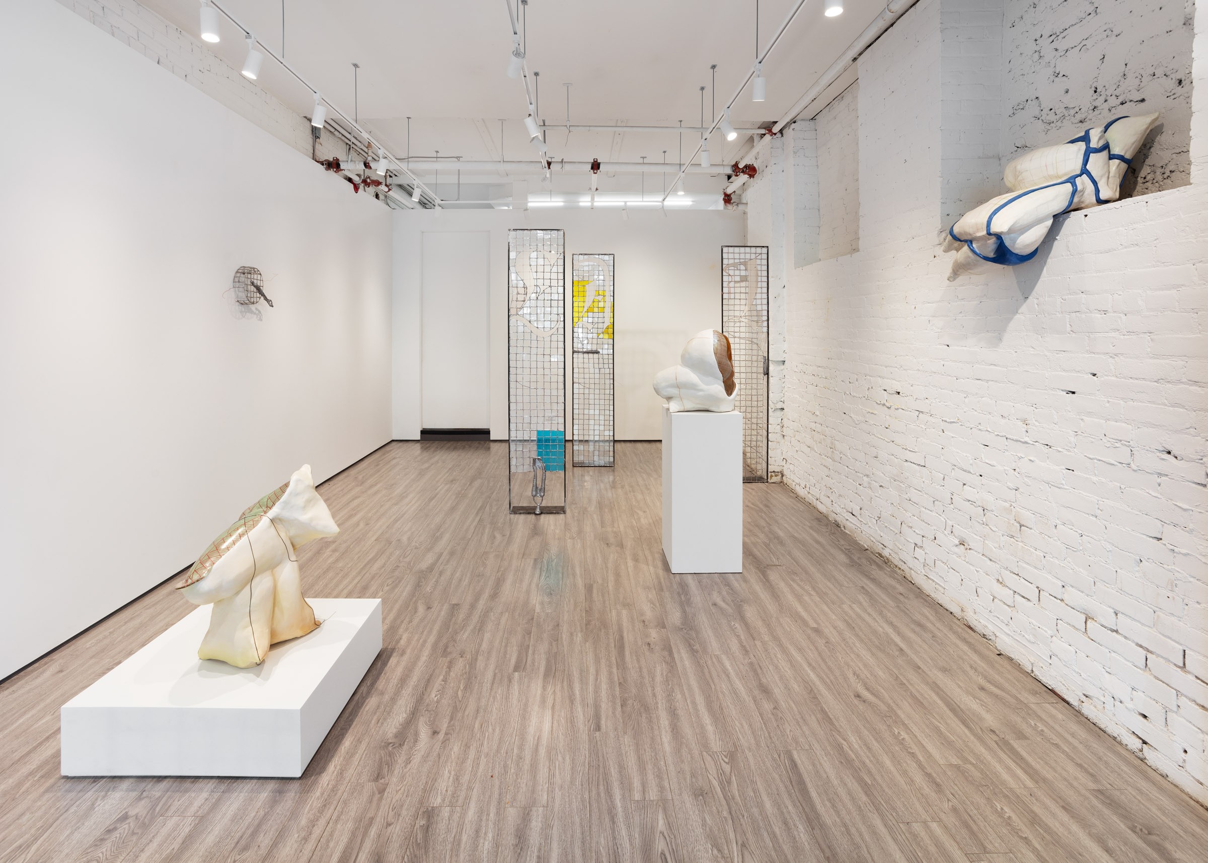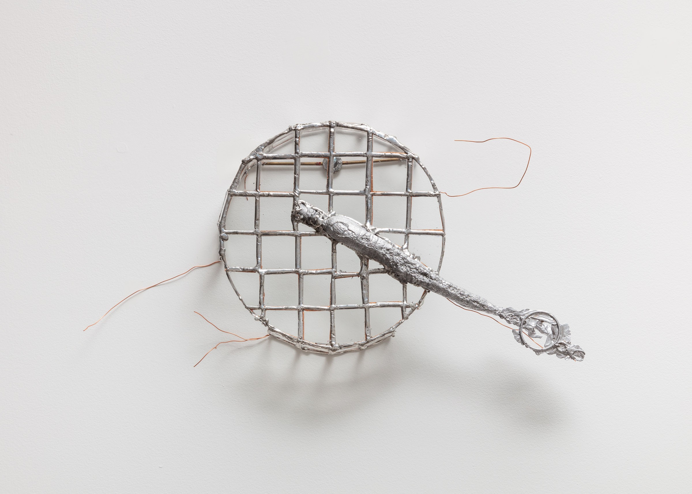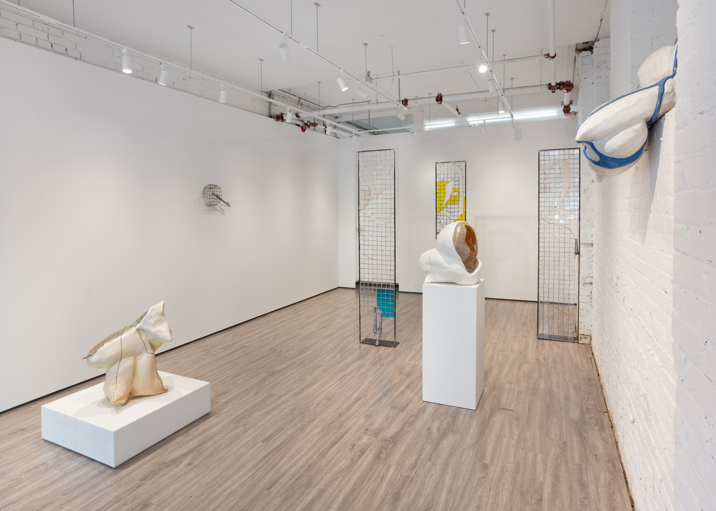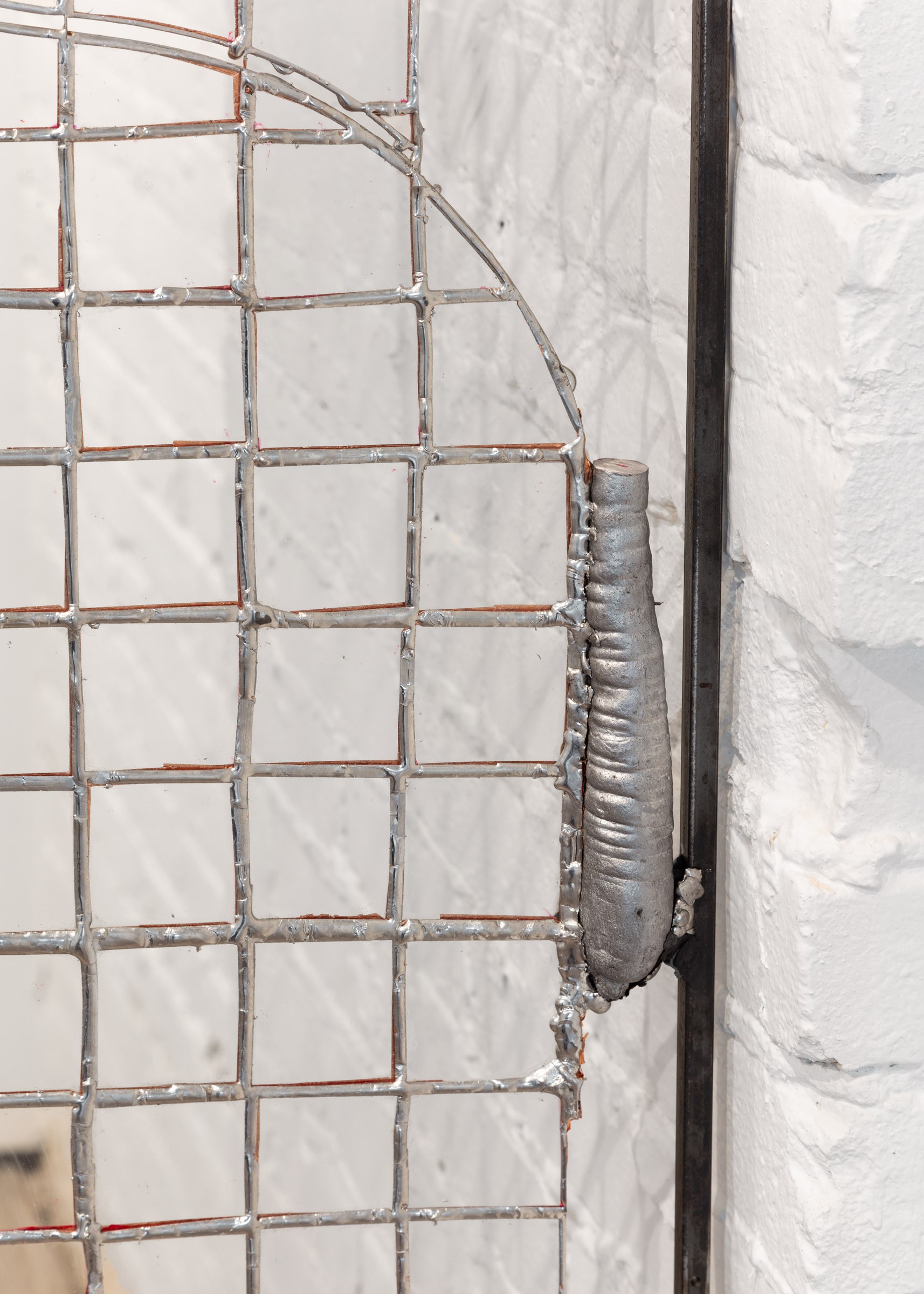 McKenzie’s figures reveal themselves from behind these screens, and their very materiality too becomes transparent. The problems of visibility and legibility plague the ever-shifting perceptual status of these figures; their glass flesh disappearing into linework–like graph paper, fishnet stockings, or construction safety vest; labour scripts– inscribed upon it like clothing that can never be removed. These bodies disappear behind the signifier written onto them, becoming transparent, invisible under the obfuscating linework. The body’s inscription then, becomes more legible than the body itself; an emphasis so strong that it makes the whole unavailable. They selectively screen themselves off from the gaze: cut by window panes and contorting out of view, like a landscape stretching beyond sight. Presentation becomes an act of refusal as much as availability: emphasis can blind the surveyor by constraining the reach of their gaze.