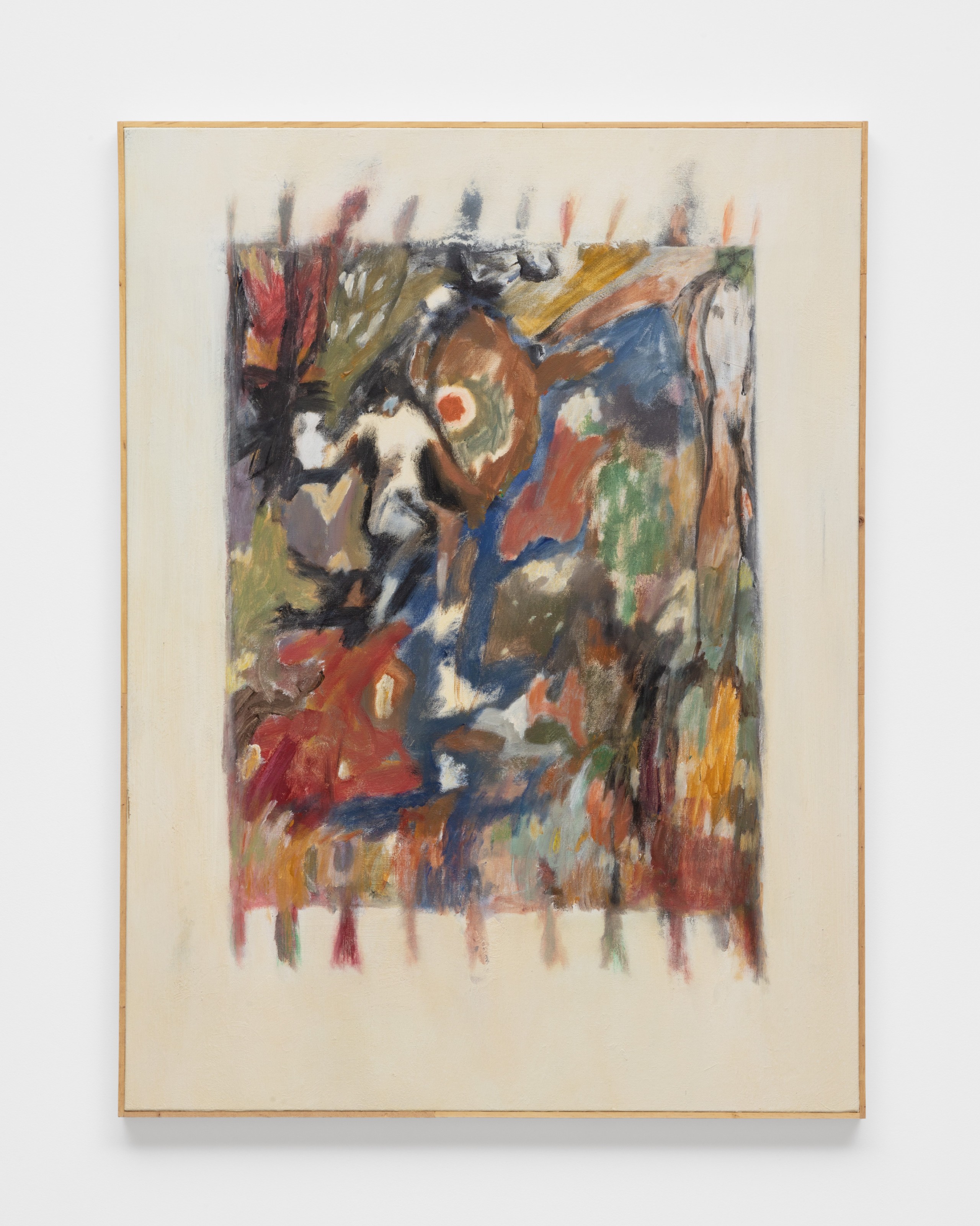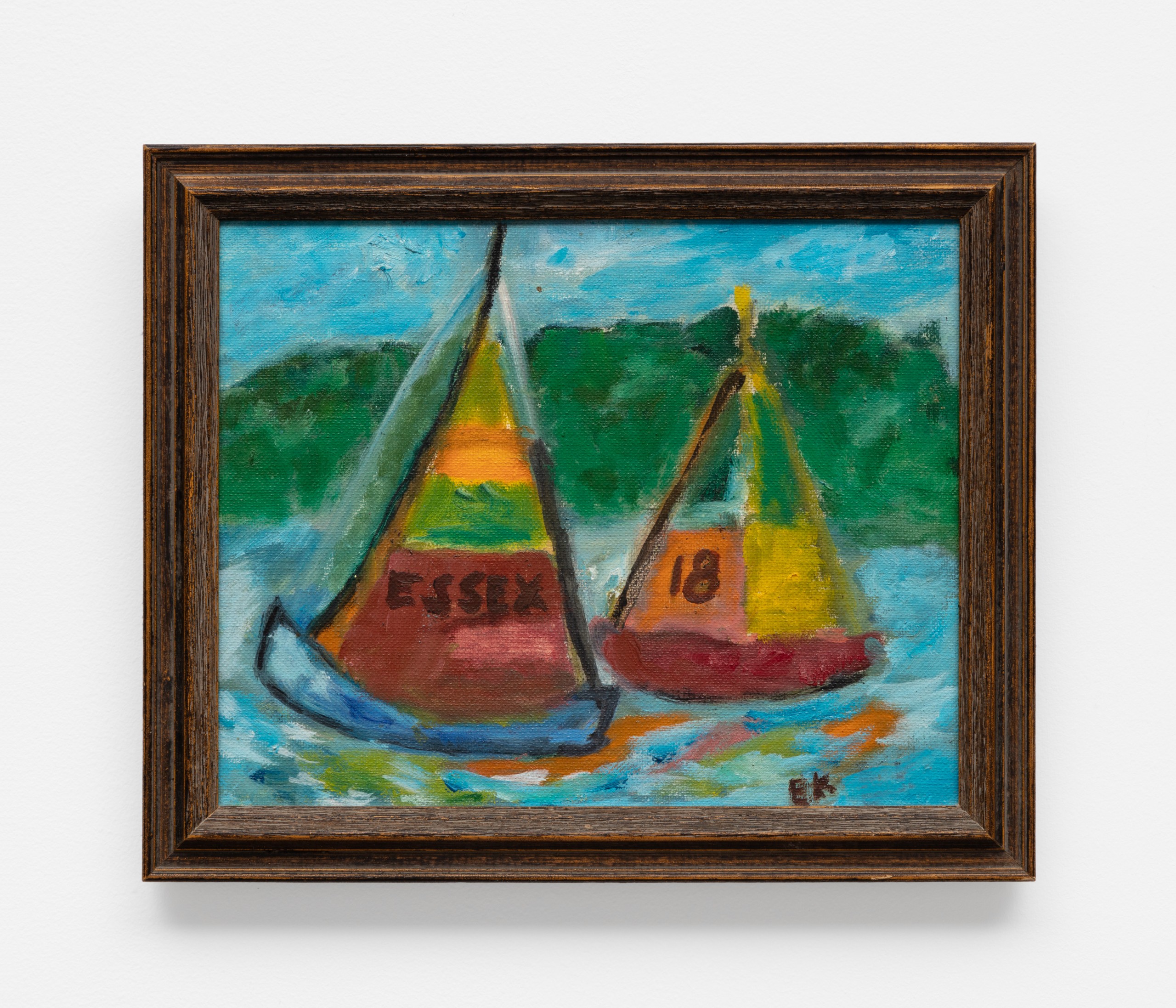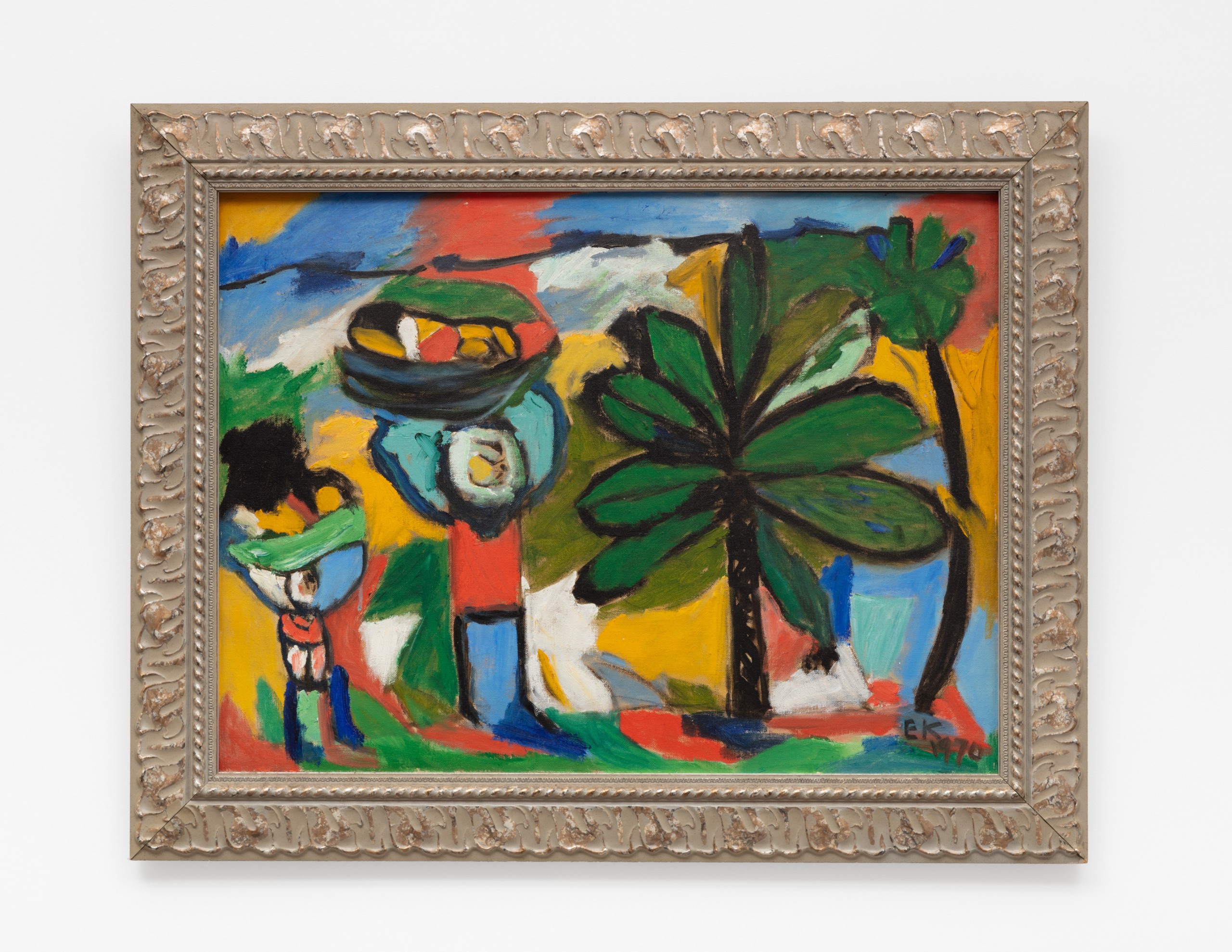 “I’ve been looking at Betty Kingseed’s work for pretty much as long as I can remember. A specific 20 x 16 inch painting with an ornate frame has hung in both houses I grew up in. It is a very loose depiction of two figures, most likely a mother and a child, after they have gathered fruits and vegetables. The palm tree forms they stand alongside are the only other two recognizable objects, as the foreground and background become a blended, abstracted field of interlocking color and shape. This painting, made by a self-taught woman in 1970, in relative seclusion in Southern Connecticut, strikes me.