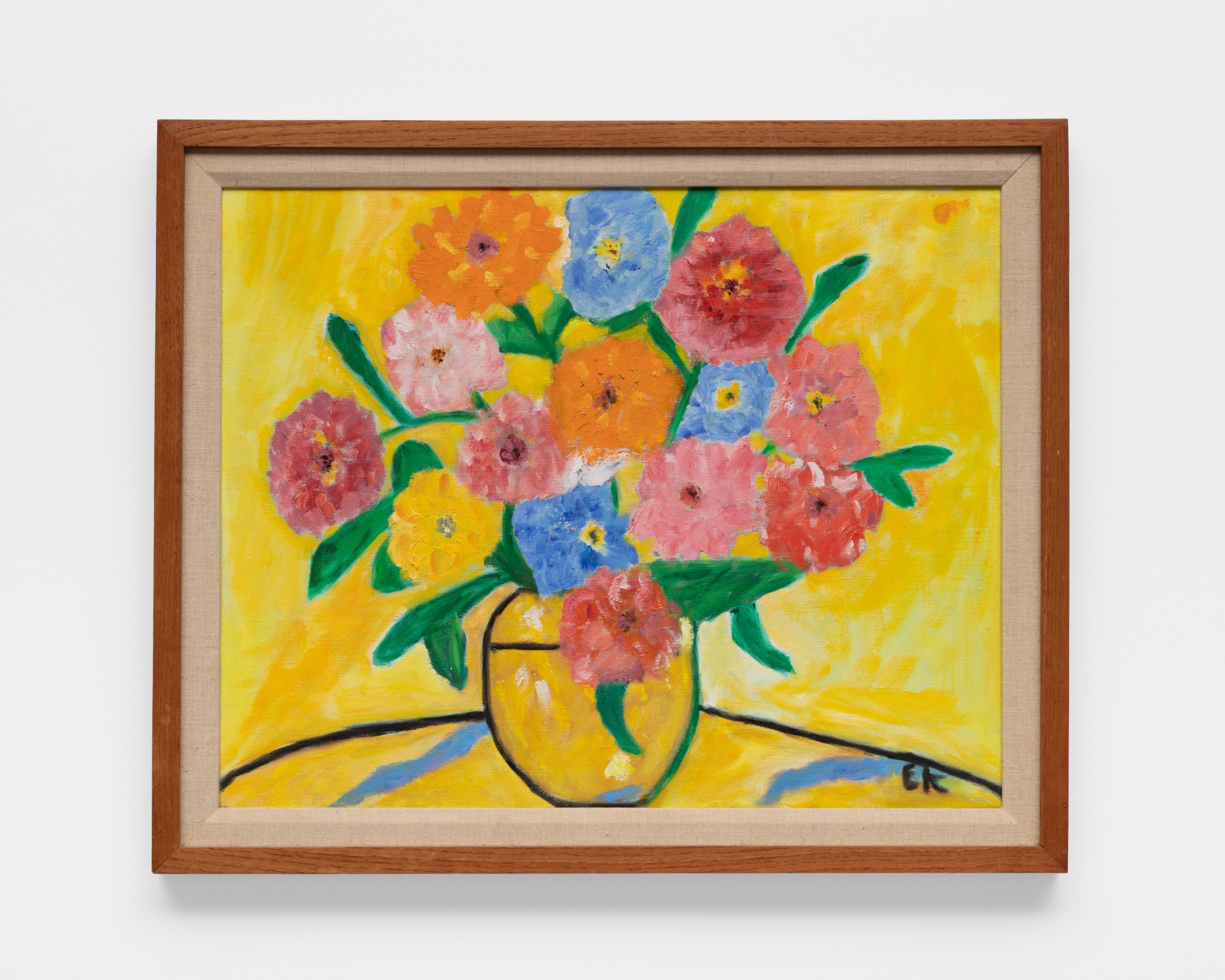 The other flower work is vertical, depicting delphiniums in a centered vase. Green dominates this painting like yellow dominates the other. Strange compositional things happen on each side of the vase, as a bow-like form emerges, a compilation of branches, flowers, and darker lines. Her signature, a casual “EK”, adorns the right corner of every work, with one noting the date being 1970.