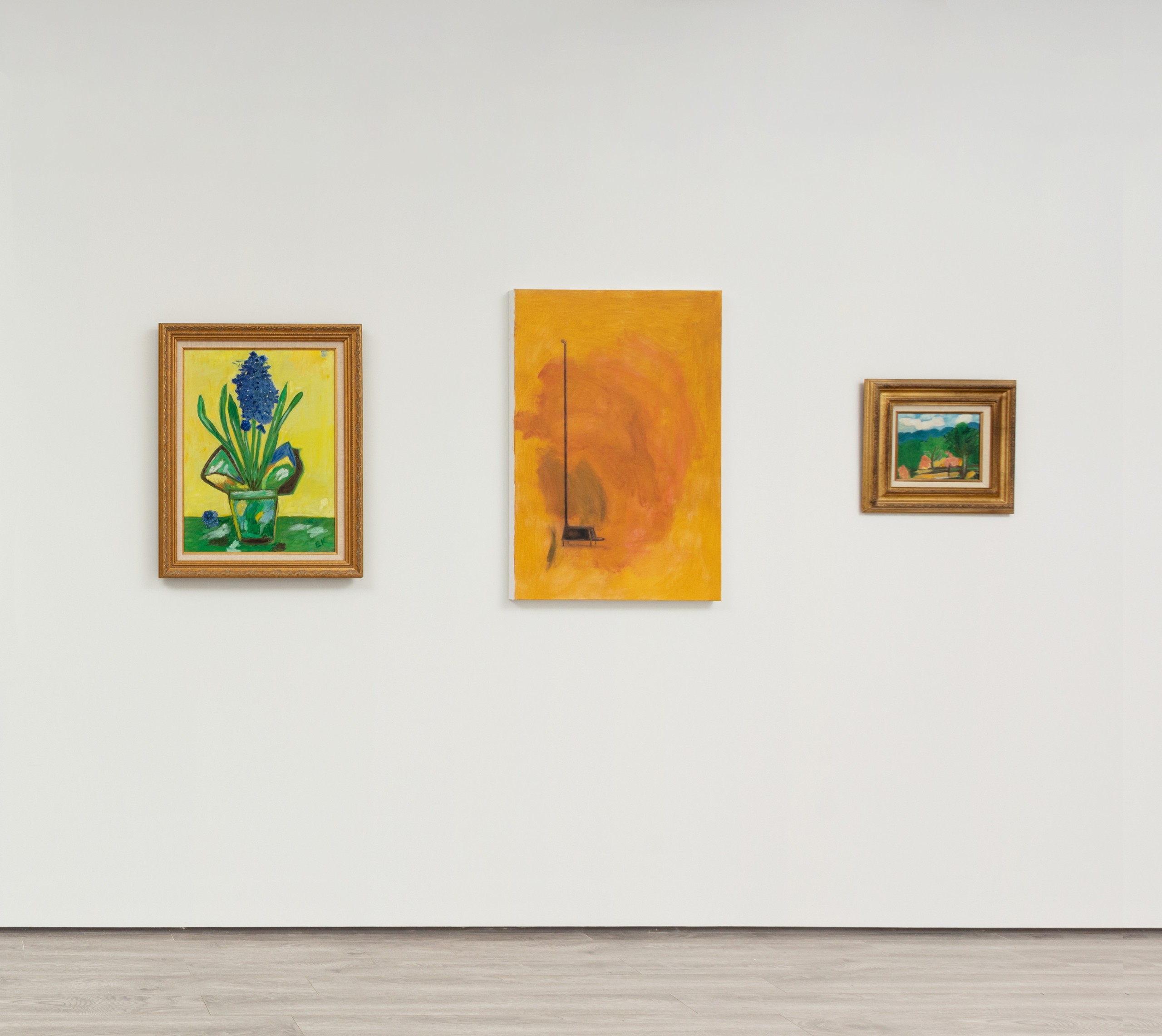 Her two flower paintings are very sparse. One is horizontal, one is vertical. I love the dark black brush strokes depicting a table and vase in the yellow horizontal work. Halfway around the vase, the dark fades to green. Possibly a conscious choice, or also possible the black just ran out. The vase is filled with a range of flowers in different colors. Two strips of blue lay across the table, maybe representing dead clippings, or maybe just an attempt at painterly flair.