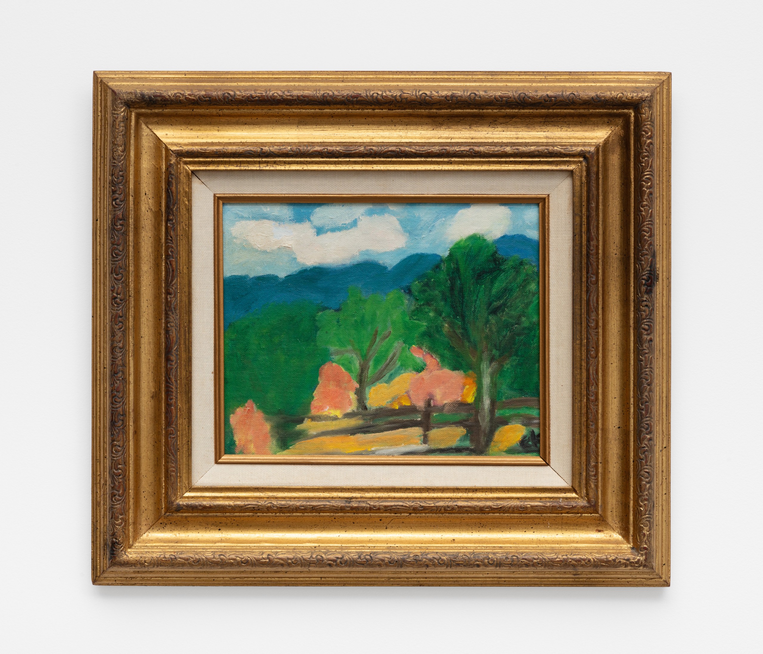 Her small landscape painting, made the year of her death, sits by a window in the room I grew up in, and also pulls heavily from abstraction. A cloud-filled sky reminiscent of Marsden Hartley sits atop a foliage-filled scene below. Large blocks of color depicting masses of land and mountains butt up against trees that become vaguer, eventually turning into peach colored bushes rooted in a yellow ground. The painting shows the fun of making an abstraction work as a landscape, and vice versa.