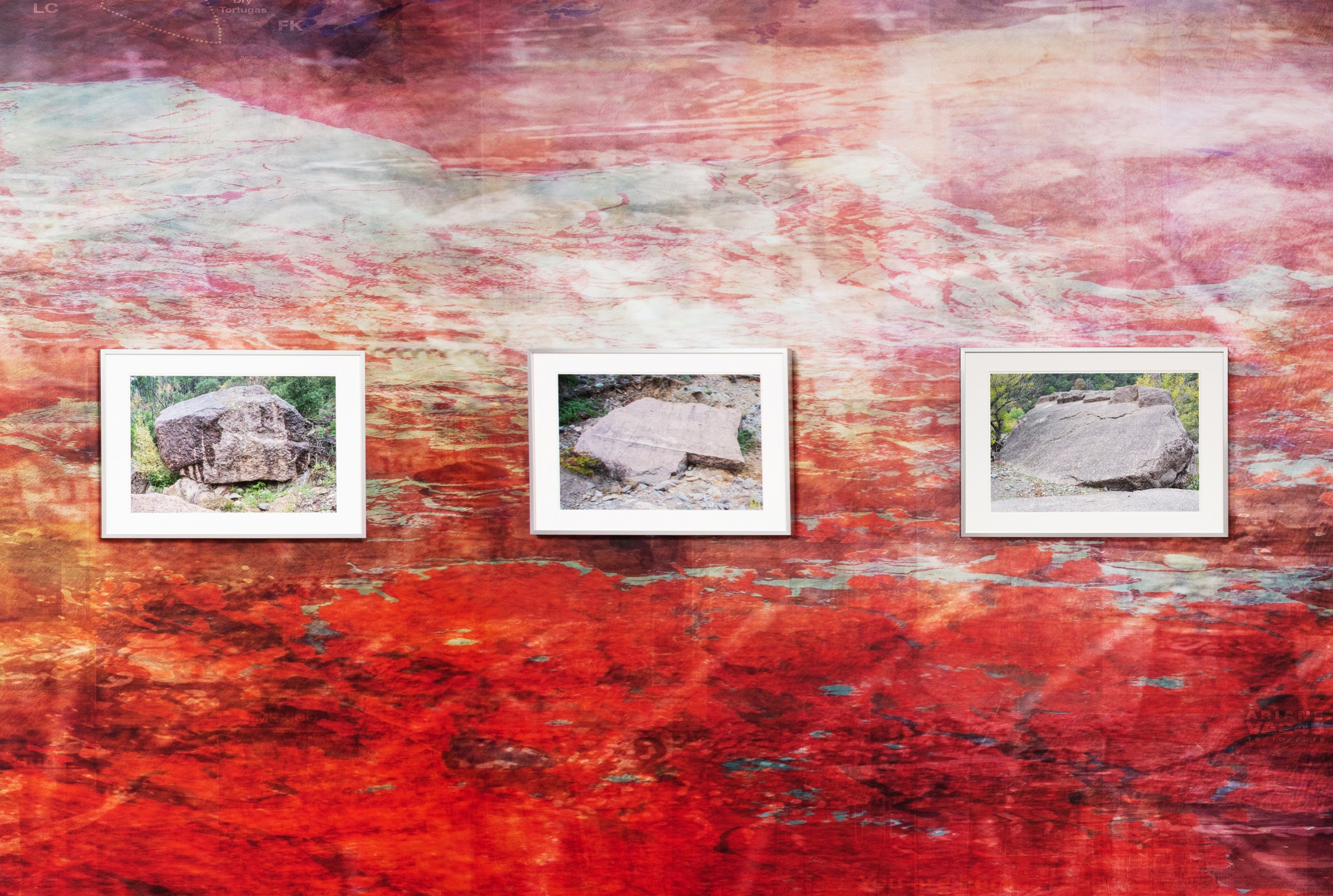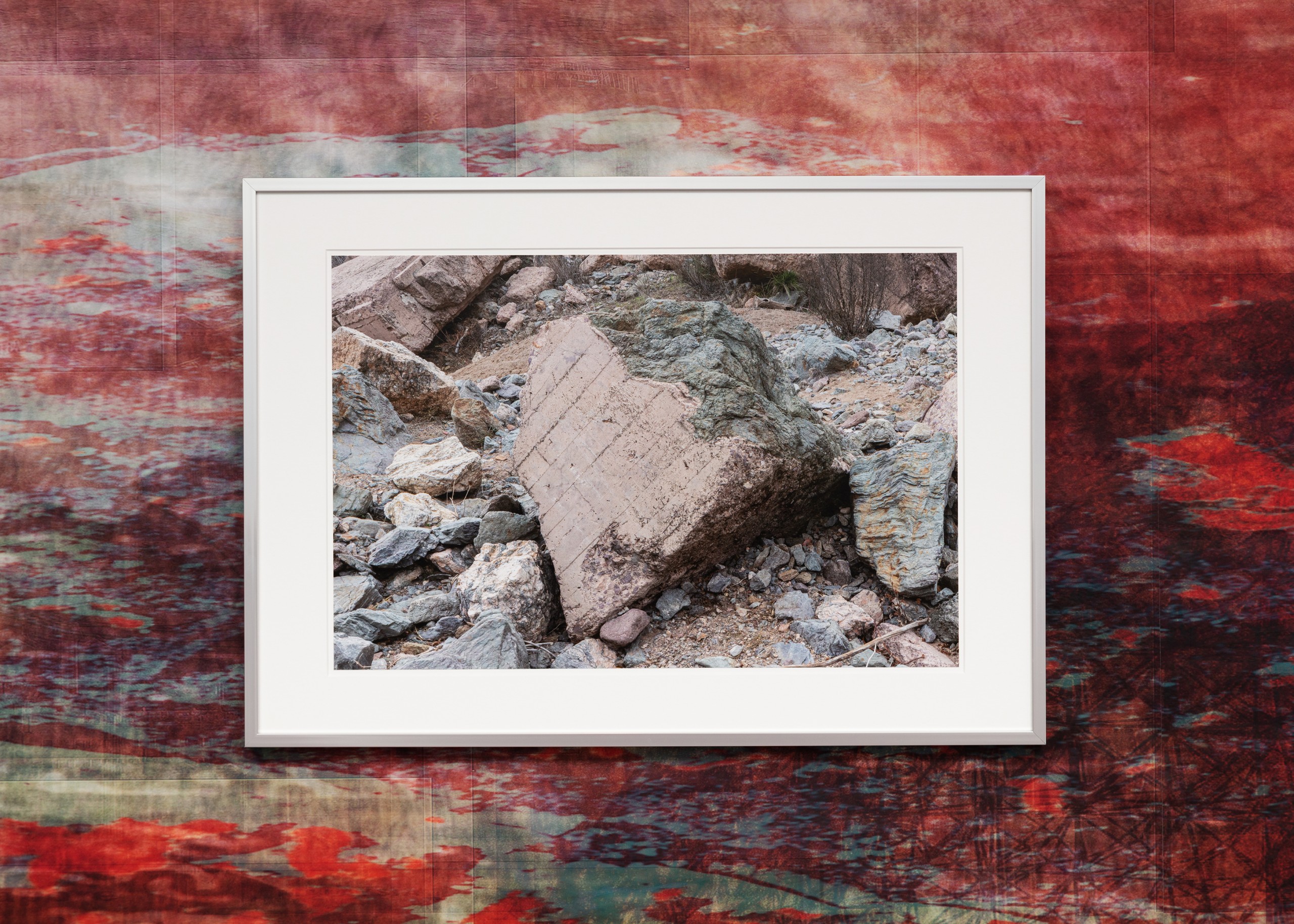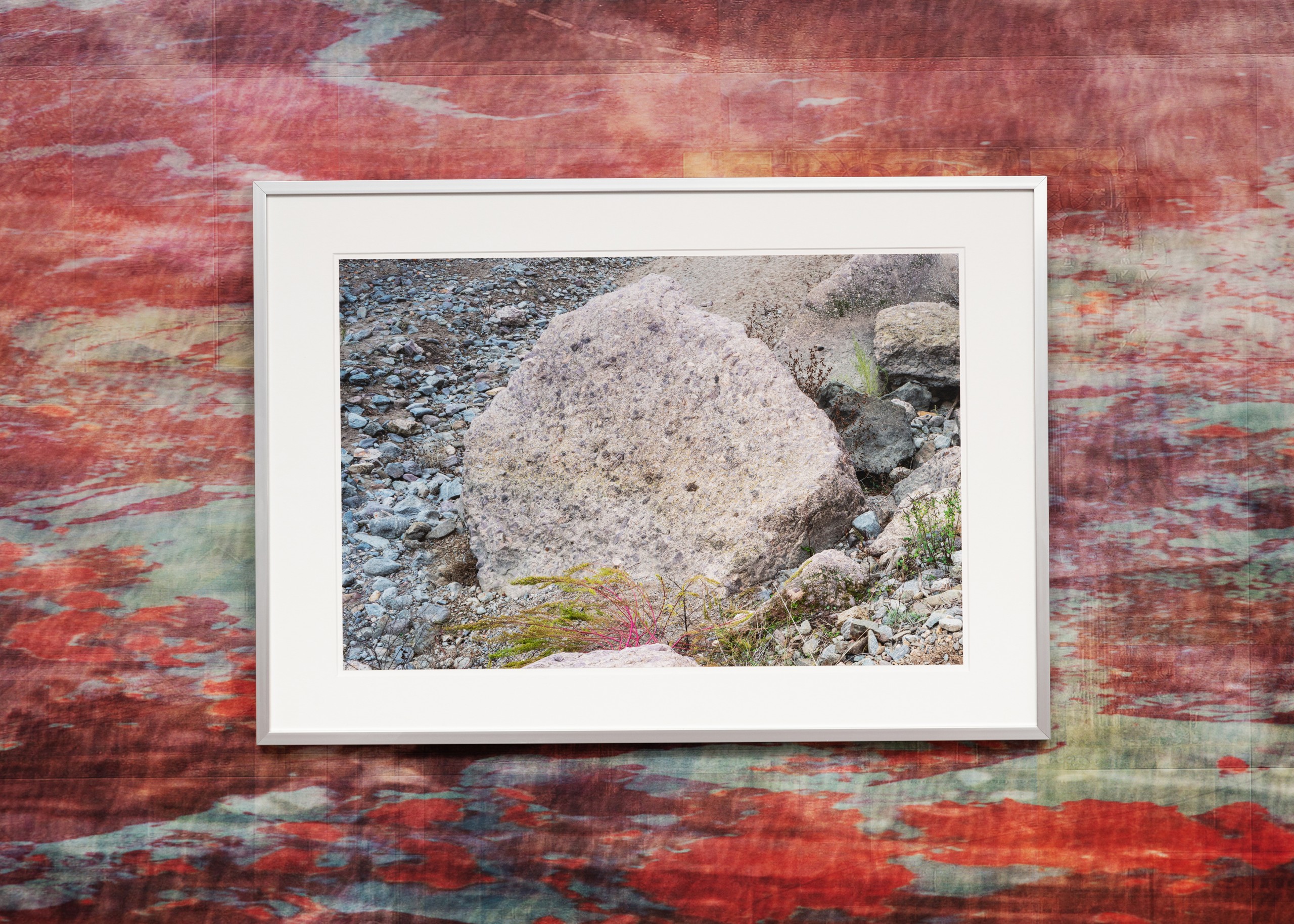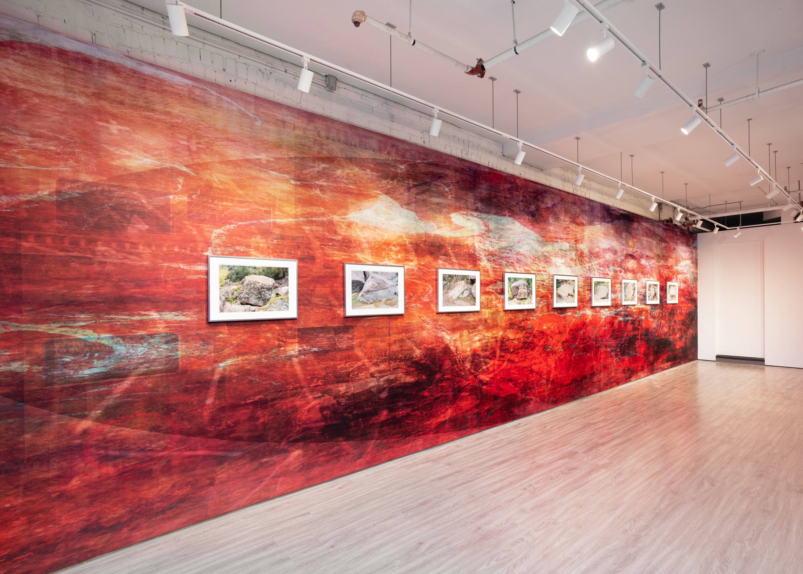 Sitting atop the mural’s sea of red are images from another series, titled Concrete Atlantis (2022). The Malpasset Dam on the Côte d’Azur collapsed on December 2, 1959, killing hundreds of people in the resulting flood. After the disaster, it was determined that a tectonic fault in the rock base underneath the dam had caused the collapse, potentially the result of a faulty geological survey. After the calamitous accident and the ensuing flood, the concrete structure of the dam no longer blocked the view along the river. However, Shim-Sutcliffe’s photographs of the dam’s remains deny viewers a glimpse of any such vista, lingering instead on torn concrete and exposed re-bar, evidence of the destruction caused by the dam and its trespass on the landscape.