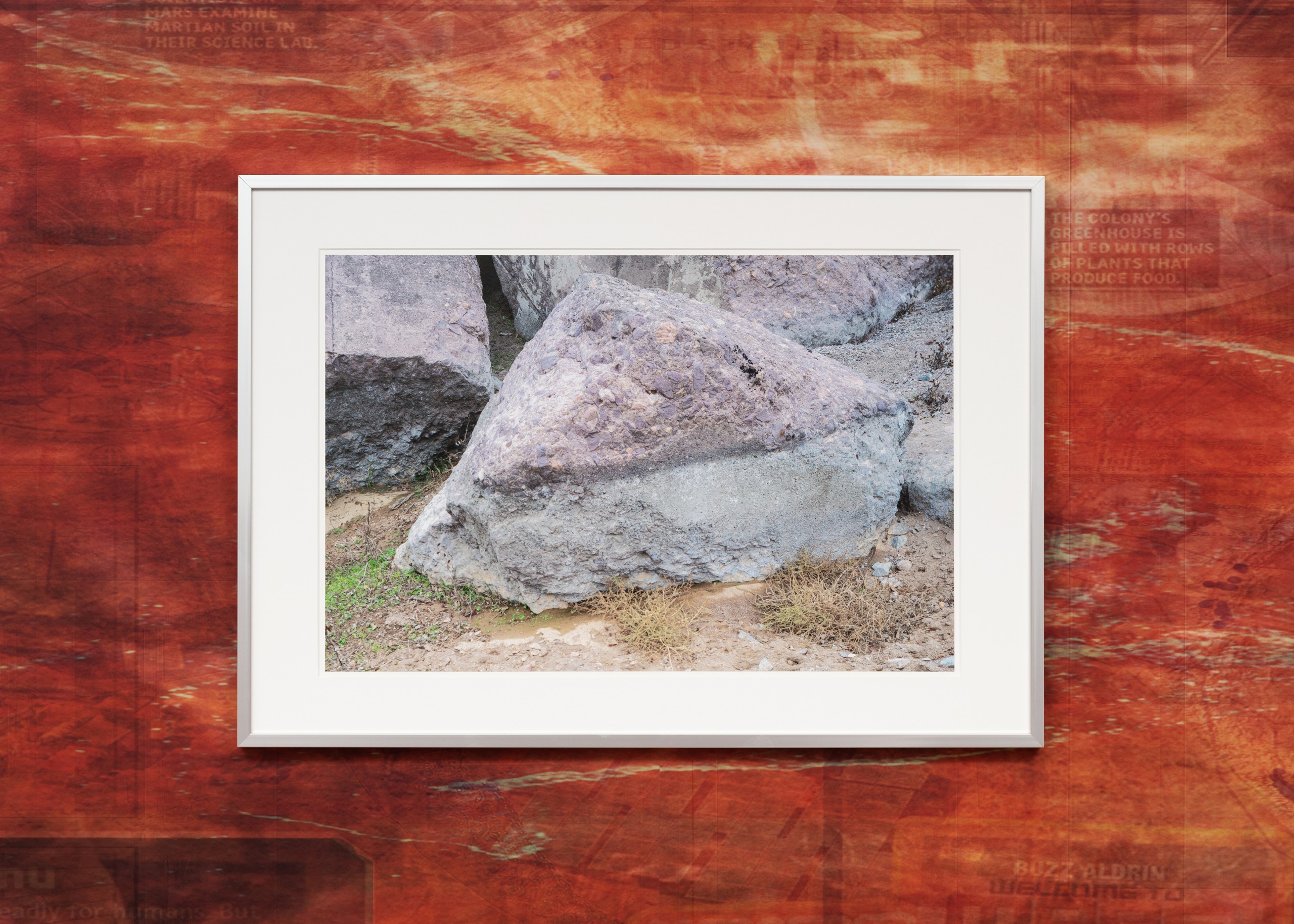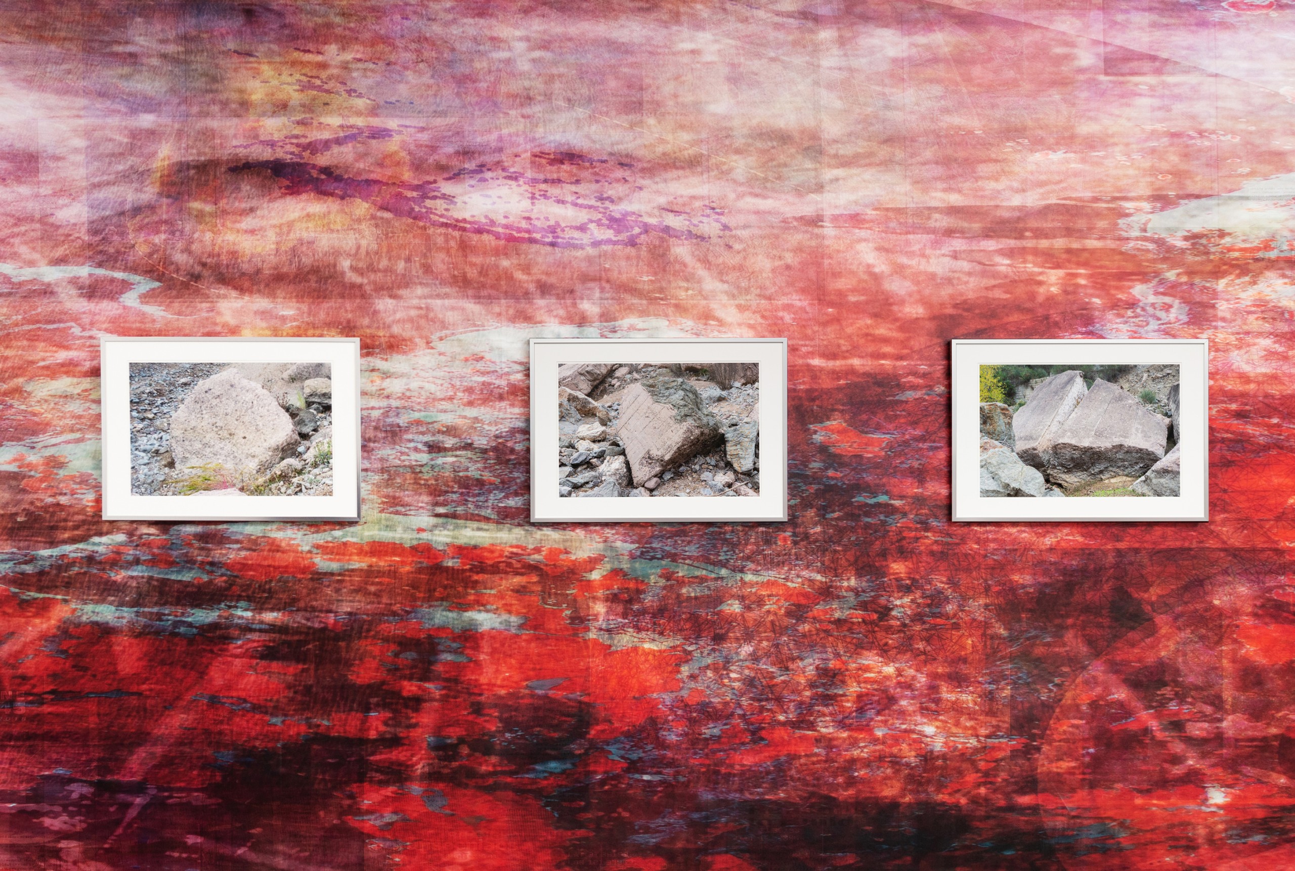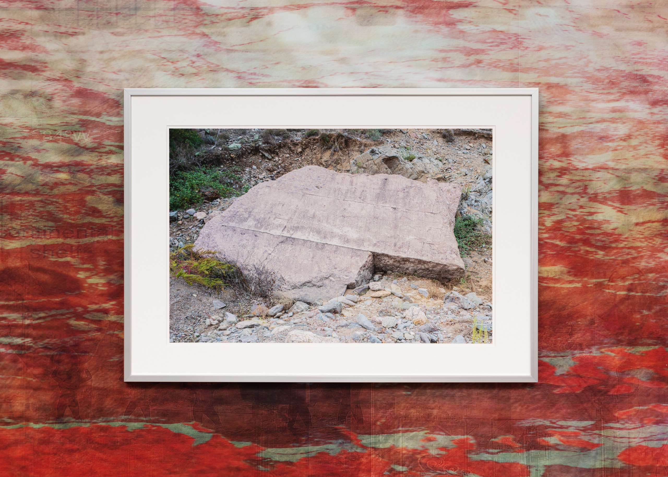 Sitting atop the mural’s sea of red are images from another series, titled Concrete Atlantis (2022). The Malpasset Dam on the Côte d’Azur collapsed on December 2, 1959, killing hundreds of people in the resulting flood. After the disaster, it was determined that a tectonic fault in the rock base underneath the dam had caused the collapse, potentially the result of a faulty geological survey. After the calamitous accident and the ensuing flood, the concrete structure of the dam no longer blocked the view along the river. However, Shim-Sutcliffe’s photographs of the dam’s remains deny viewers a glimpse of any such vista, lingering instead on torn concrete and exposed re-bar, evidence of the destruction caused by the dam and its trespass on the landscape.