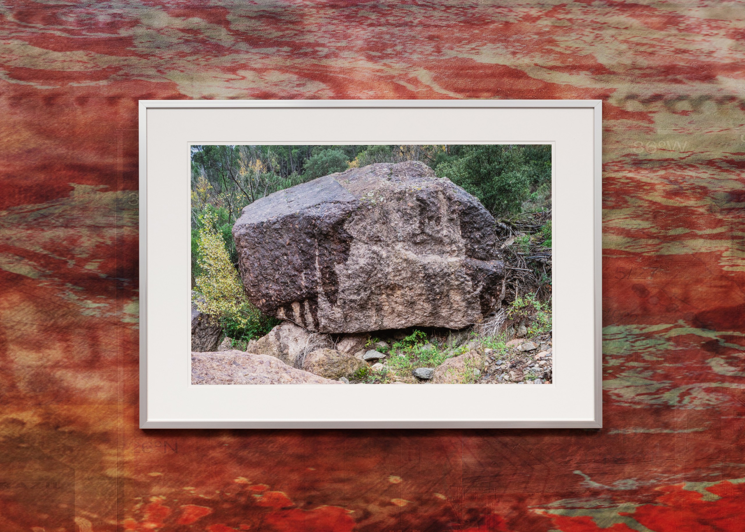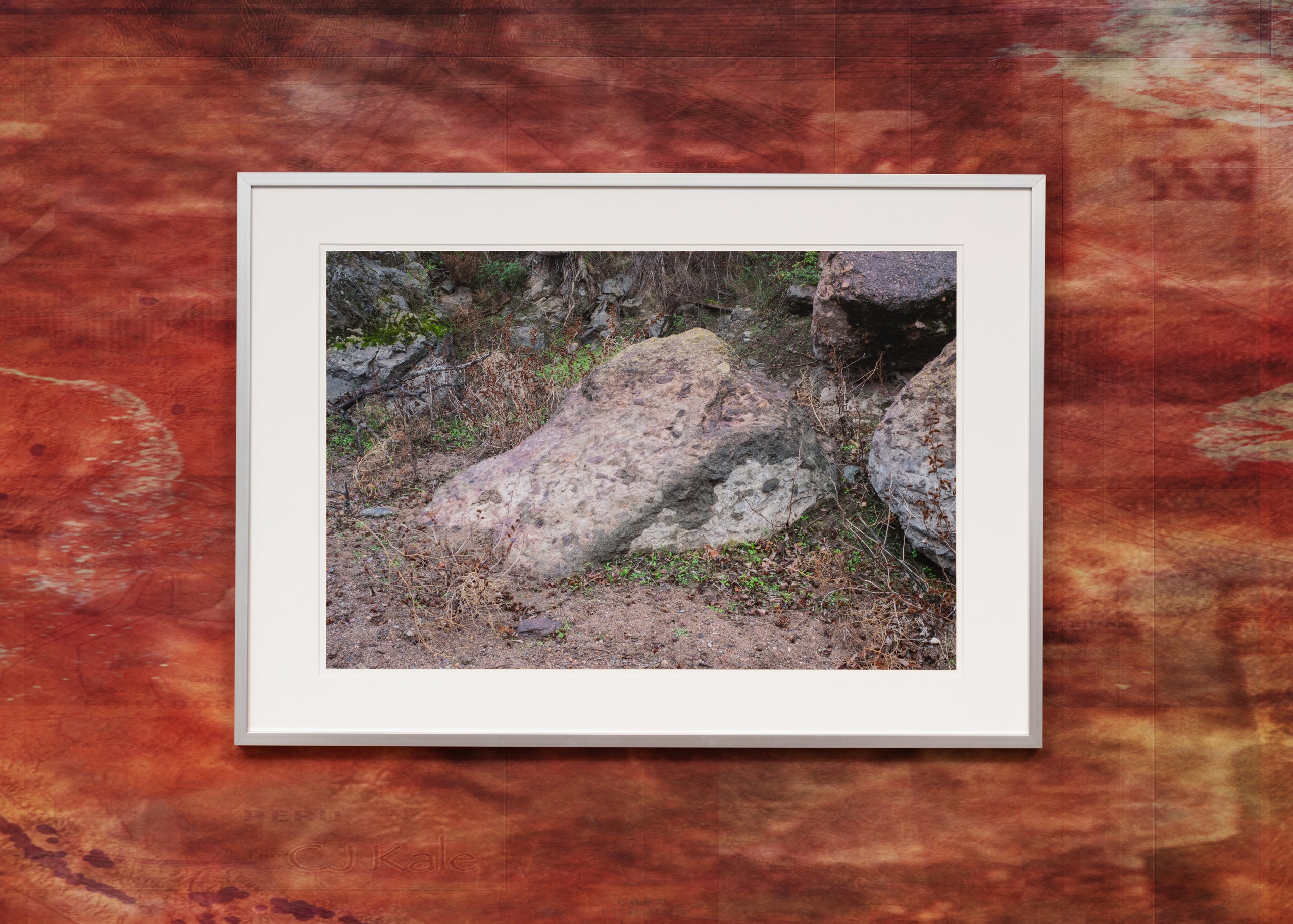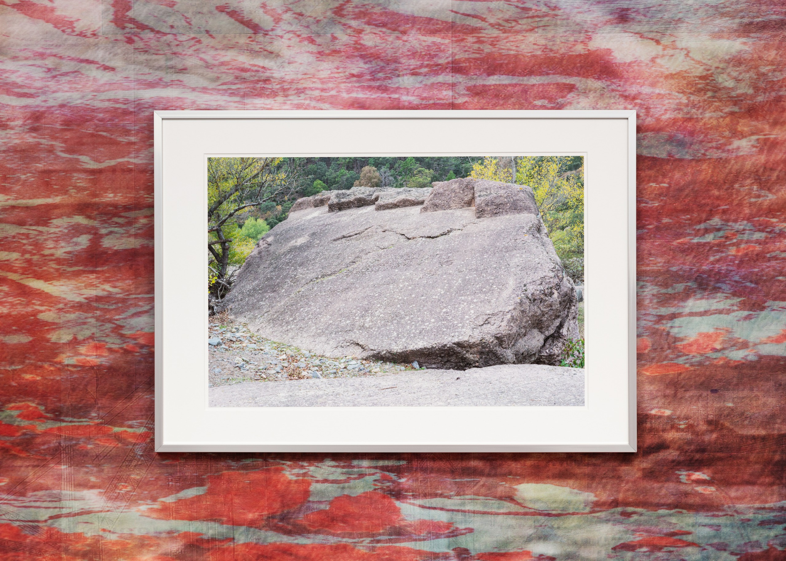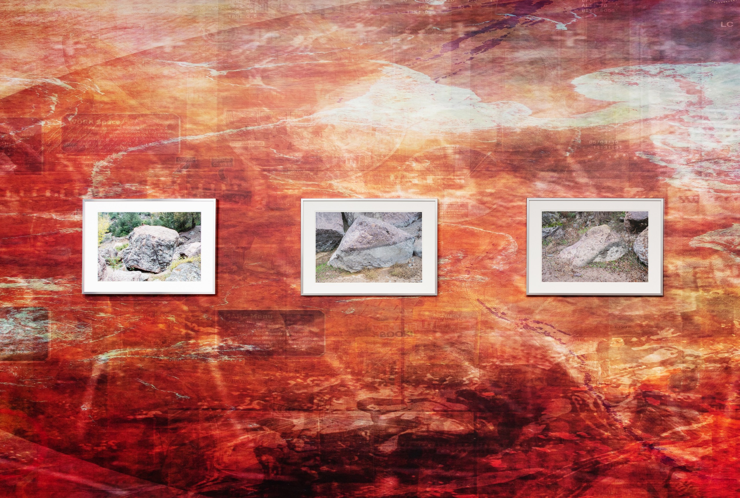 Sitting atop the mural’s sea of red are images from another series, titled Concrete Atlantis (2022). The Malpasset Dam on the Côte d’Azur collapsed on December 2, 1959, killing hundreds of people in the resulting flood. After the disaster, it was determined that a tectonic fault in the rock base underneath the dam had caused the collapse, potentially the result of a faulty geological survey. After the calamitous accident and the ensuing flood, the concrete structure of the dam no longer blocked the view along the river. However, Shim-Sutcliffe’s photographs of the dam’s remains deny viewers a glimpse of any such vista, lingering instead on torn concrete and exposed re-bar, evidence of the destruction caused by the dam and its trespass on the landscape.