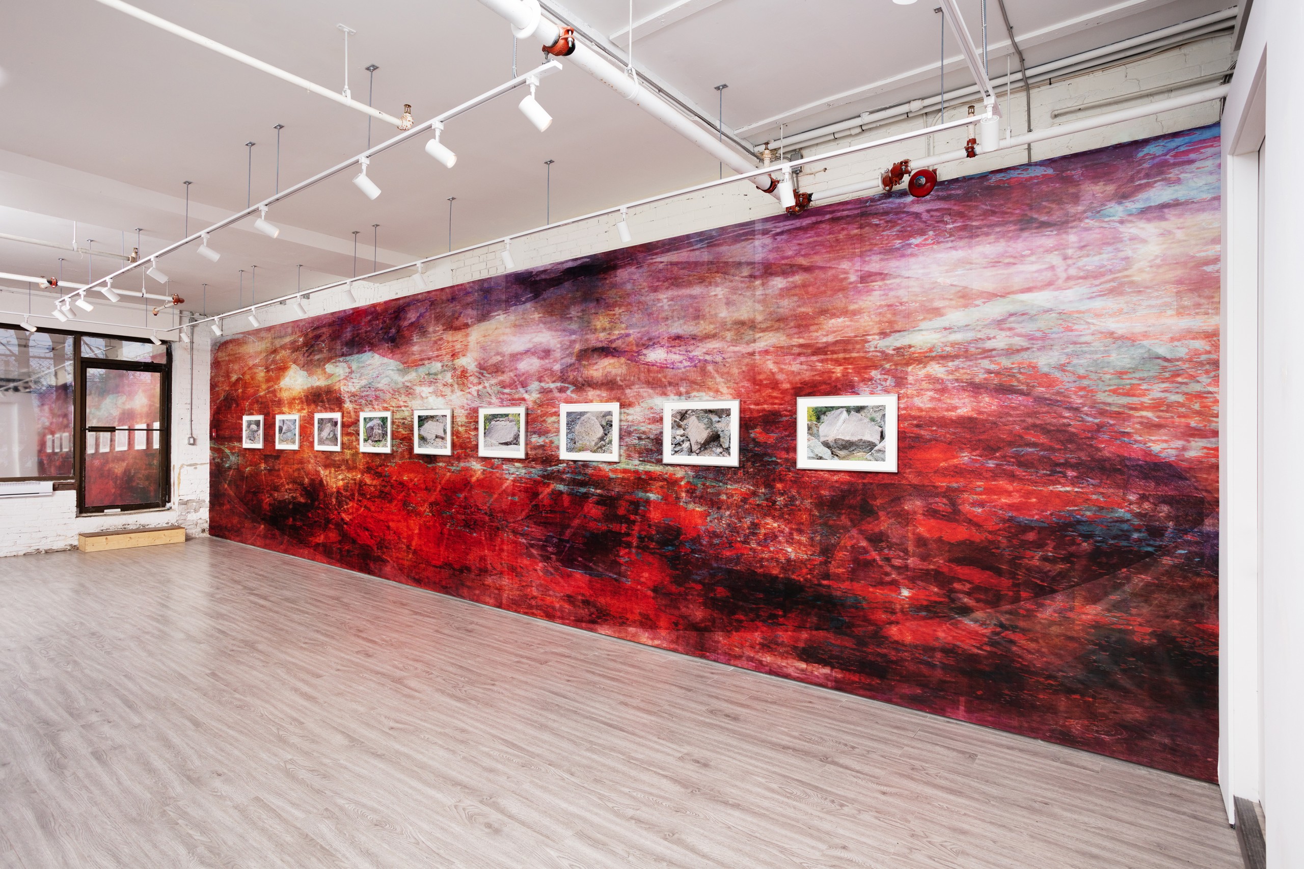 Simon Shim-Sutcliffe’s The Machine Eclipsed by the Station presents a new installation by the Canadian artist based in Frankfurt am Main, Germany. The exhibition space features a large, red, psychedelic mural overlaid with framed photographs of concrete remnants from the ruins of the Malpasset Dam. Together, the works trawl the images and objects that have facilitated economies of extraction, past and present, metonymically mimicking the infrastructures of capital.