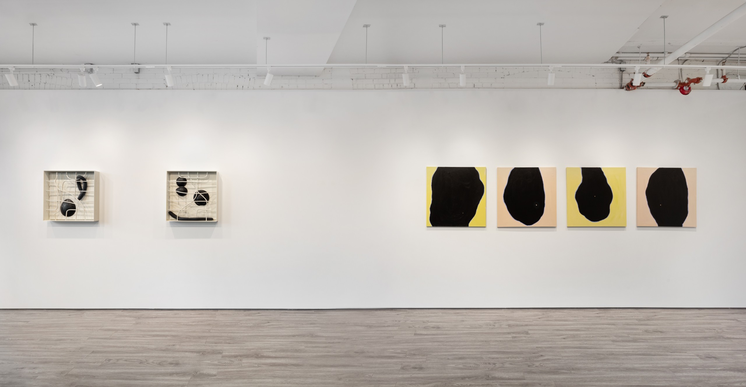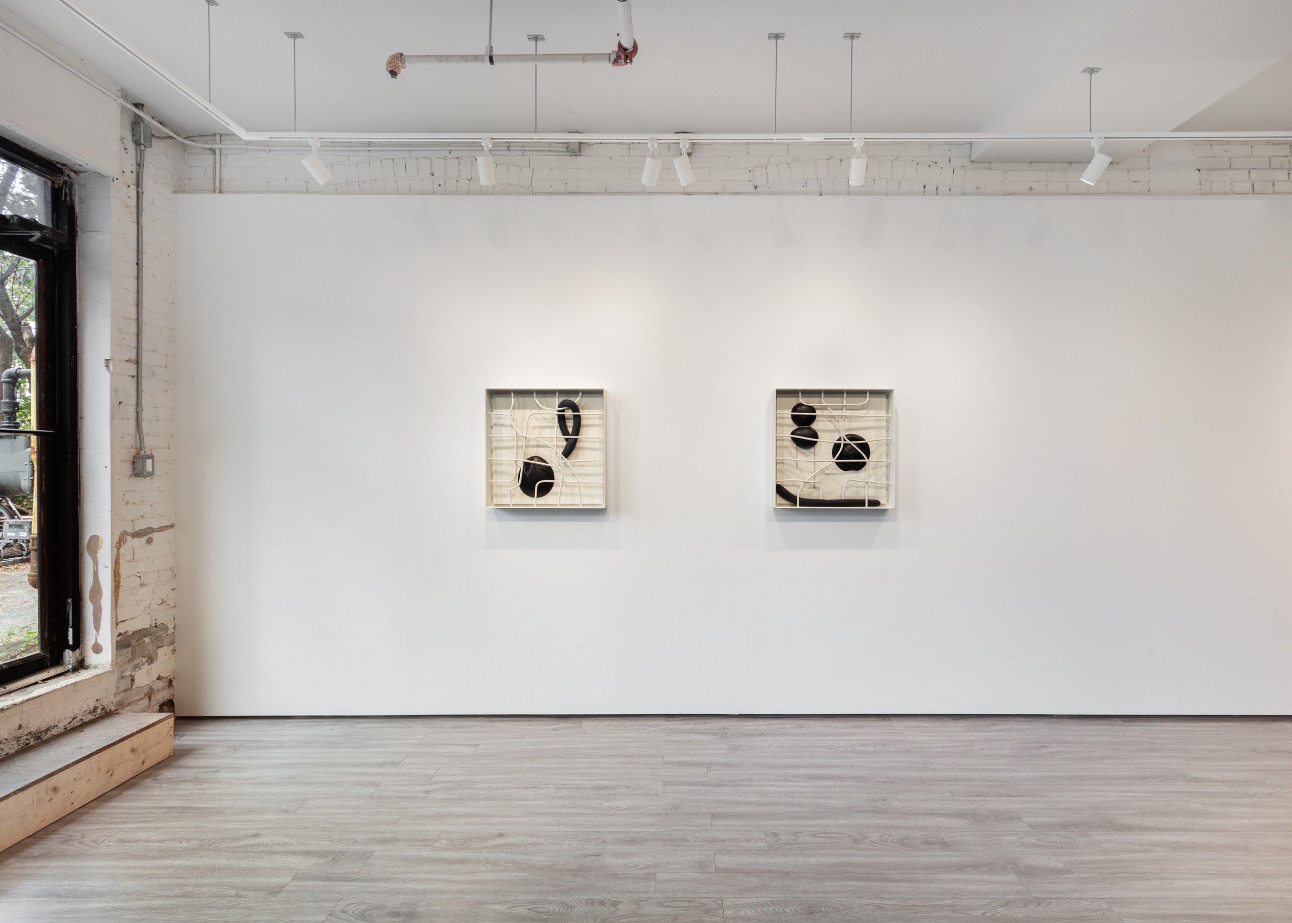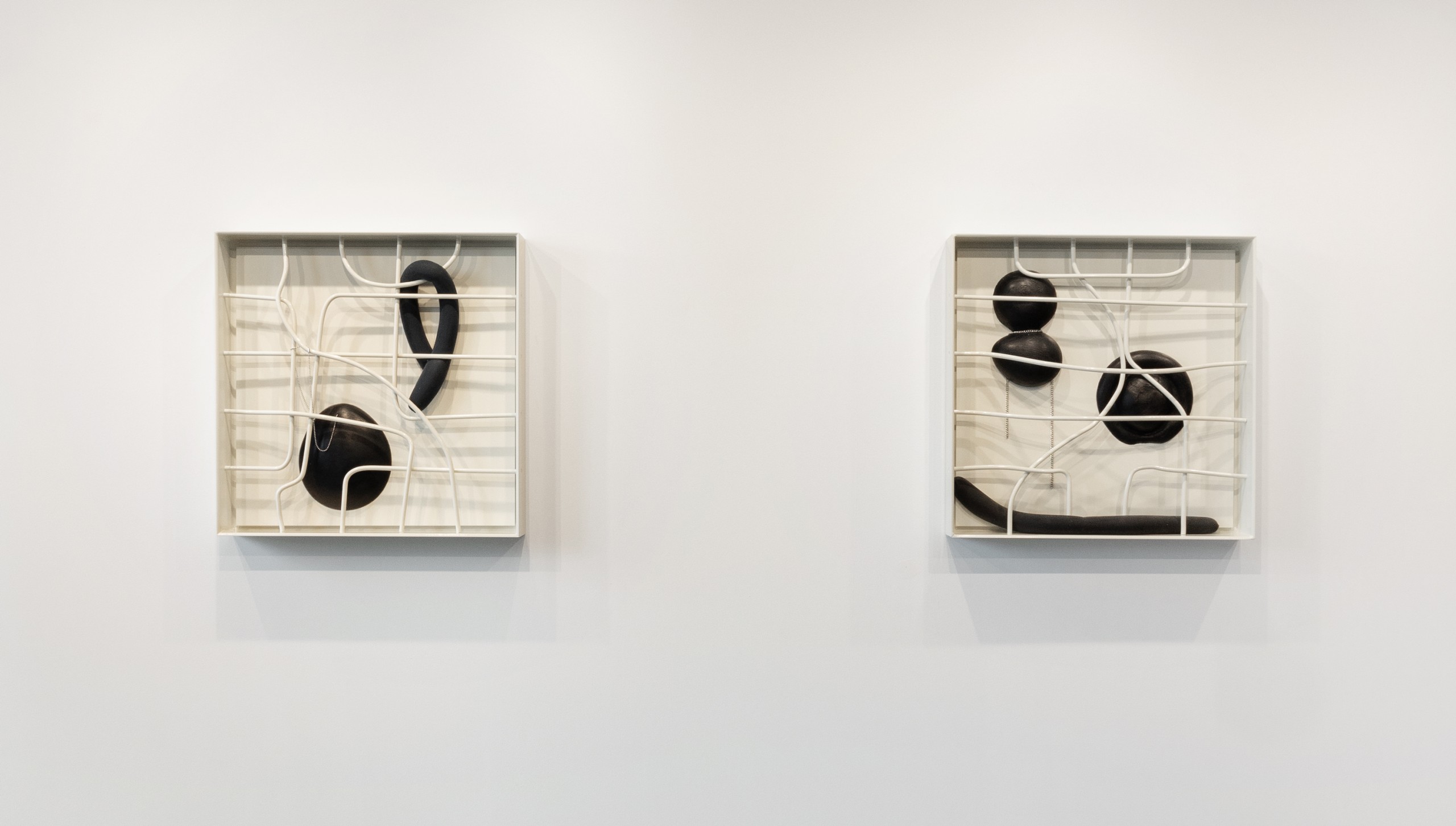 Three metal sculptures hang on a wall accompanied by four paintings. The works hold empty space, voids that can be filled with experience, memories or grief. Absence is of course about loss, not only for what is missing, but also a longing for what could have been. An unknowable future of endless possibilities.