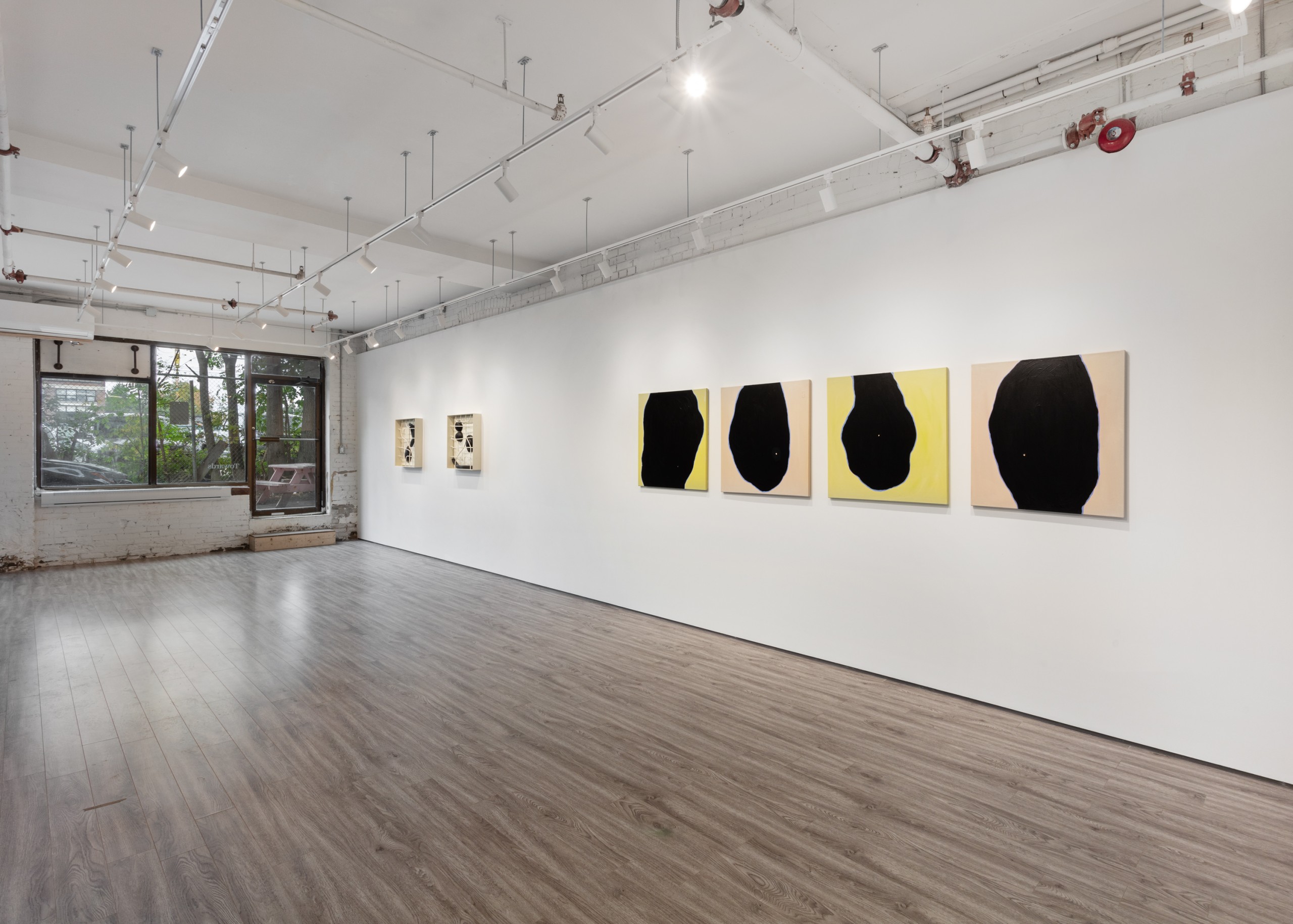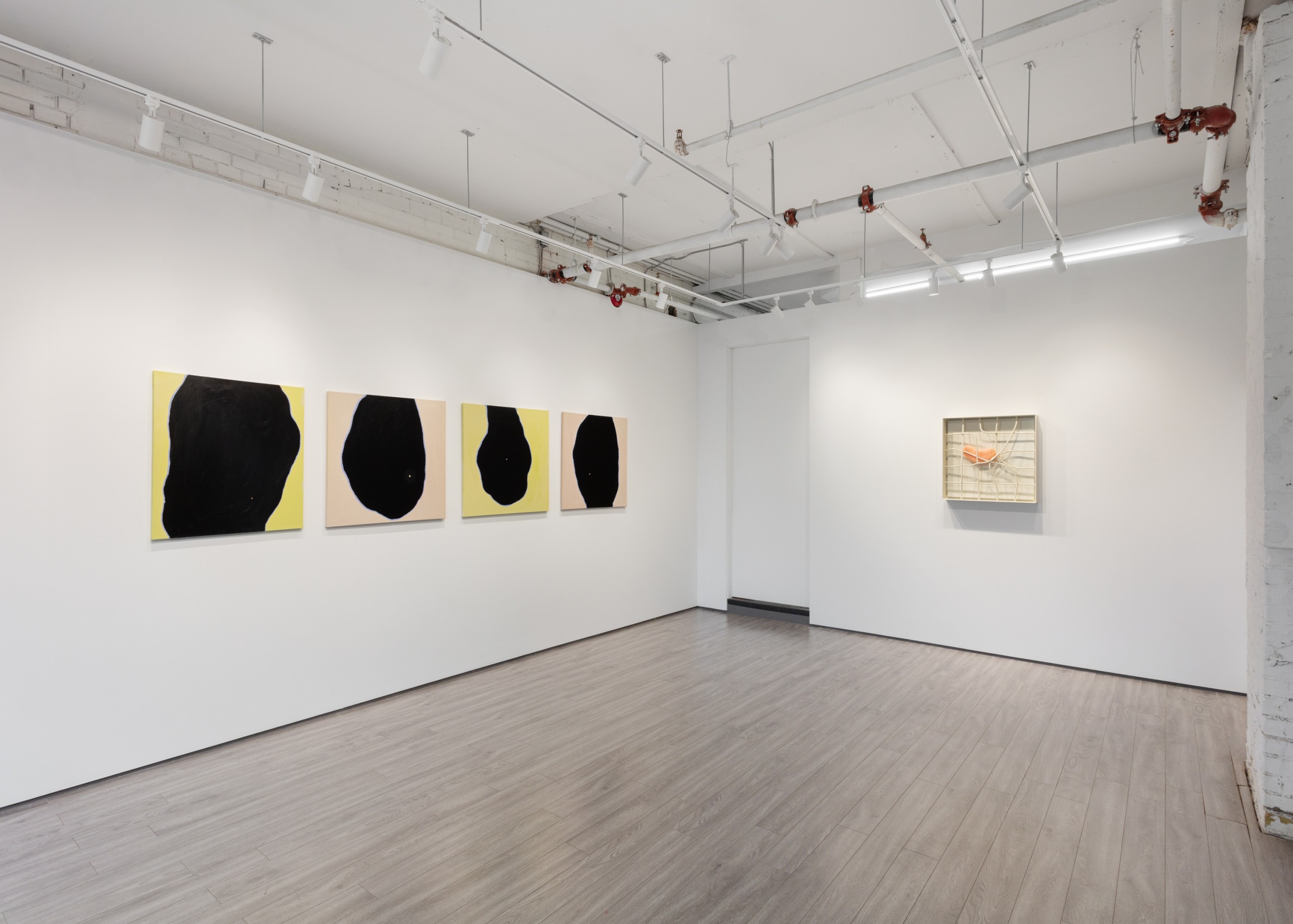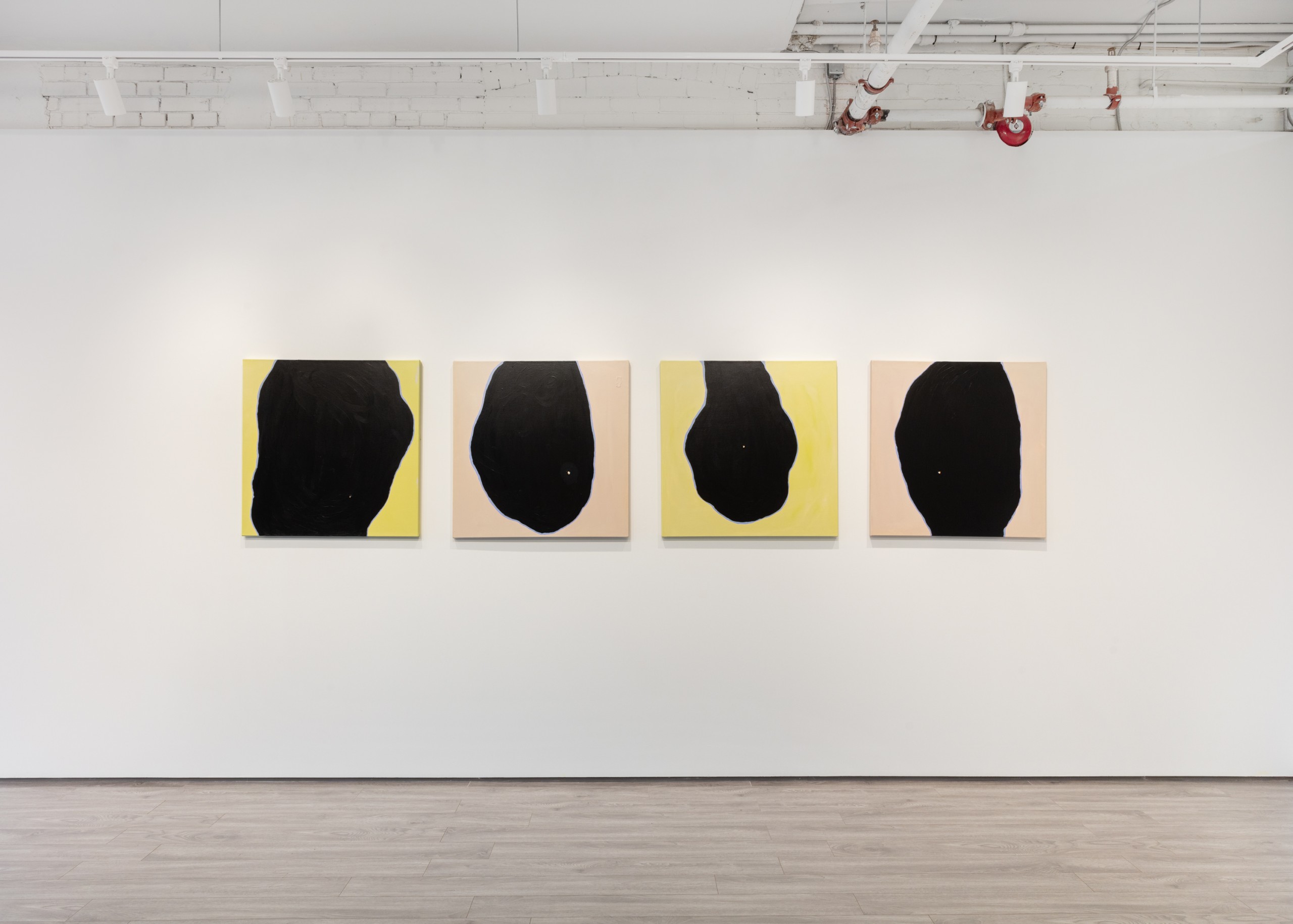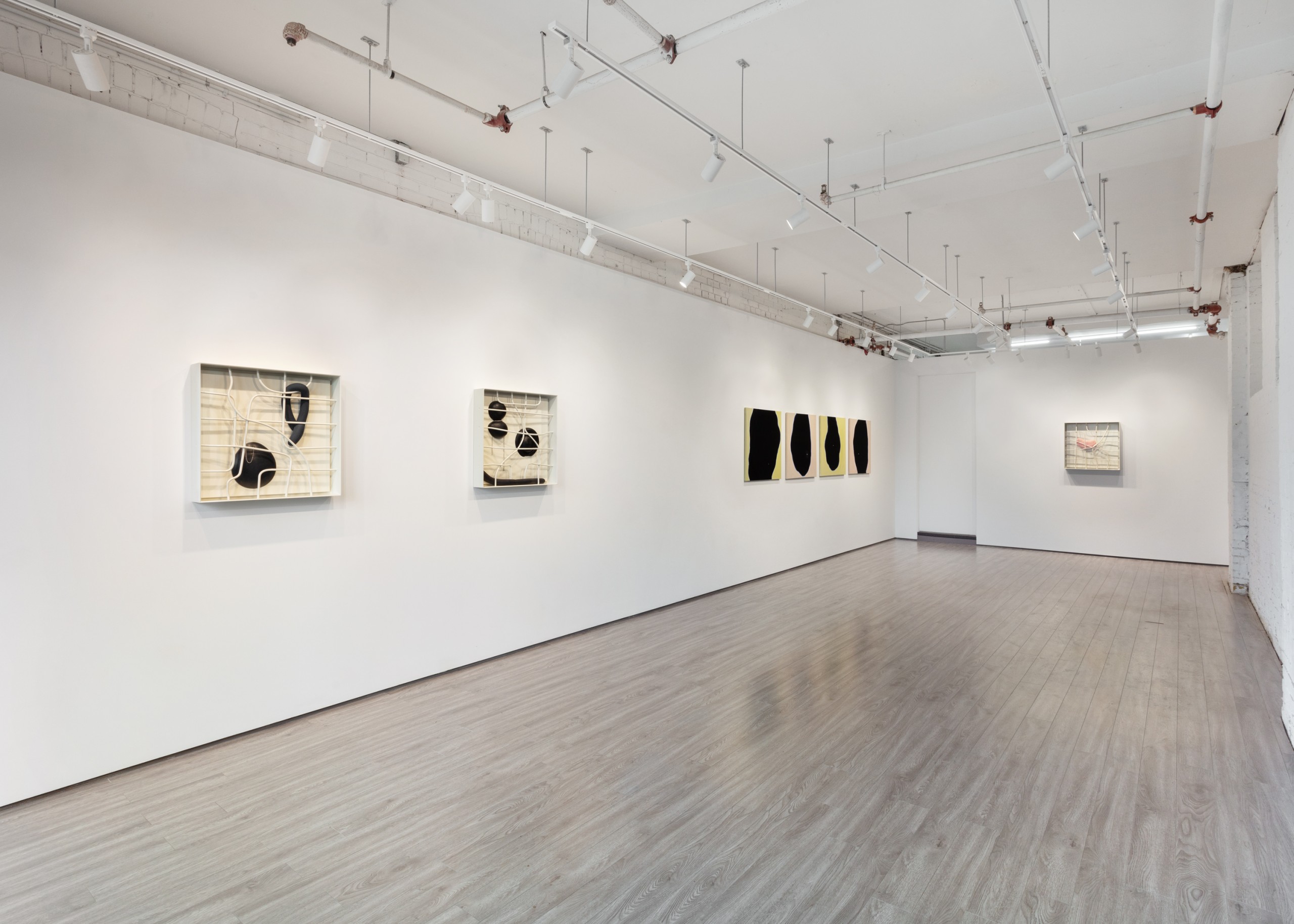 Three metal sculptures hang on a wall accompanied by four paintings. The works hold empty space, voids that can be filled with experience, memories or grief. Absence is of course about loss, not only for what is missing, but also a longing for what could have been. An unknowable future of endless possibilities.