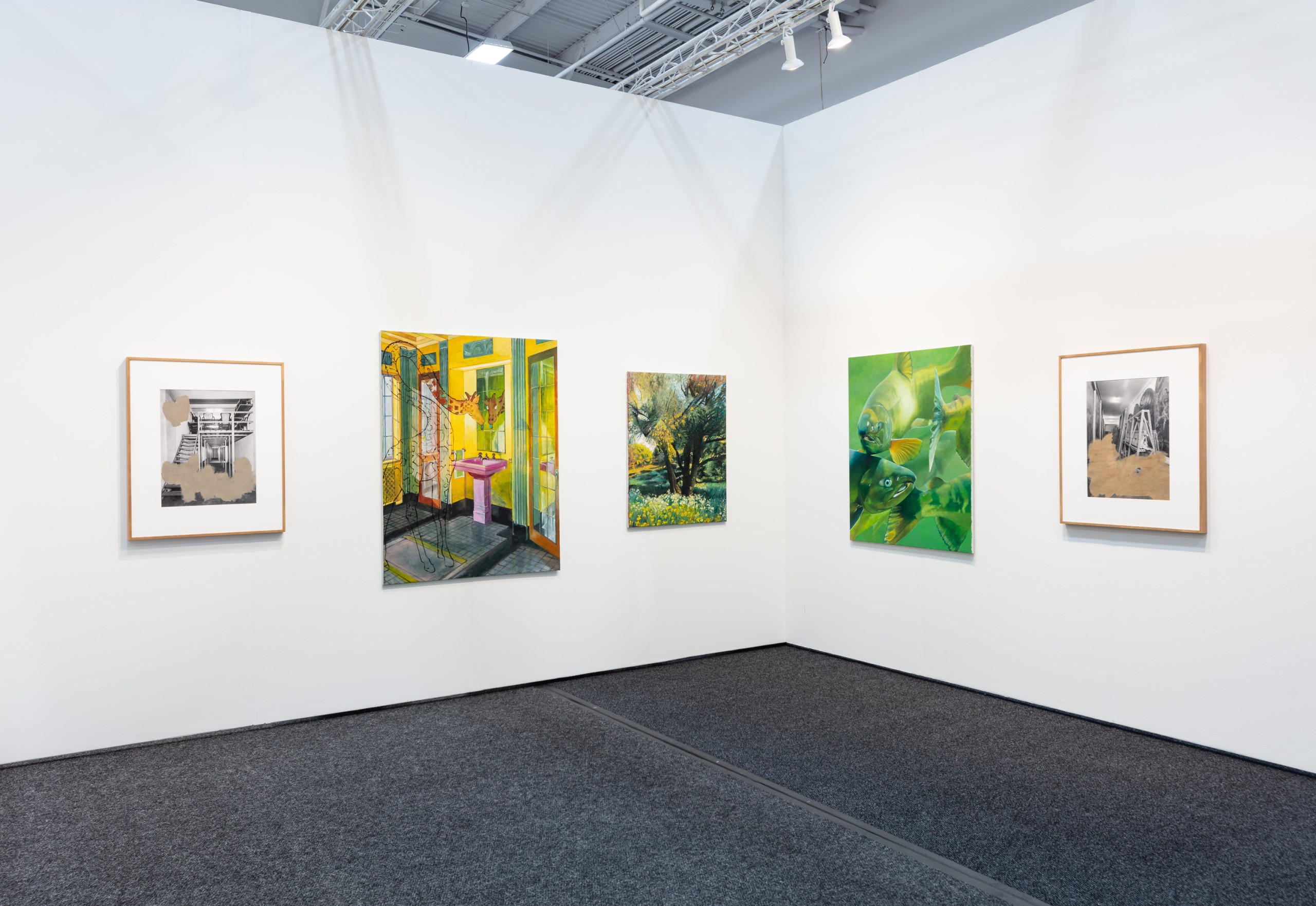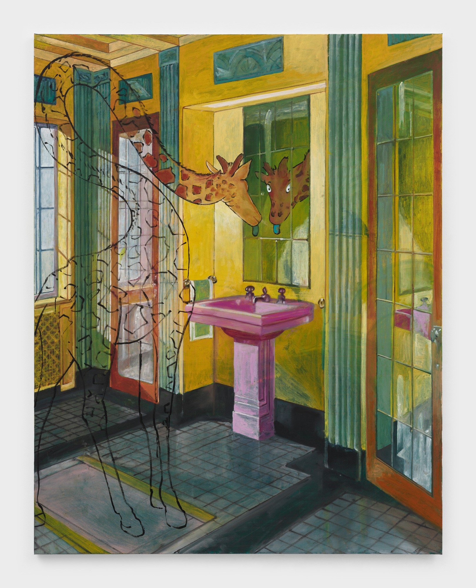 In Interior, portrait, Unrau ventures from the earnest and sincere, into the comical and the absurd. A well-appointed bathroom is thrown off by a large giraffe gazing incredulously at itself in the mirror. While the bathroom and Giraffe’s head are fully realized, as you move down the giraffes’ neck, it devolves into a simplistic black outline drawing. While certainly amusing at first glance, upon further reflection, the painting can be read as a commentary on the act of looking, and the potential of self-realization that can only come through careful and considered observation.