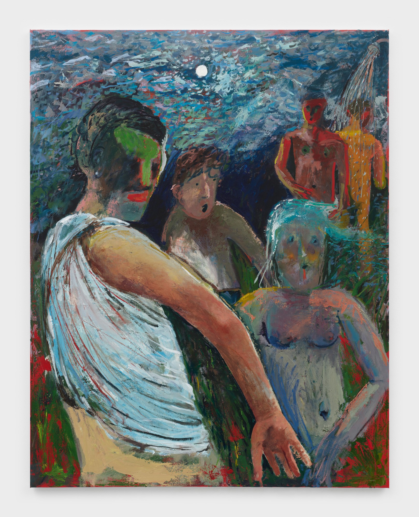Five figures returns Unrau’s focus to art history and significant painters from the past. The piece is a direct tribute to the late Bay-area painter David Park. Unrau references different figures from across Park’s body of work, merging them into a new composition and adding elements of his own in the process. In Unrau’s composition, layers of paint are built up through short staccato-like brush strokes. The figures twist and turn around what appears to be some sort of moonlight gathering. Like many of Unrau’s works however, there is a level of ambiguity to the painting, leaving it up to us, the viewer, to fill in the missing story.