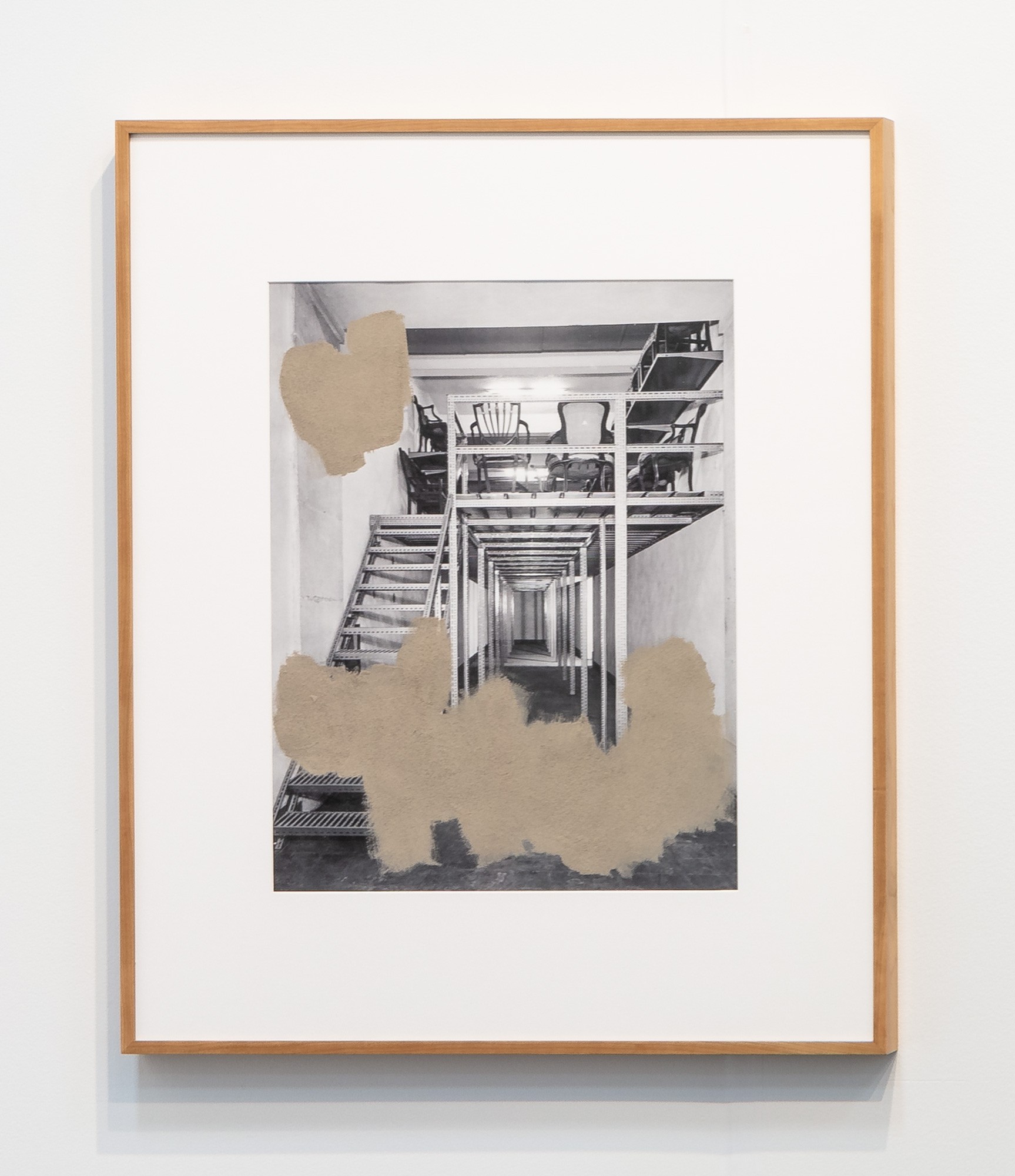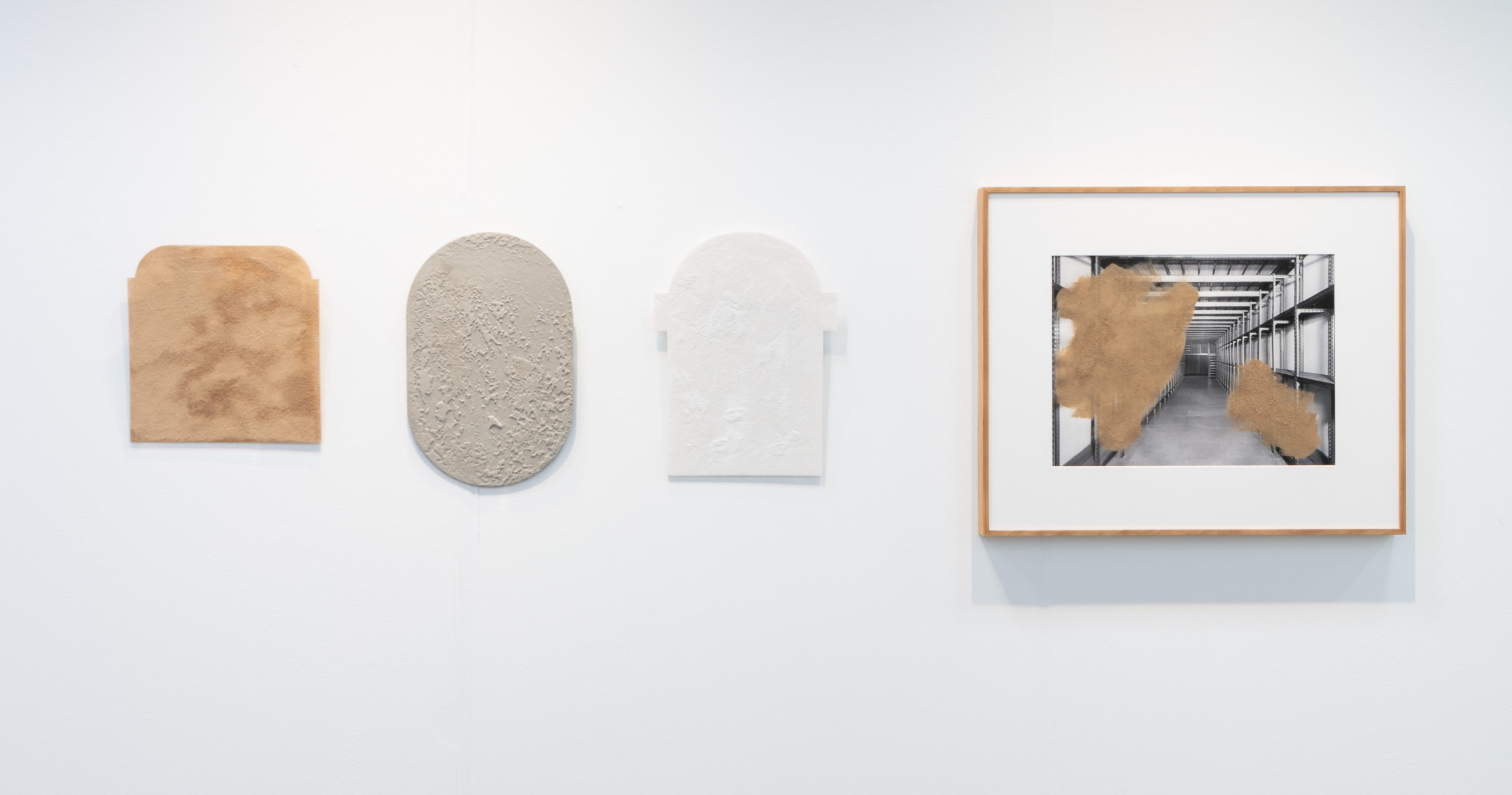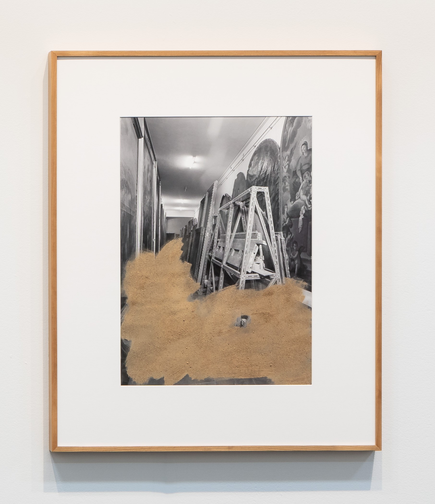 During her time at the museum, Trabulo developed a new body of work titled Collecting Dust. Comprised of both photographic, and sculptural works, the pieces within the series combine physical debris Trabulo has collected from the archives and merges it with historical elements from the museum. The four photographic works on display, are comprised of archival images of the empty vaults, taken during construction in the mid 1960s. Trabulo combines these historical images with particles of dust, wood, and stone that she has collected from the now overflowing storage spaces.