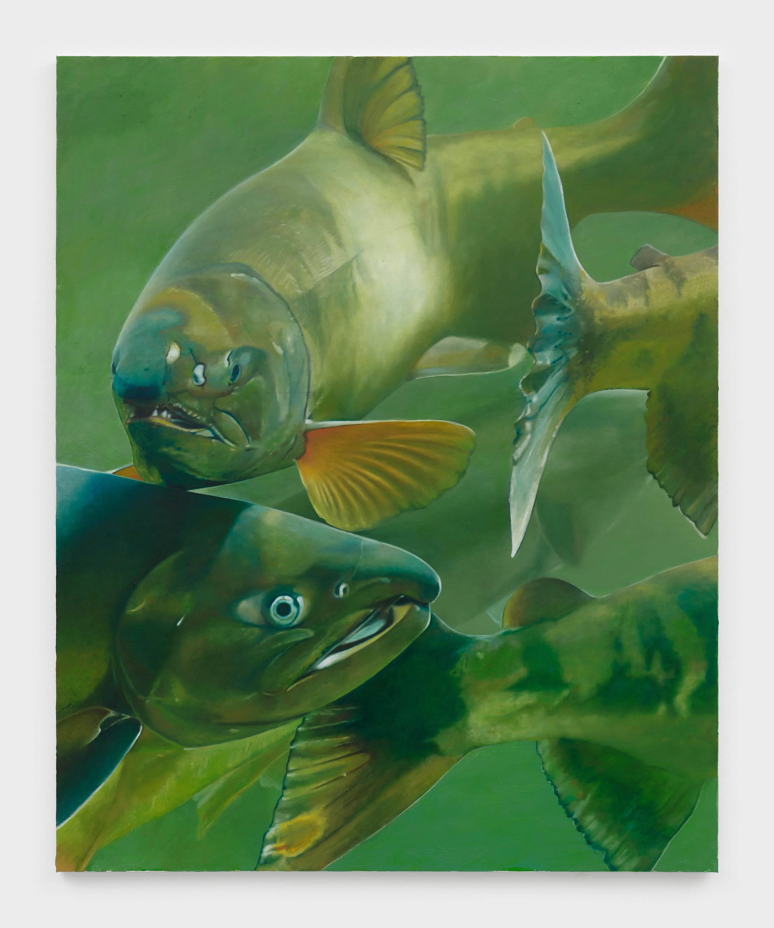 In World Weariness, Unrau turns his attention to the natural world and painstakingly renders an underwater scene of Chinook Salmon. Inspired partly by New Dutch Herring (1982), a seminal work by Dutch artist René Daniëls, Unrau uses this piece as a point of departure, and then formally, works in almost direct opposition to it. While Daniels’s painting is a loose study, with broad swaths of colour and seemingly slapdash brushstrokes that depict a school of Herrings cannibalizing each other, Unrau’s highly detailed, near photographic image of salmon becomes a deeply considered study of light and composition.